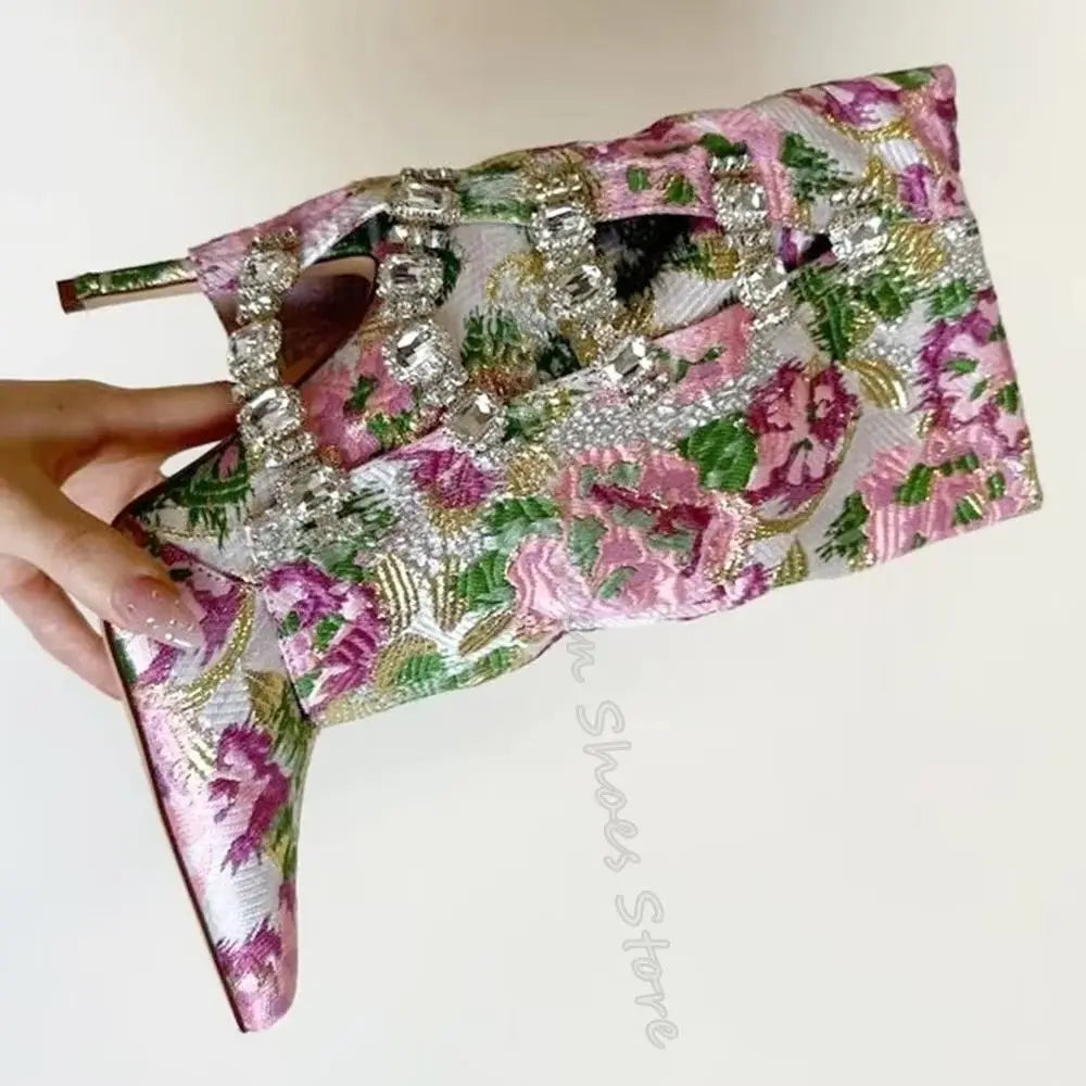 Embroidery Crystal Knee High Boots Glossy Fashion Elegant Luxury Novelty Concise Slip-On Pointed Toe Thin Heels Women Shoes New