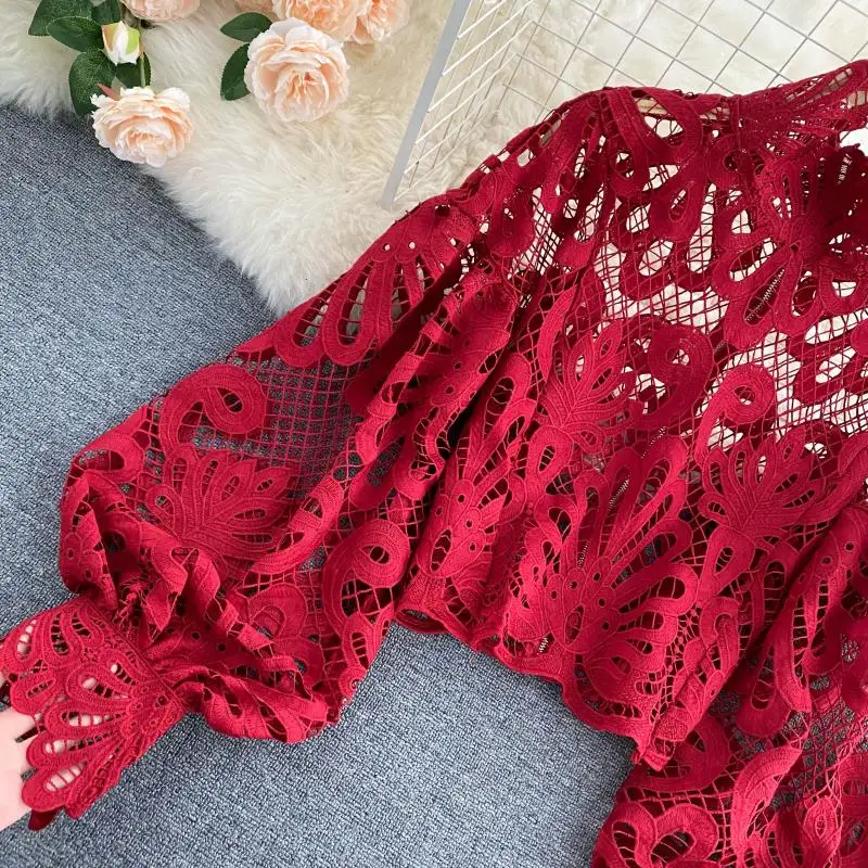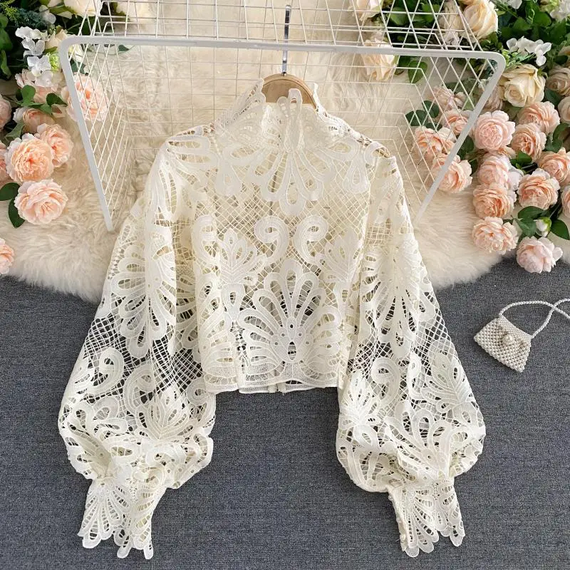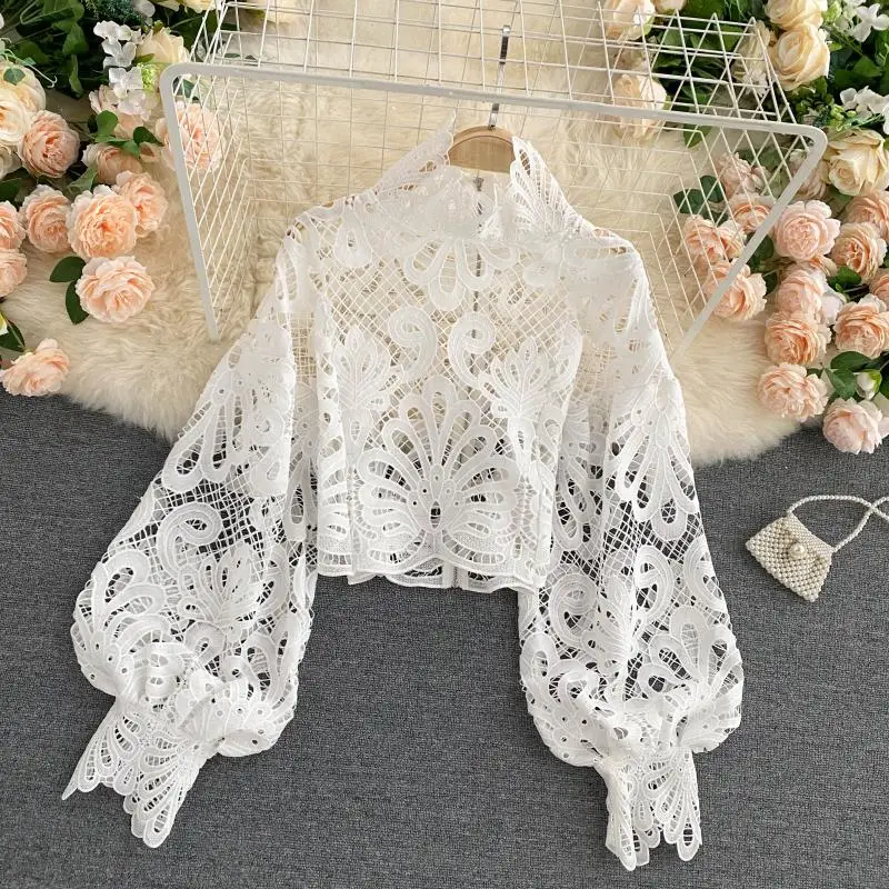 Europe And America New Lace Hollow Out Foreign Style Stand Puff Sleeve Easy Sexy Crop Top Tshirt For Women