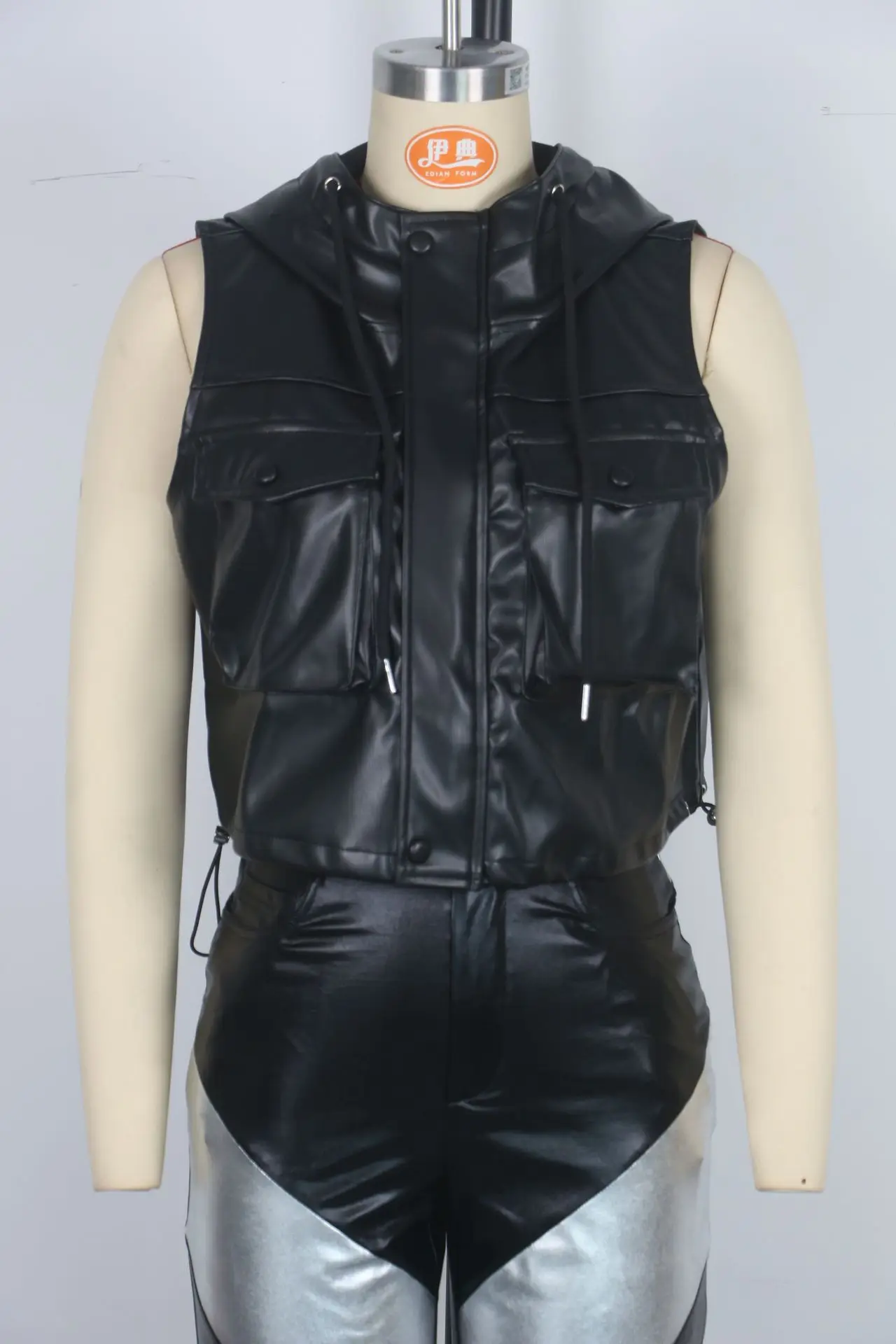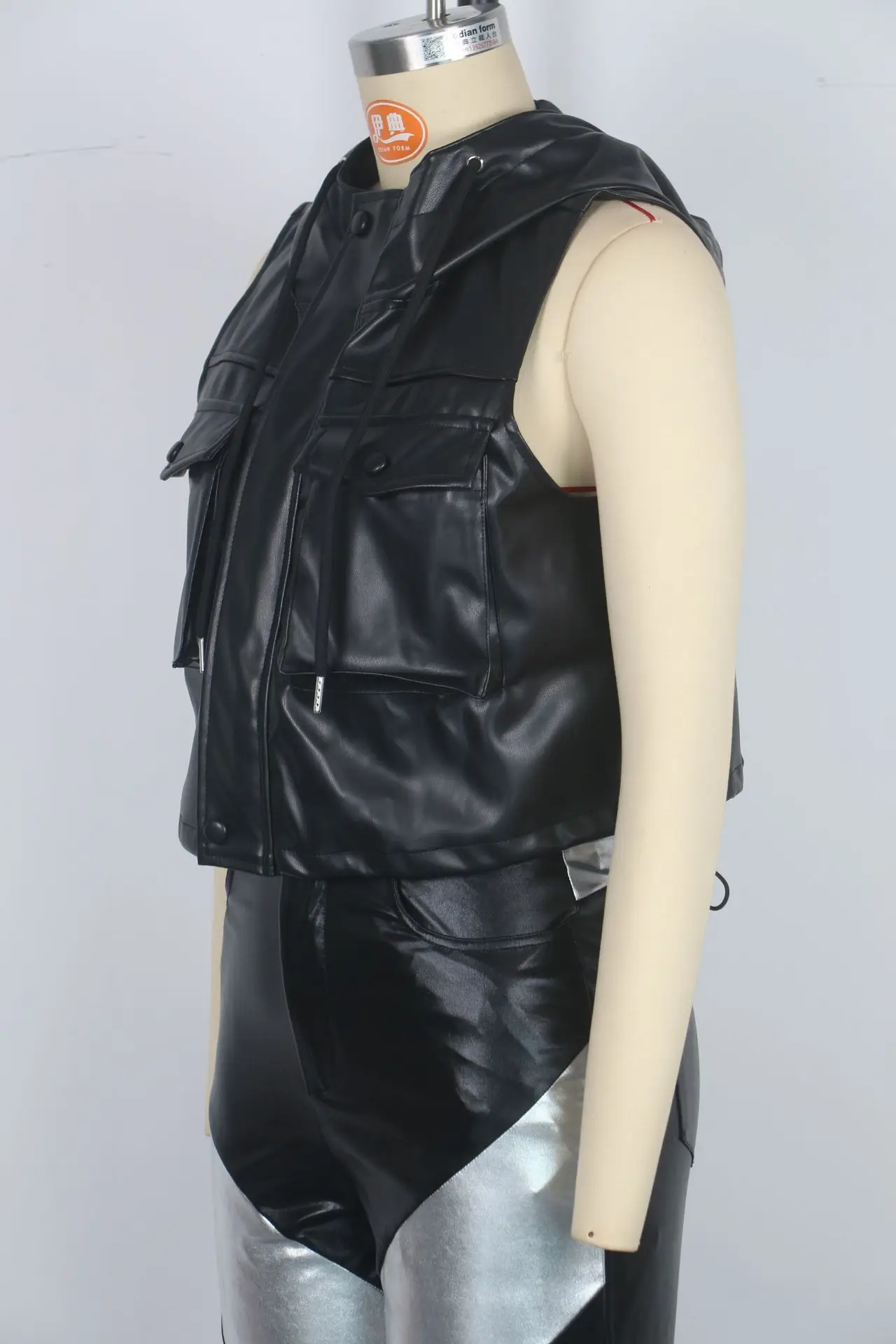 European and American fashion women's draw rope with hat three-dimensional pocket zipper PU leather vest for women
