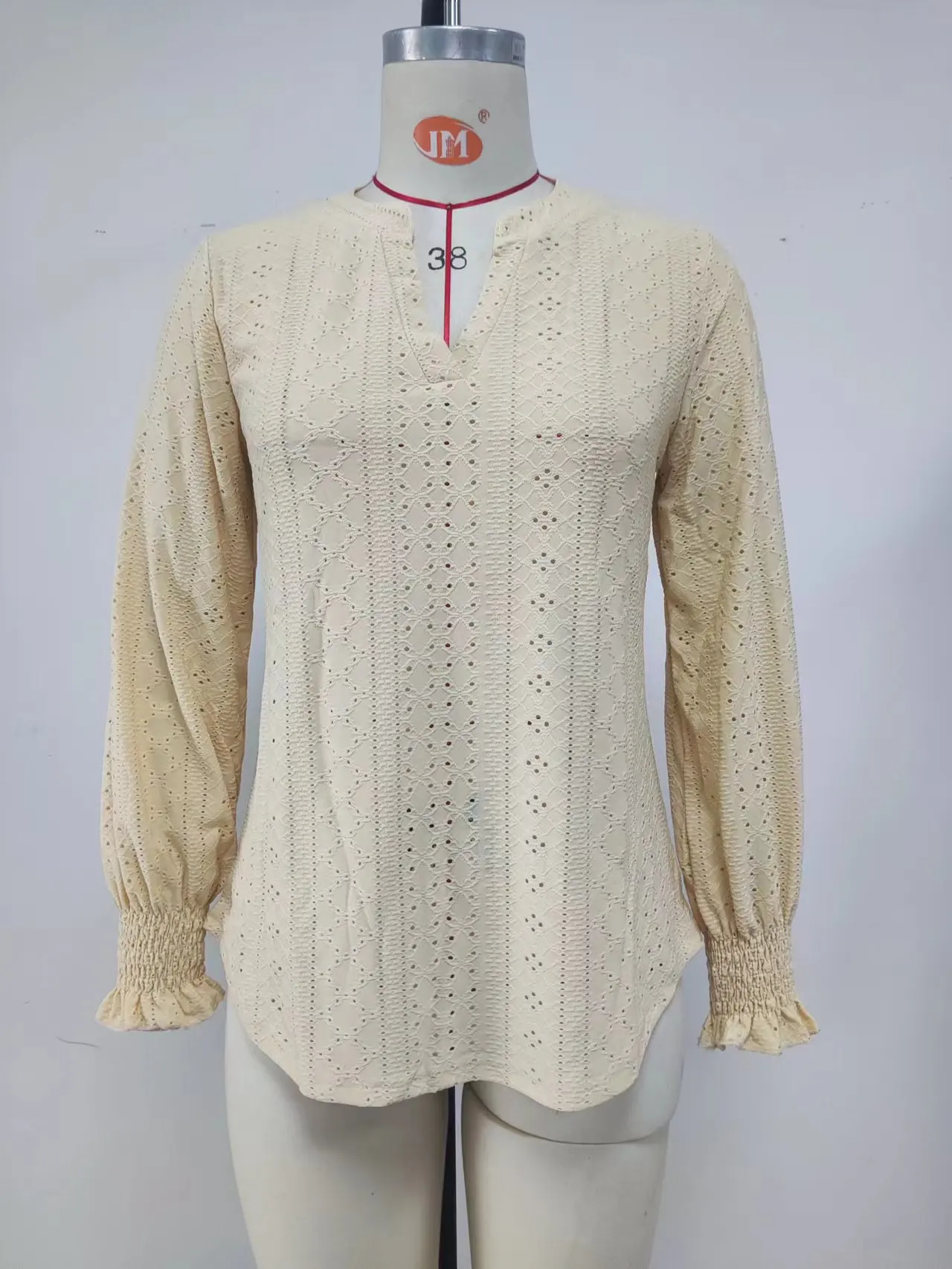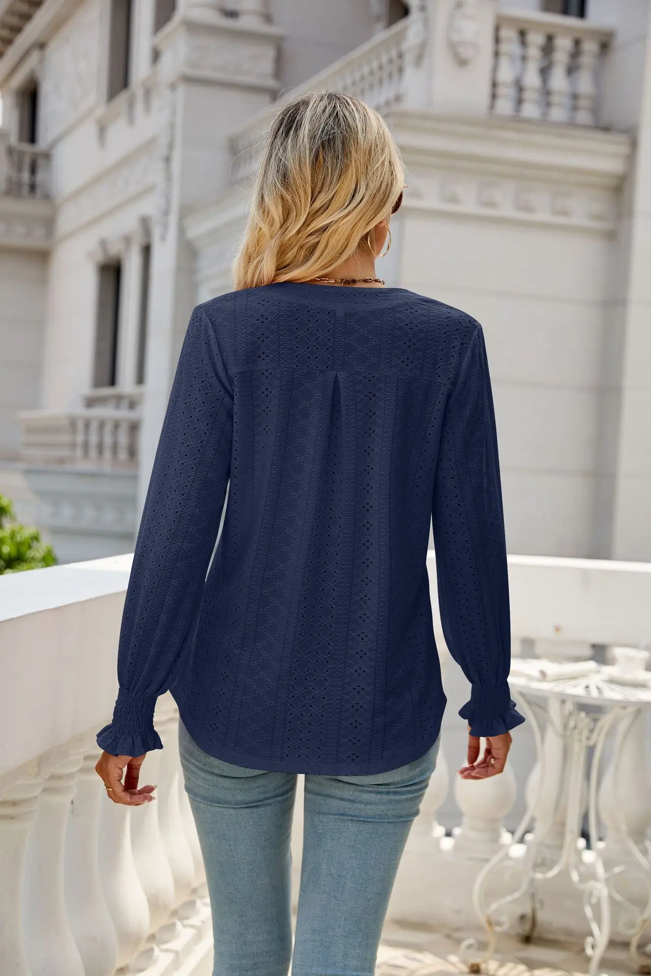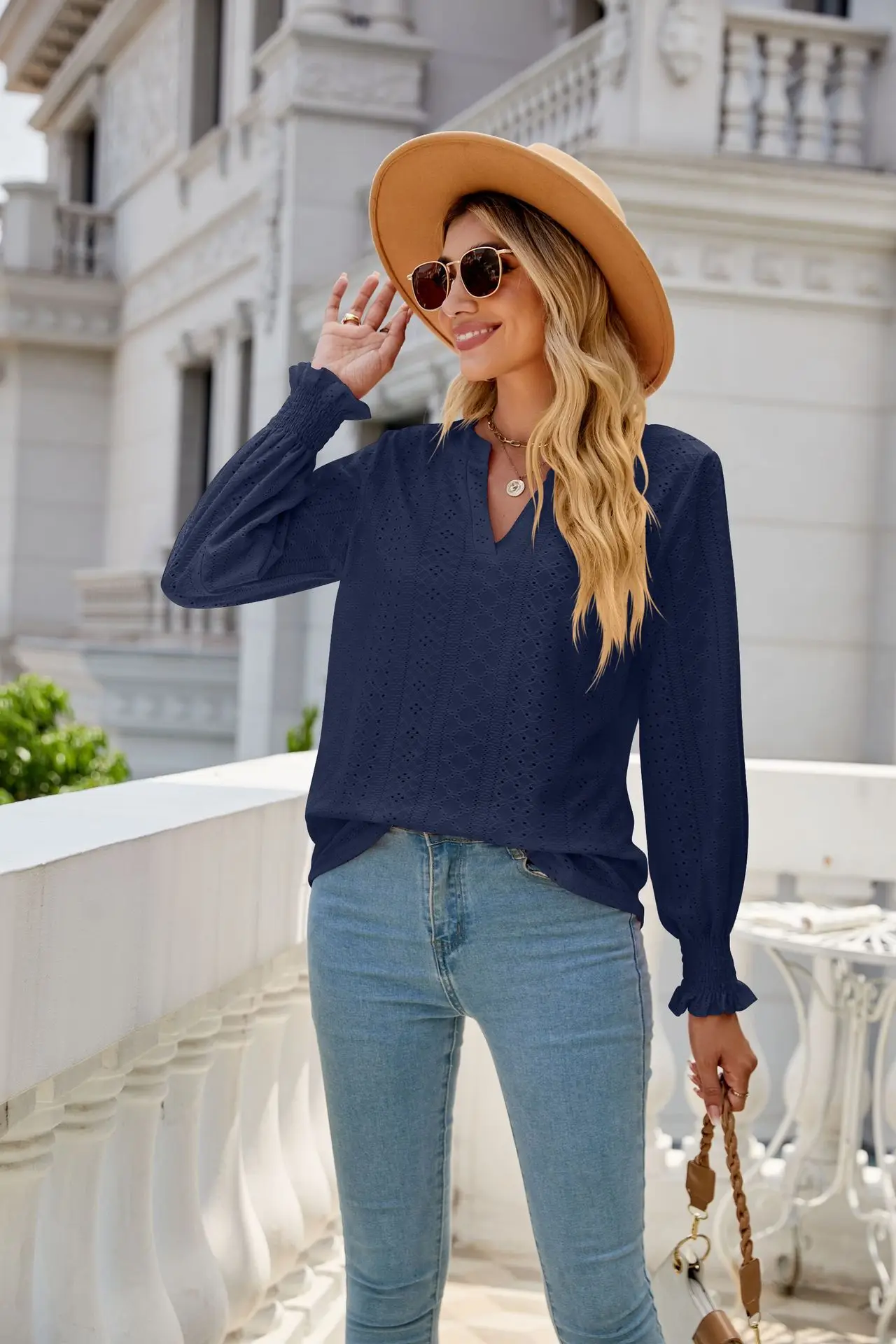 European and American New Solid color Hollow Pleated lotus Leaf sleeve V-neck loose long Sleeve top
