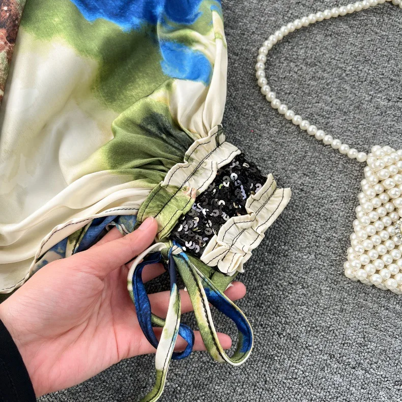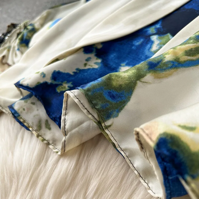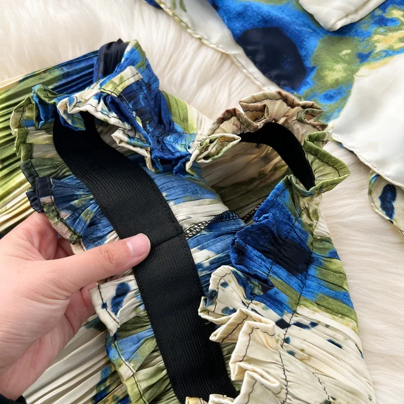 European and American Set Women High Grade Bat Sleeve Printed Top+Dropping Pleated Pants Two piece