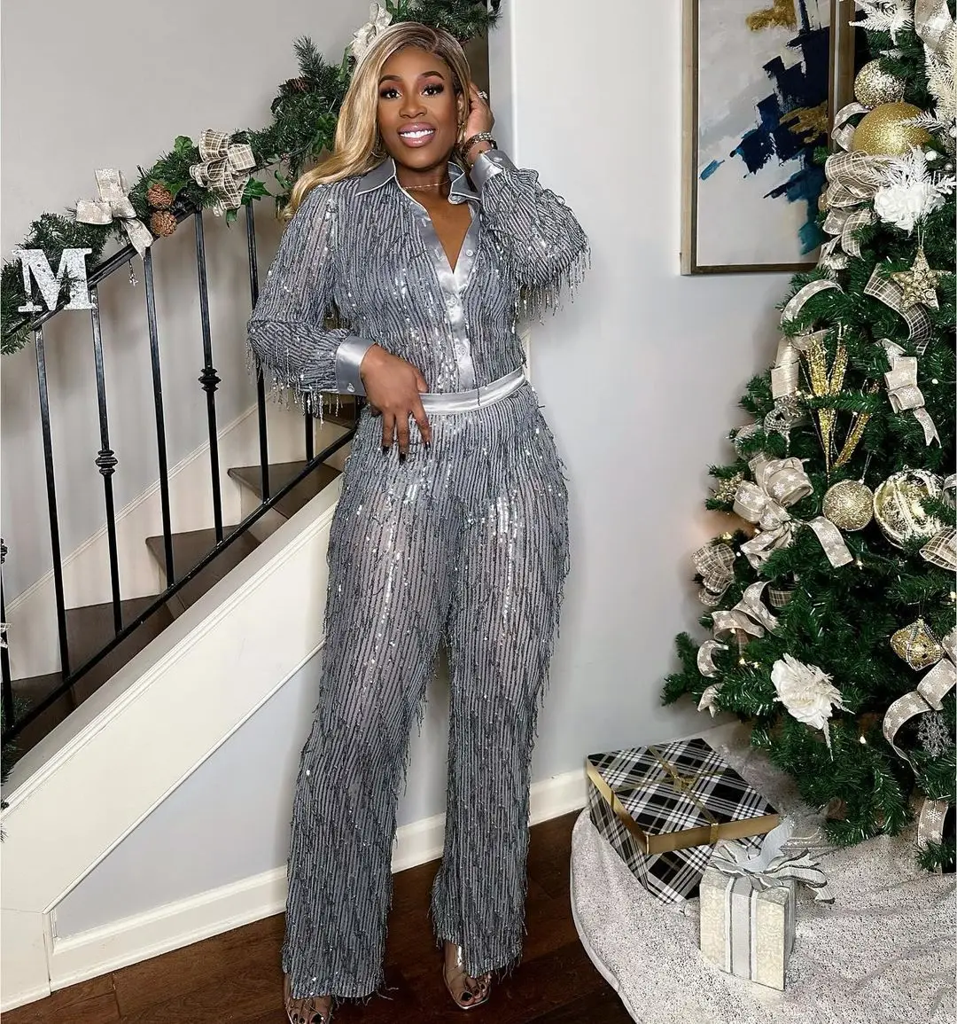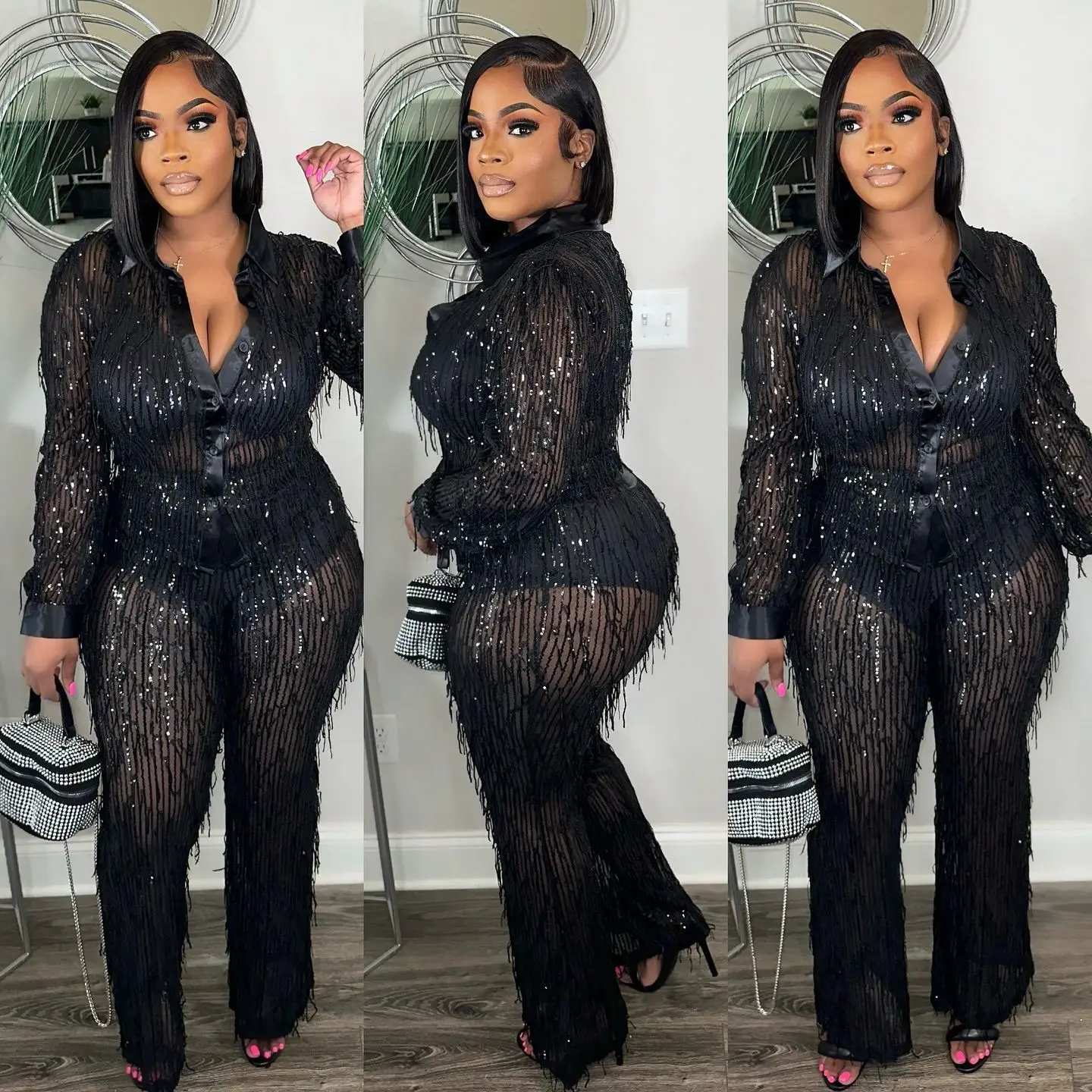 European and American sexy tassel sequin see-through shirt long-sleeved two-piece set