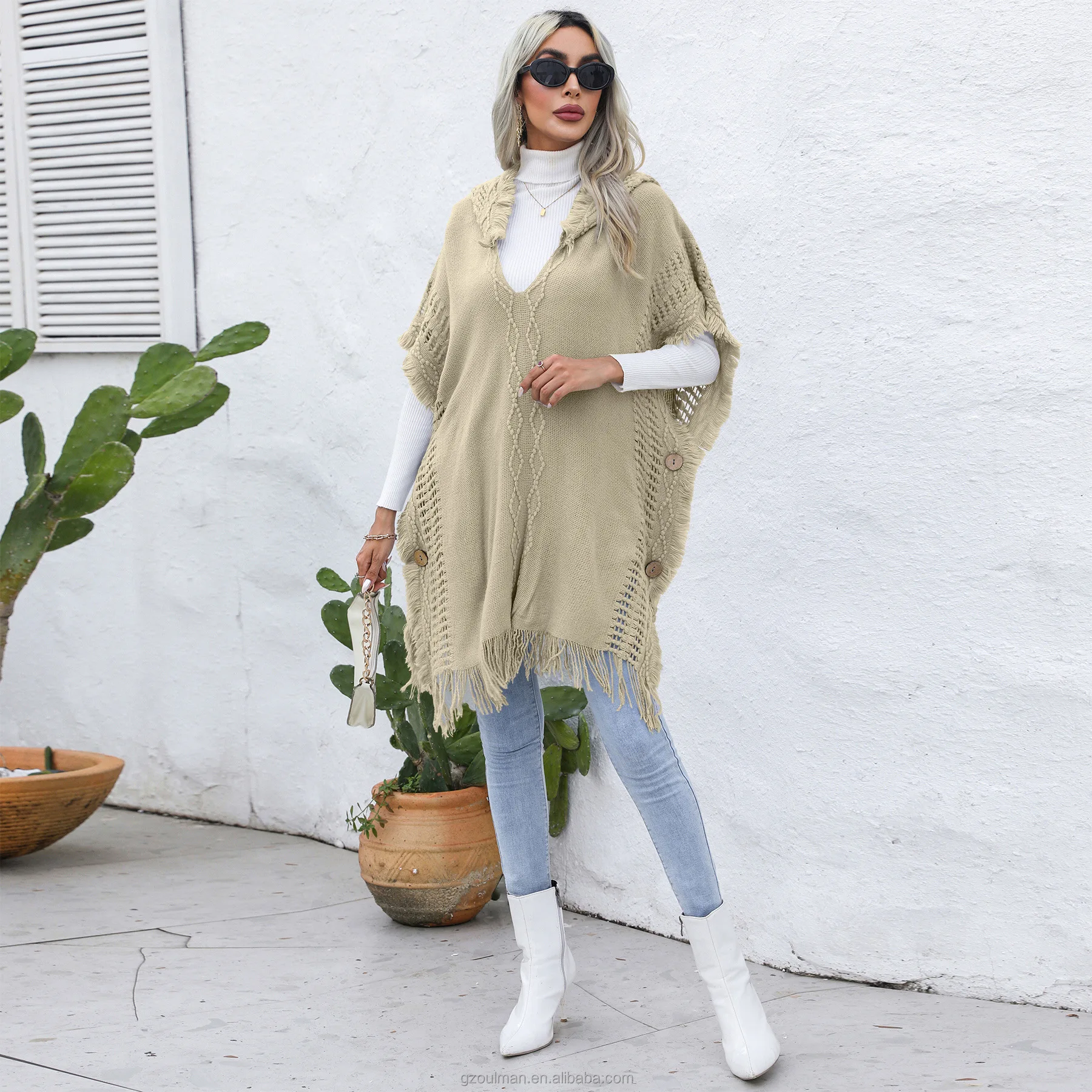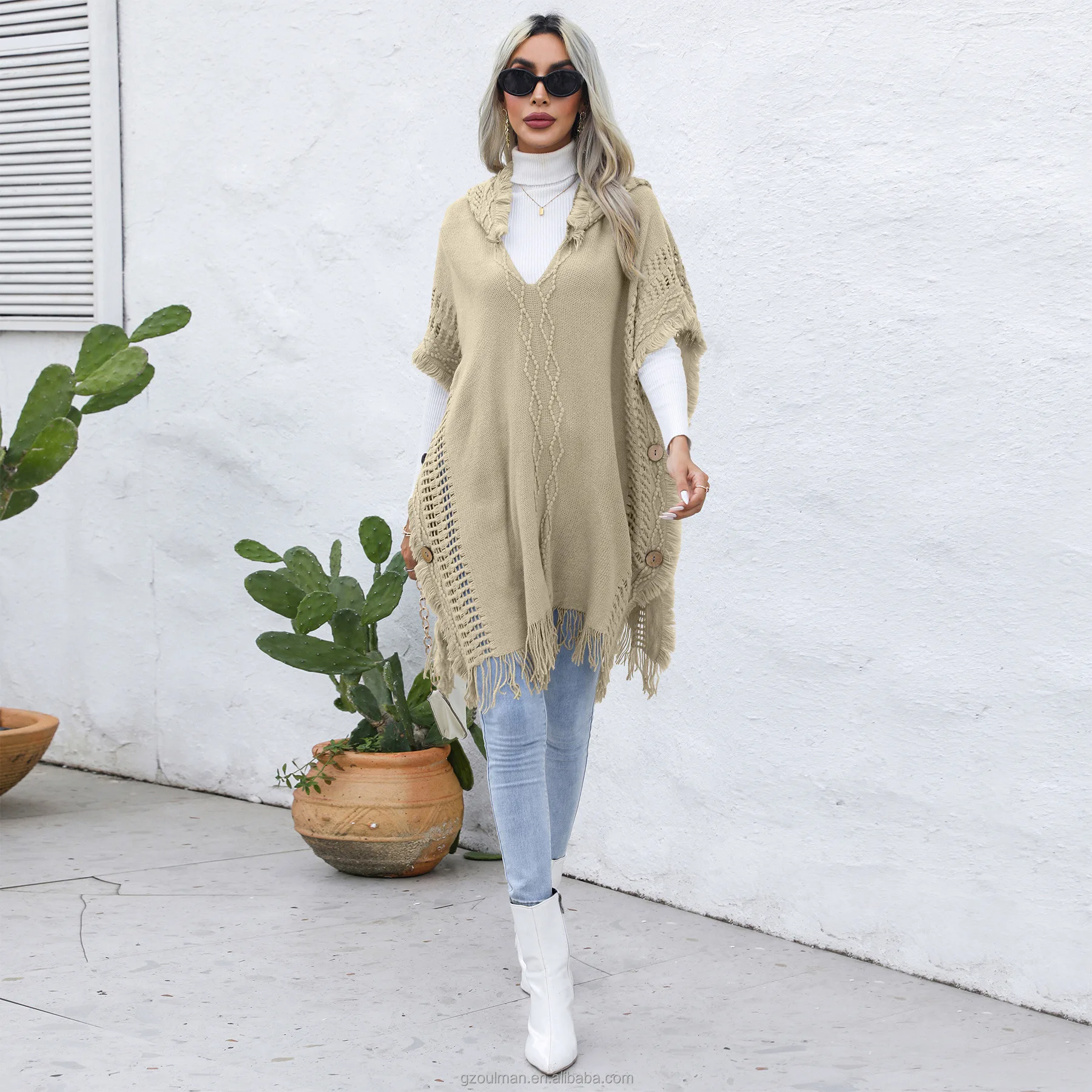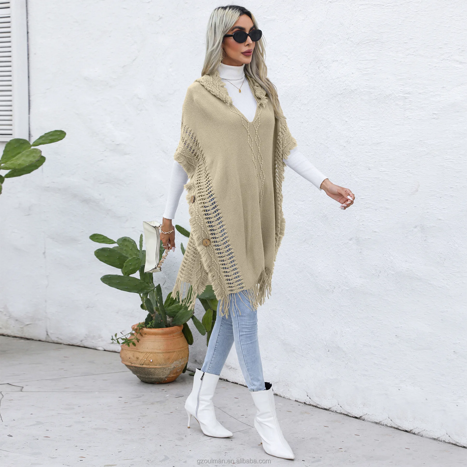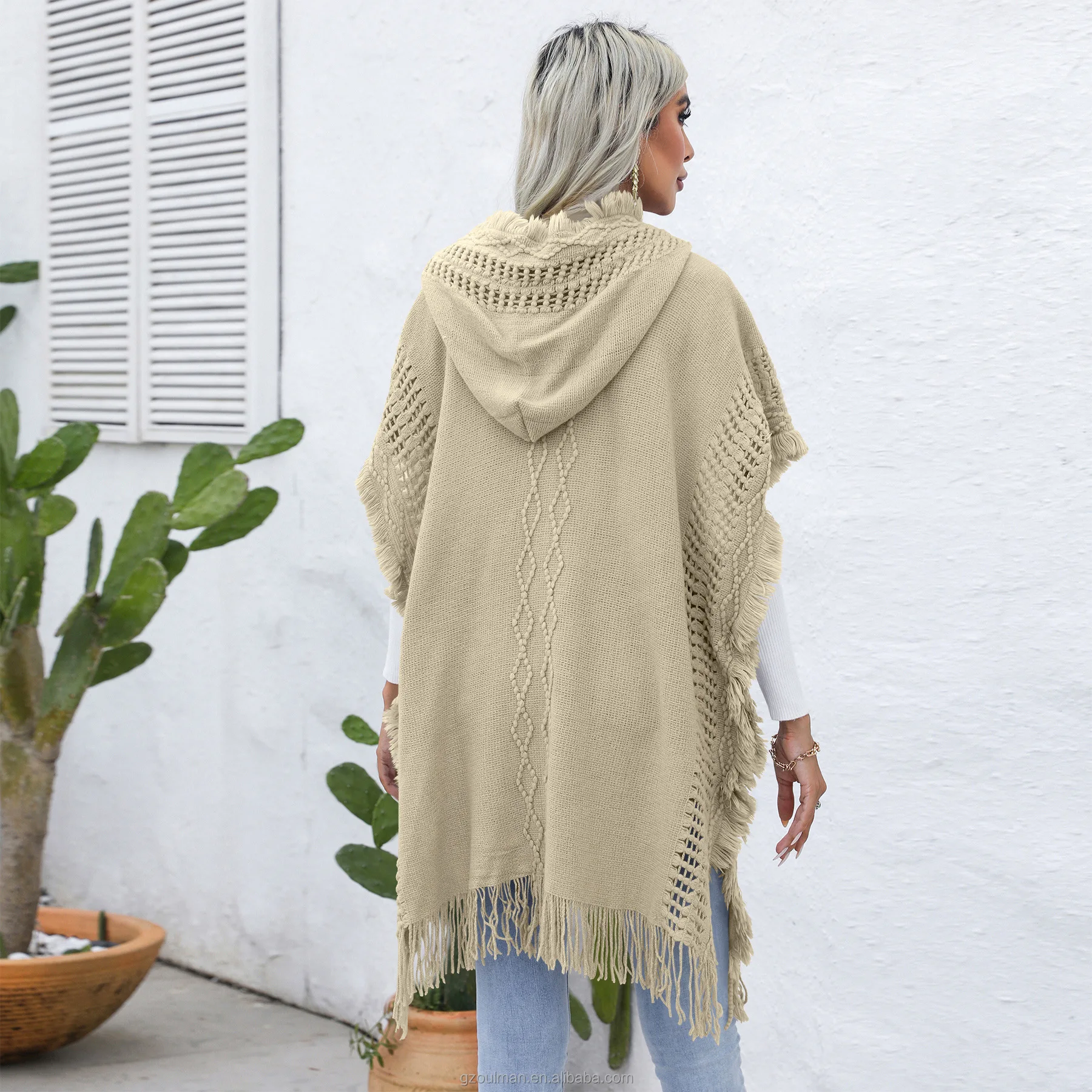 European and American Women's casual Loose V-neck Hooded pullover Mid-length sweater Vest Cape coat