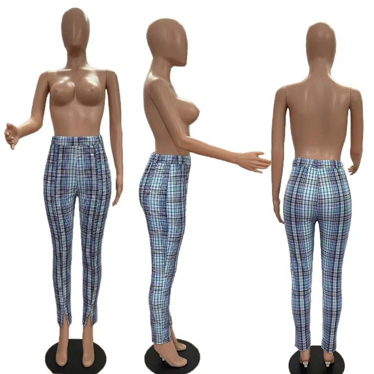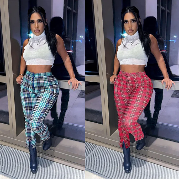 European and American women's digital printing plaid sexy all-match front slit casual pants women