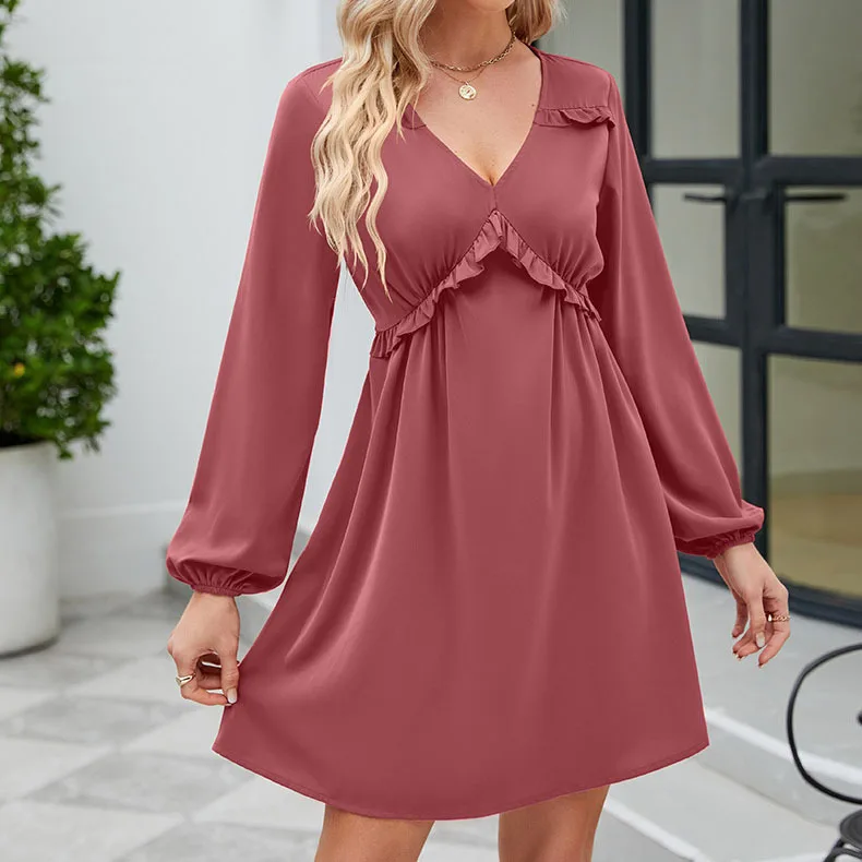 Explosive 2023 Europe and the United States lace-up Spring and Autumn new V-neck dress casual pleated long-sleeved dress