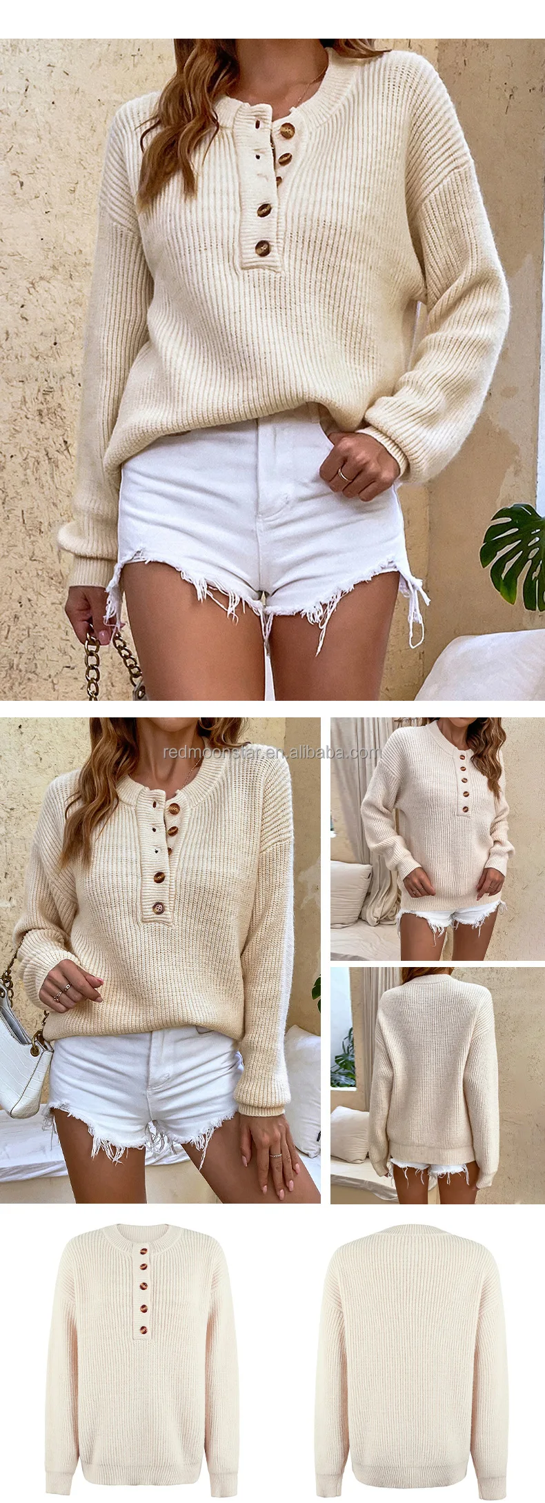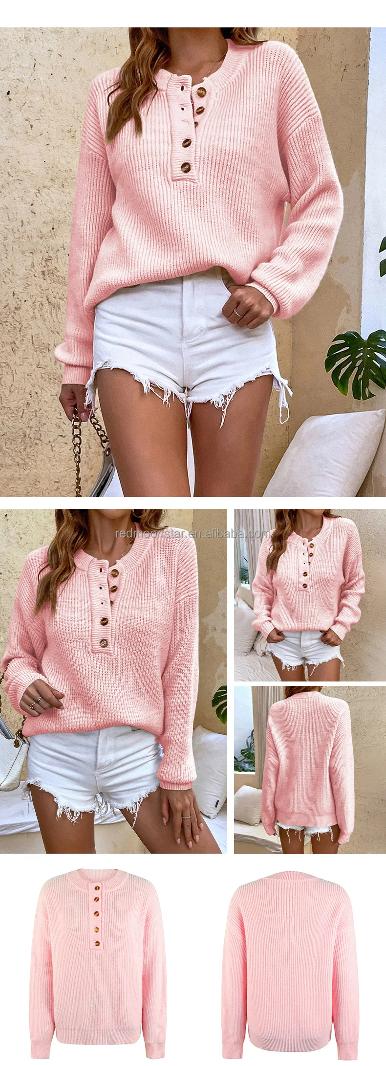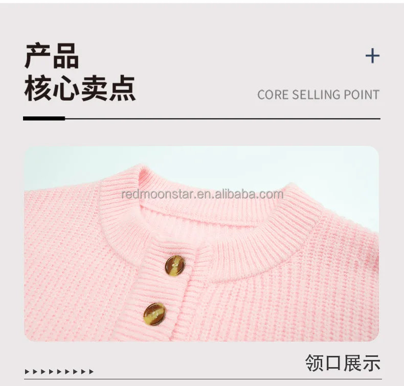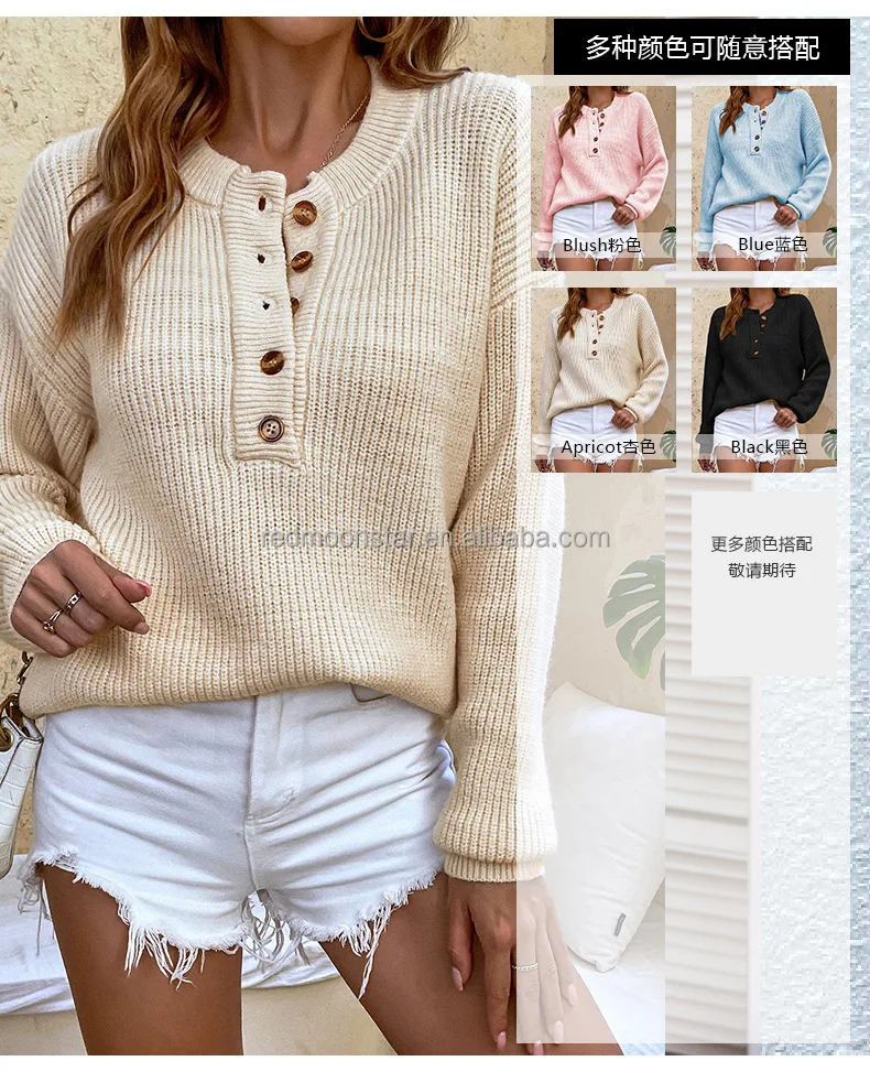 Factory directsale autumn winter solid color with button long sleeve jumper sweater women new round neck knit top sweater jumper