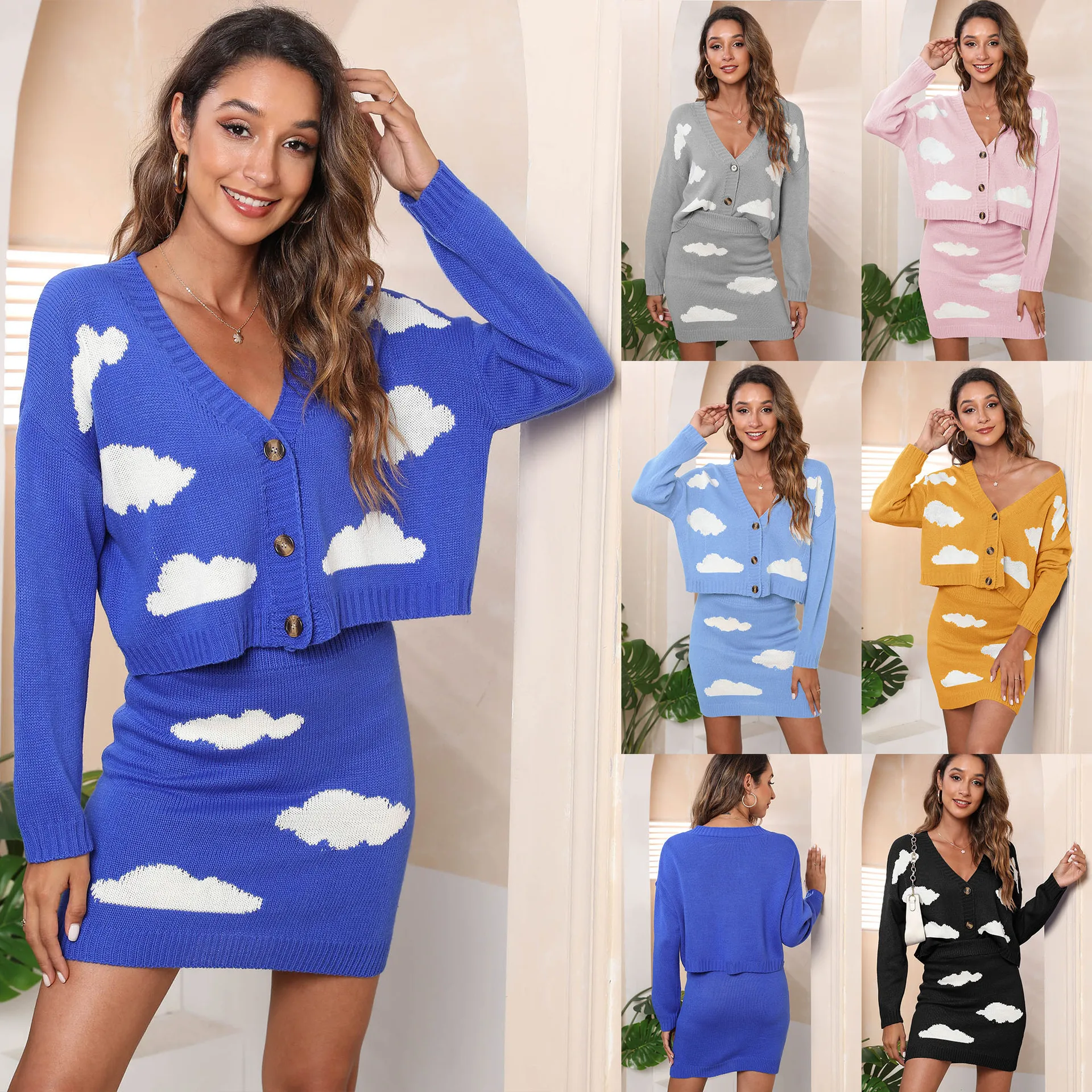 Factory Fall 2022 Women Clothes Women Cloud Jacquard 2 Piece Knit Sweater Short Cardigan Skirt Set
