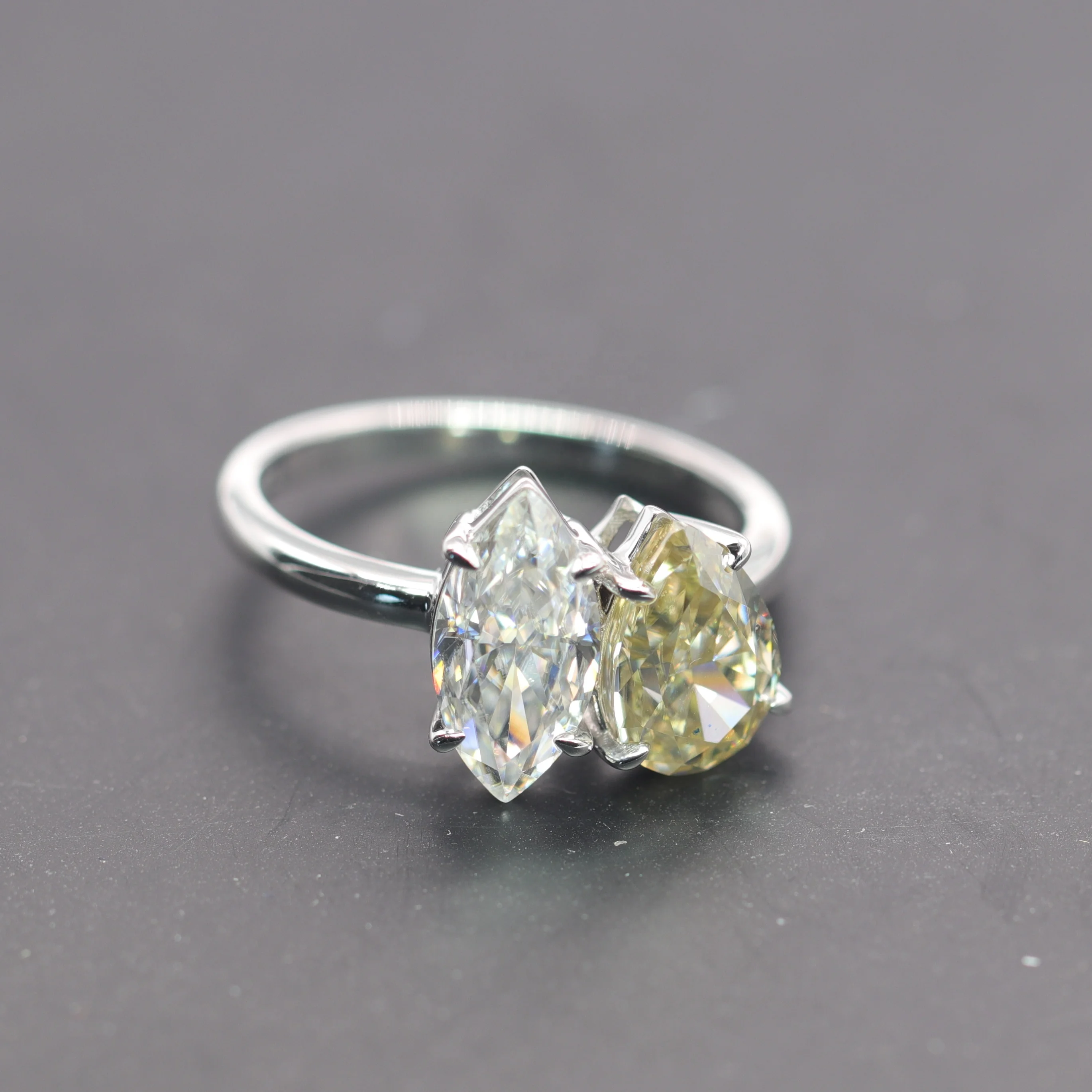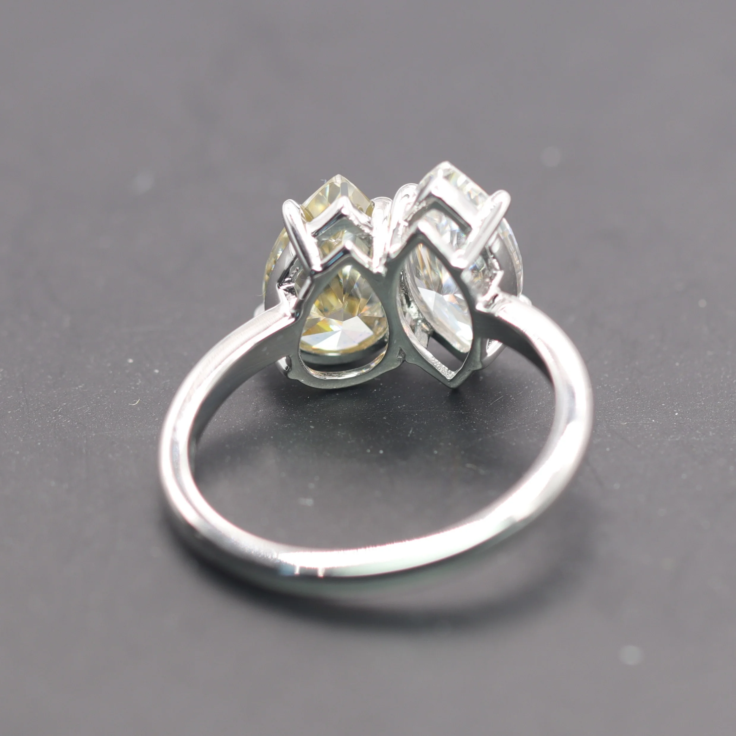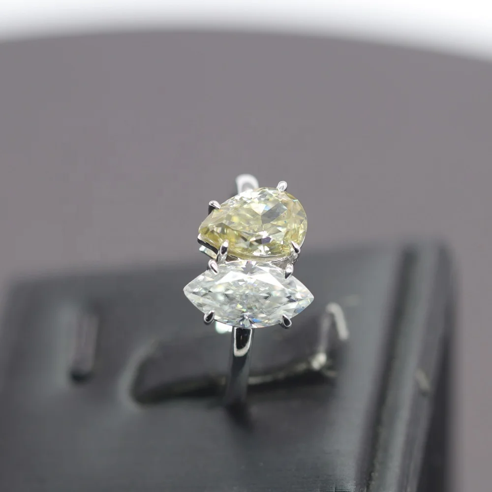 Factory Hot Selling Customized AU750 18K Solid White Gold Two Stone Marquise Cut Pear Cut White Yellow Color 2CT Moissanite Ring