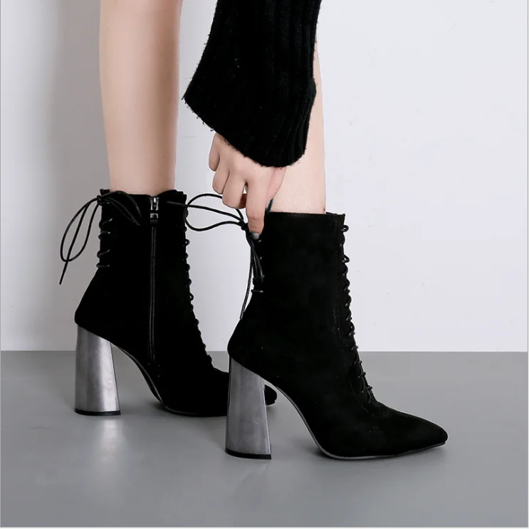 Factory supplier cheap women pointed toe chunky heel ankle boots Zipper high Heel Sexy Short Booties winter shoes