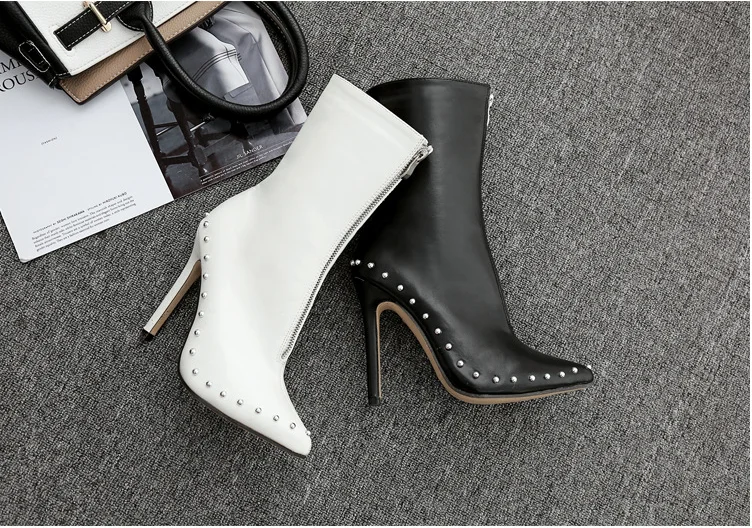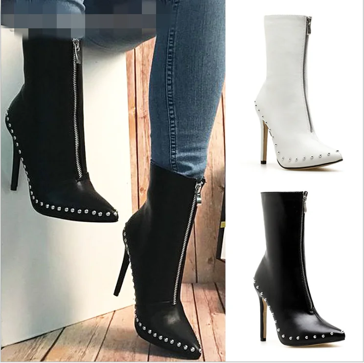 Factory supplier cheap women pointed toe rivet stiletto ankle boots Zipper high Heel Sexy Short Booties winter shoes