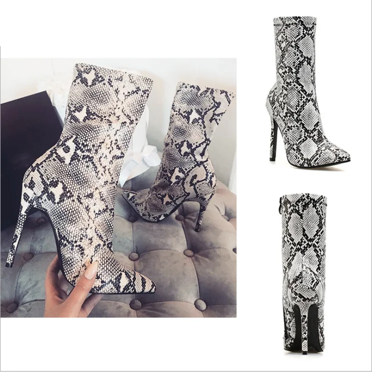 Factory supplier cheap women pointed toe snake print stiletto ankle boots high Heel Sexy Short Booties winter shoes