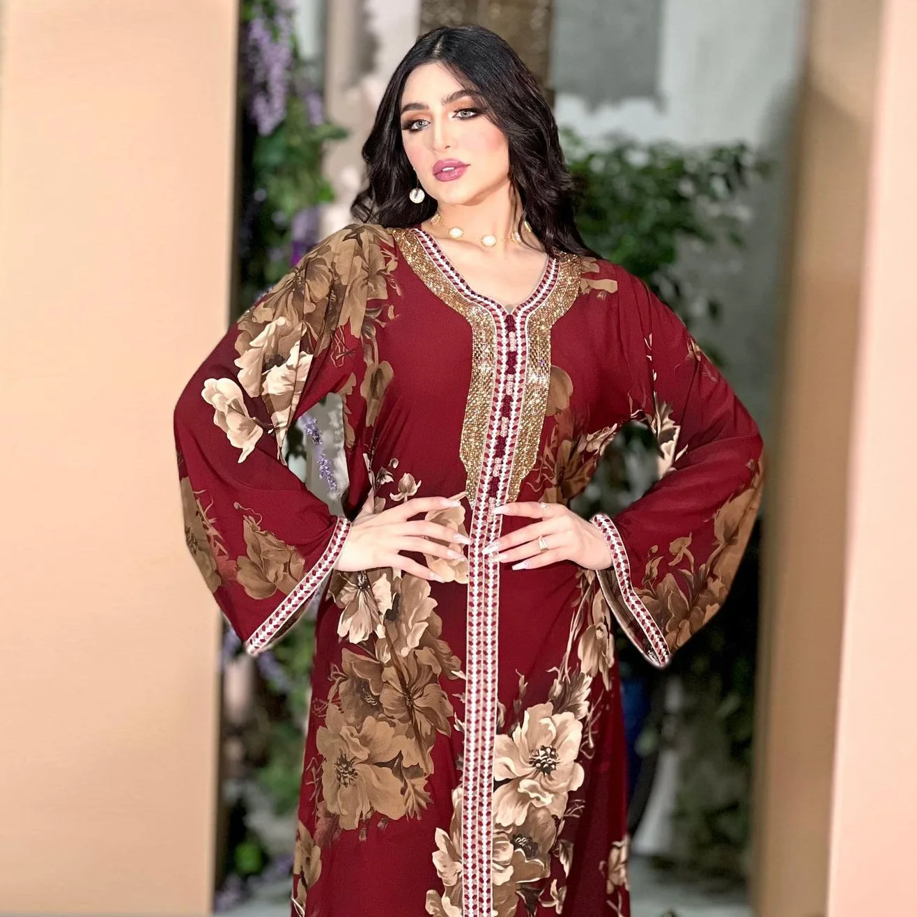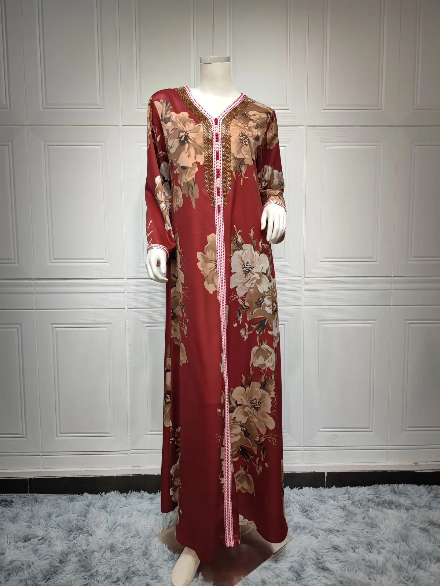 Factory wholesale Middle East Dubai Arab robe abaya printing hot fix rhinestone dress support custom your design