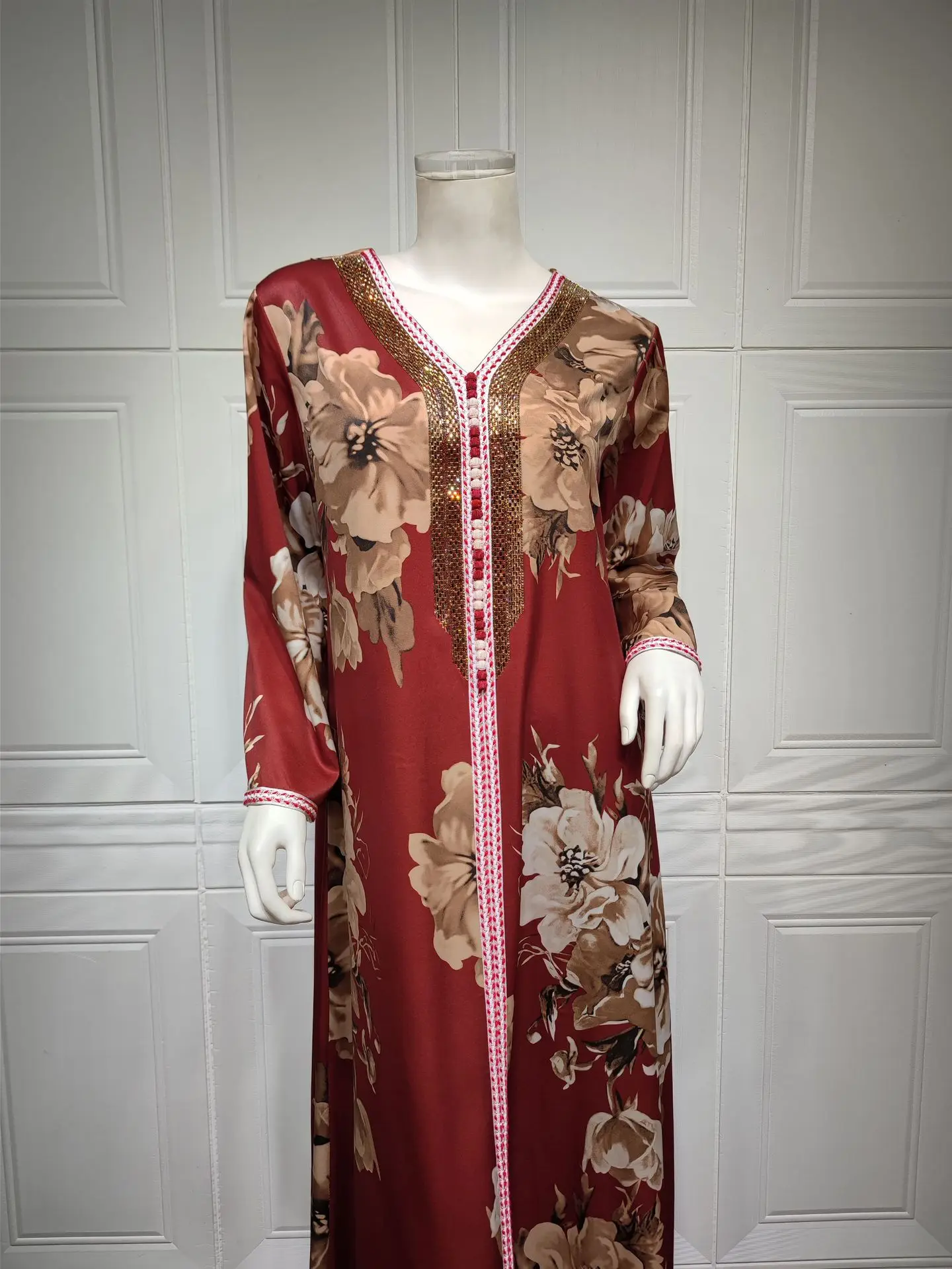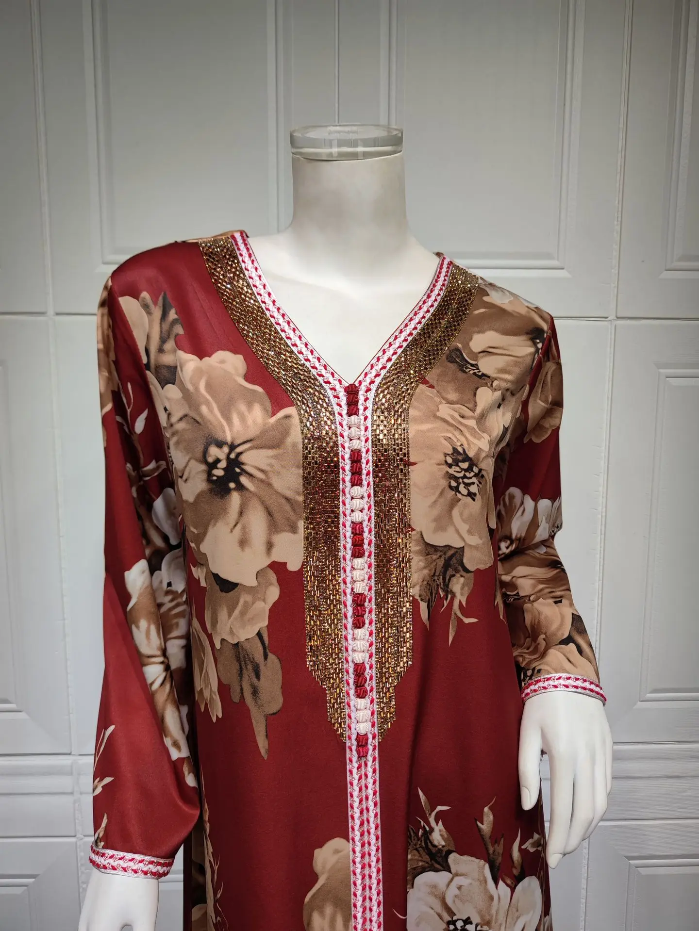Dubai Arab robe abaya printing hot fix rhinestone dress