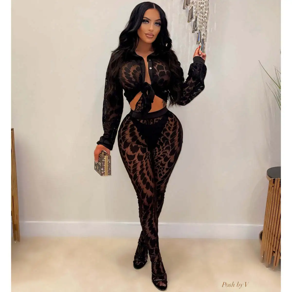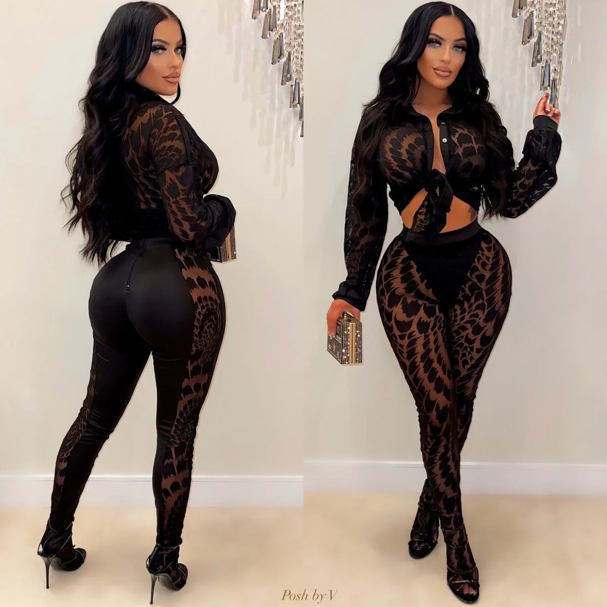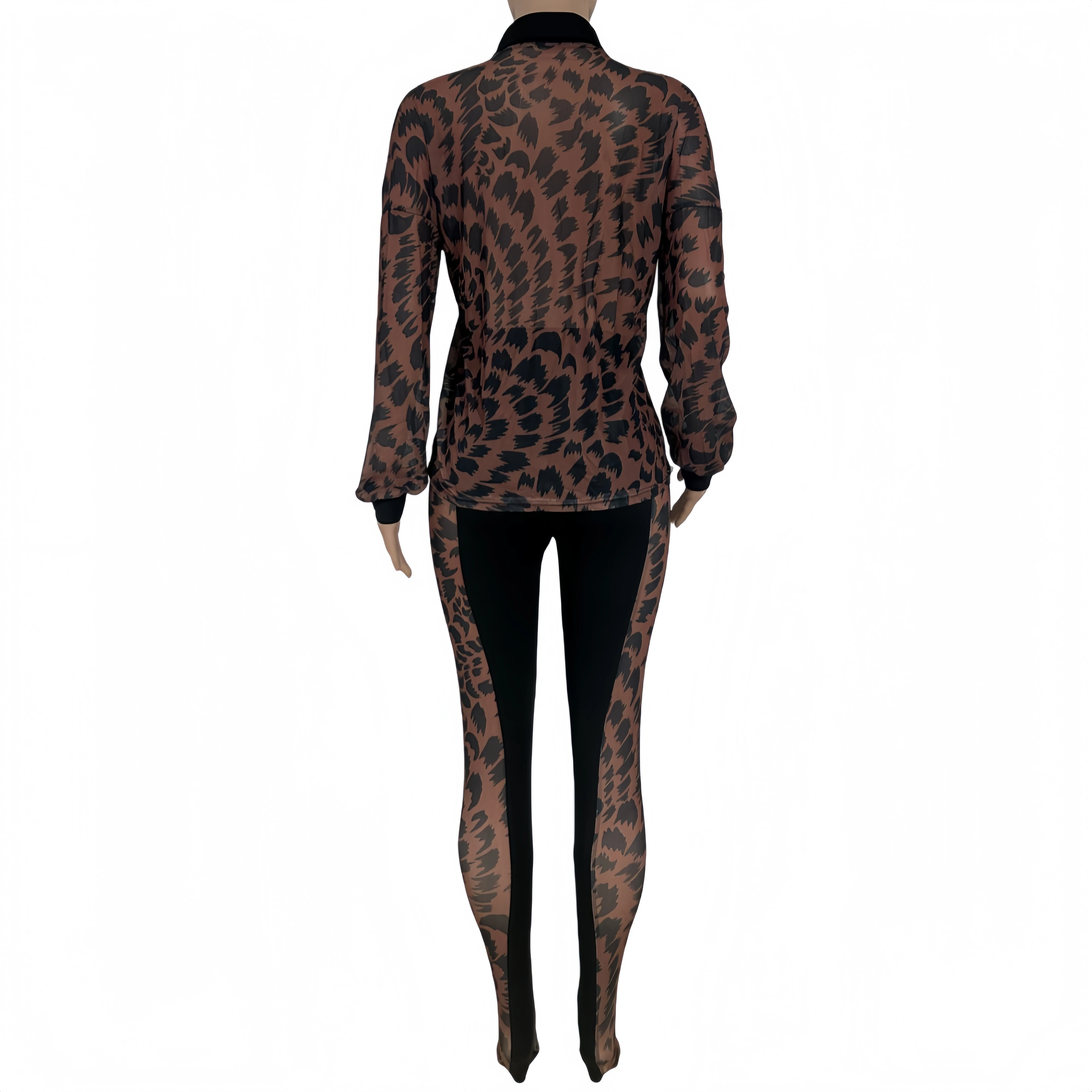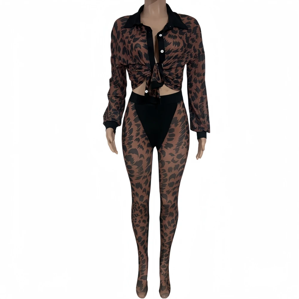 FAGADOER Autumn New Sexy Mesh See Through Woman 2 Piece Set Outfit Long Sleeve Crop Top and Pants Female Streetwear Clothing