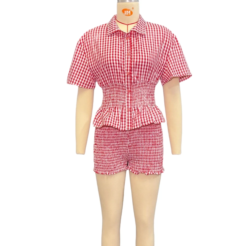 FAGADOER Casual Red Plaid 2 Pieces Set for Woman Short Sleeve Ruffle Patchwork Shirts and Shorts Outfit Female Streetwear New