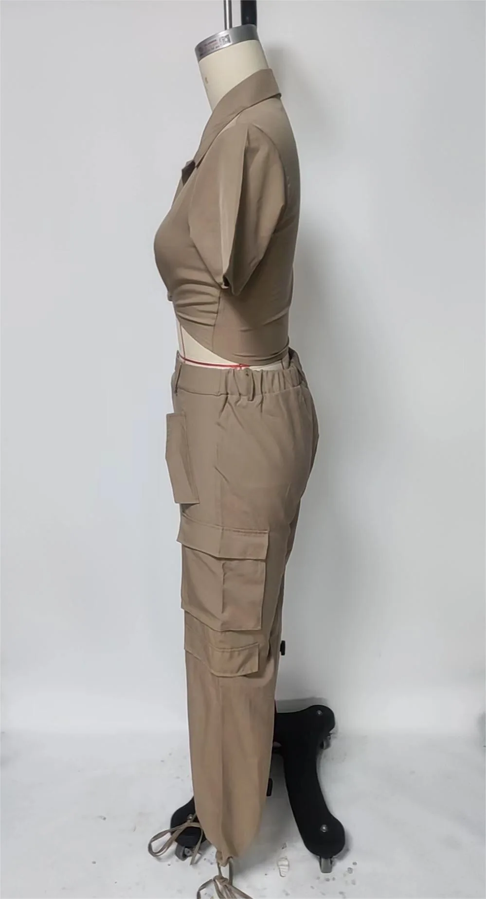 Fall 2023 Women's Set Short Sleeve Button Shirt Top and Side Pocket Cargo Trouser Pants Suits Safari Tracksuit 2 Piece Pant Sets