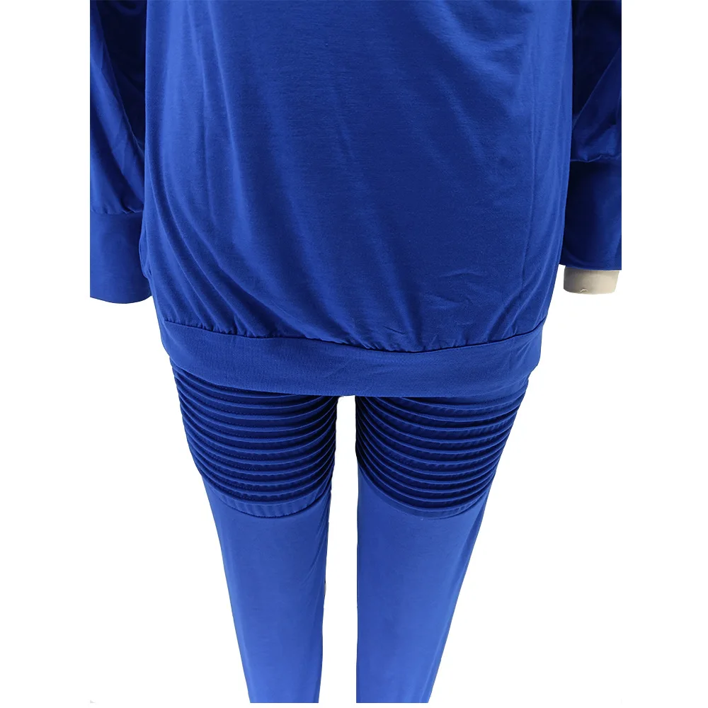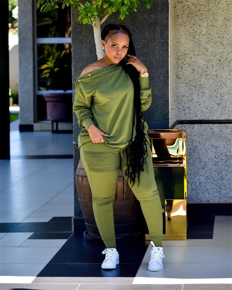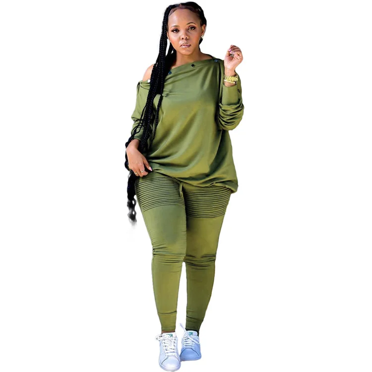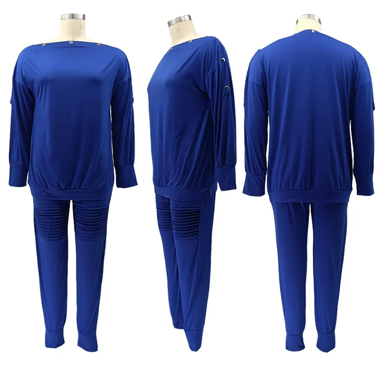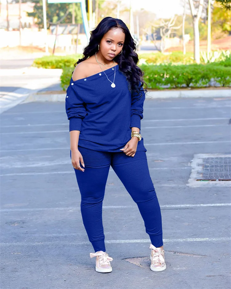 Fall clothes women one off the shoulder top sweater with button casual two piece pants set
