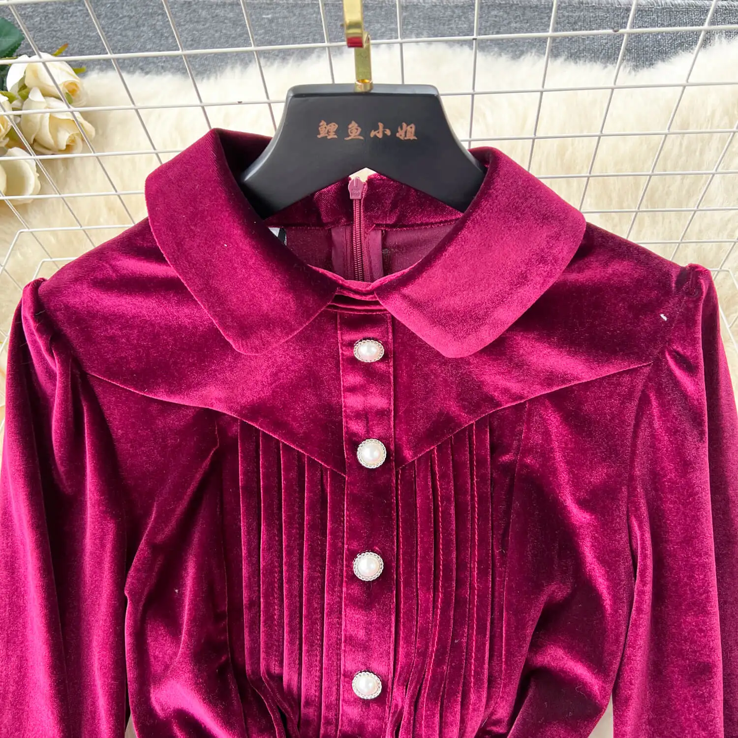 Fall New French Retro Hepburn Style Lapel Single Breasted Velvet Dress Woman