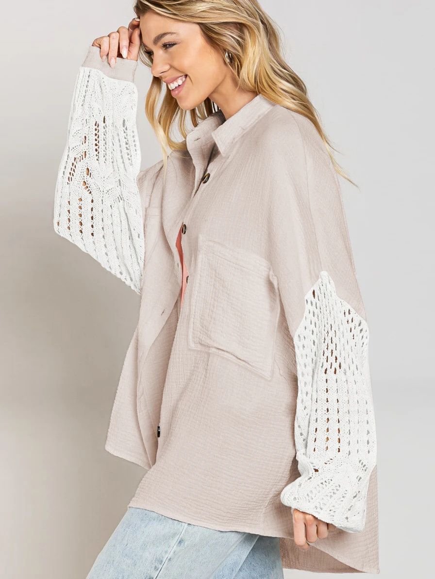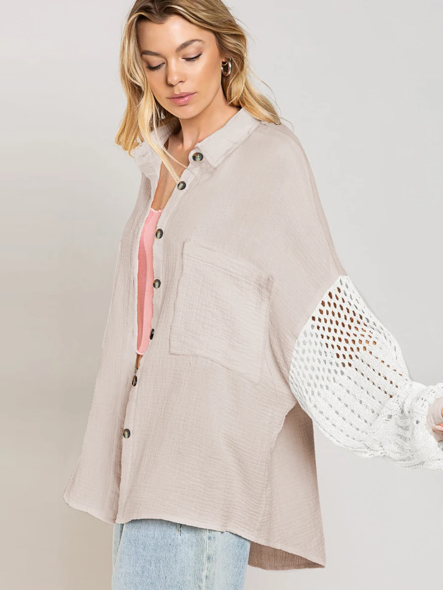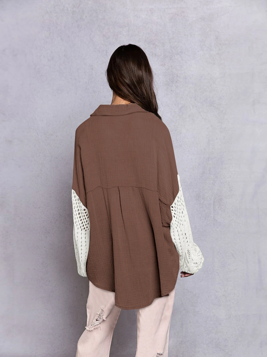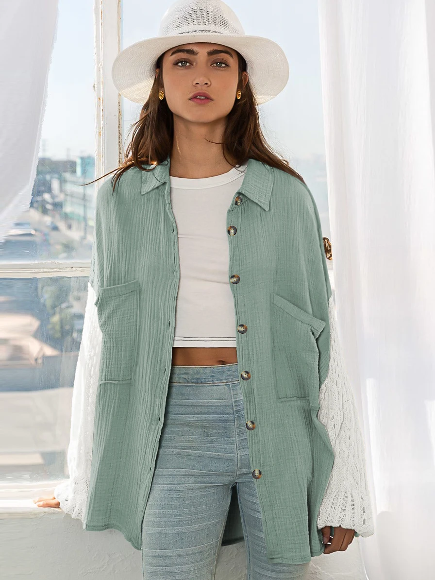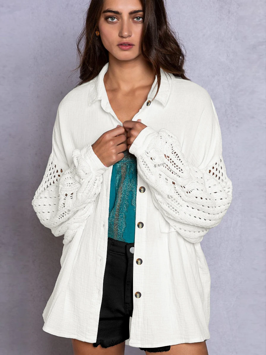 Fall Soft Rayon Loose Hollow Out Lace Women Wholesale Button Down Shirt