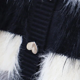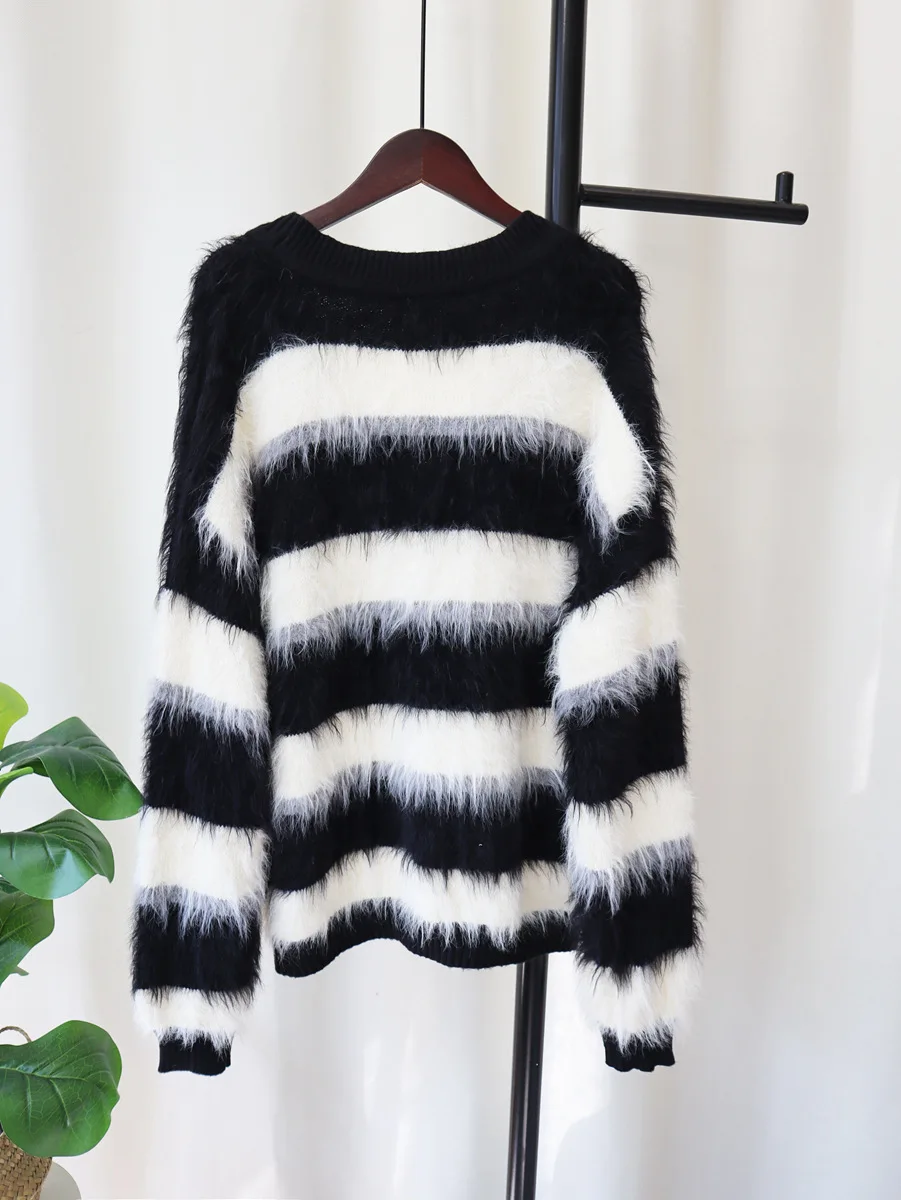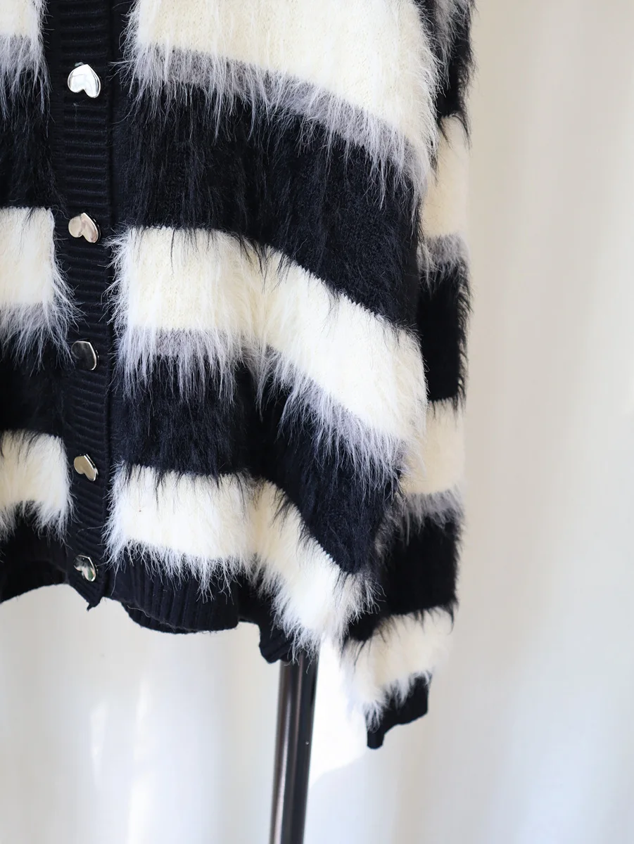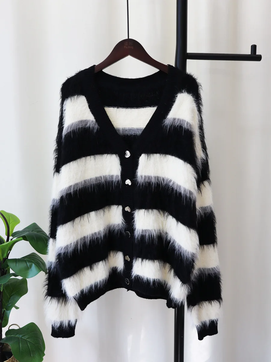 Fall spring ladies casual striped faux mink fur knitted cardigan V neck women sweater jacket coat cardigan