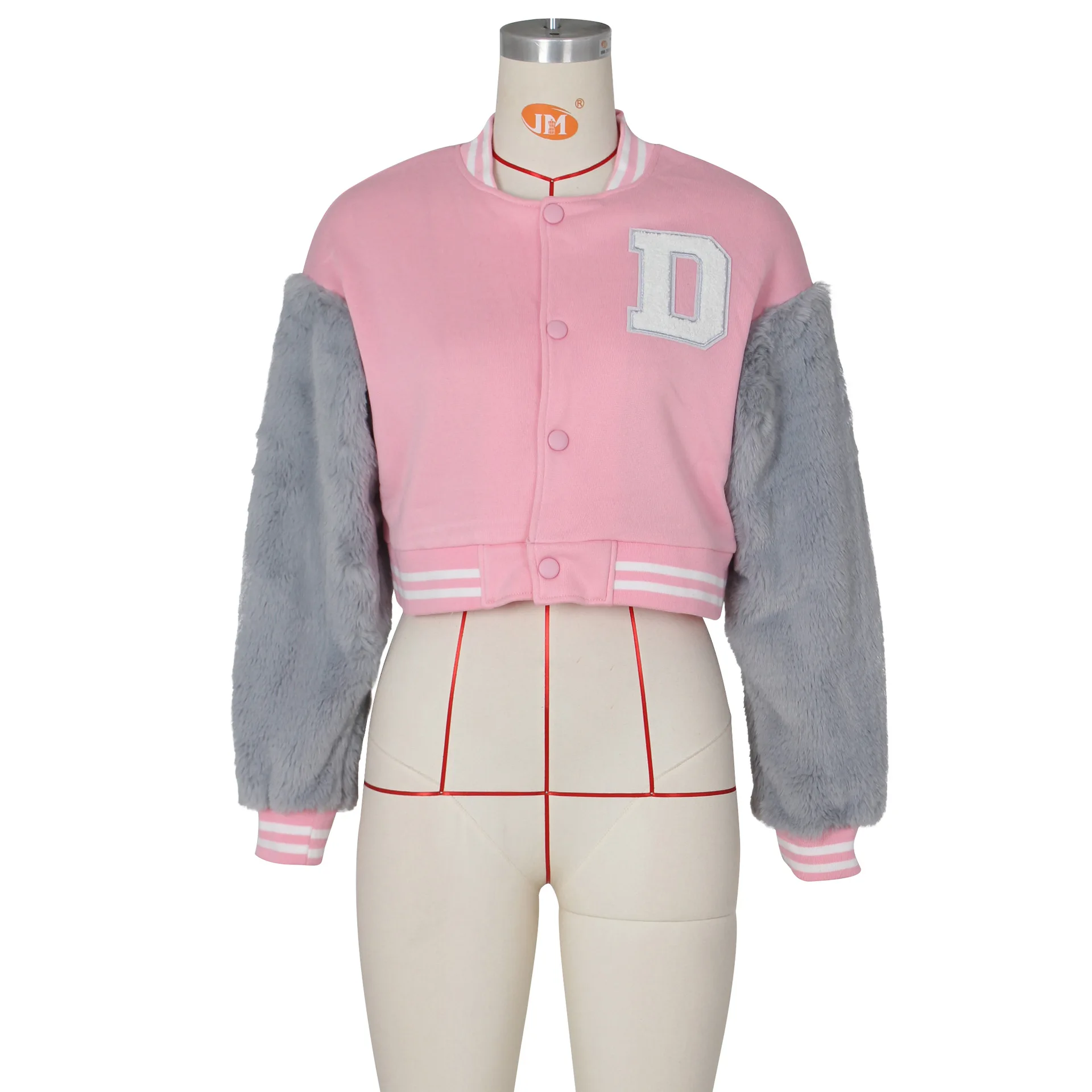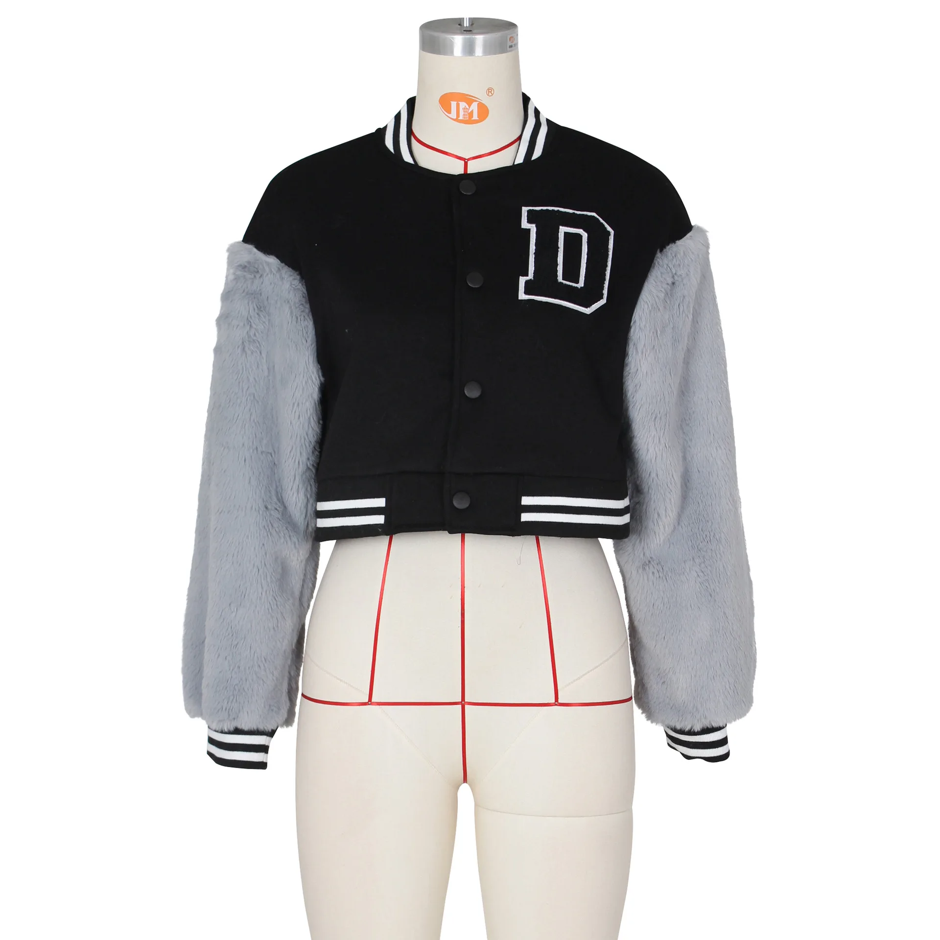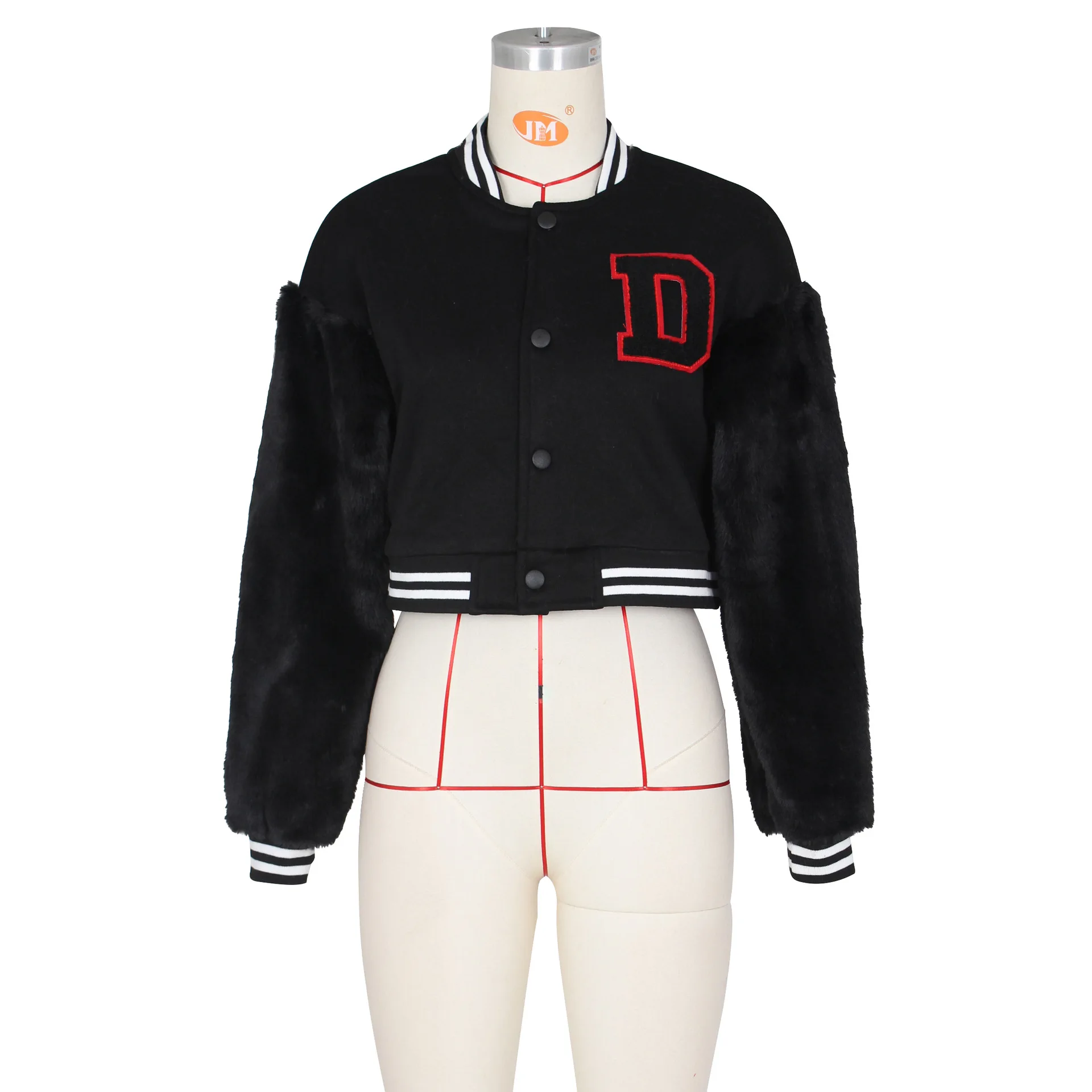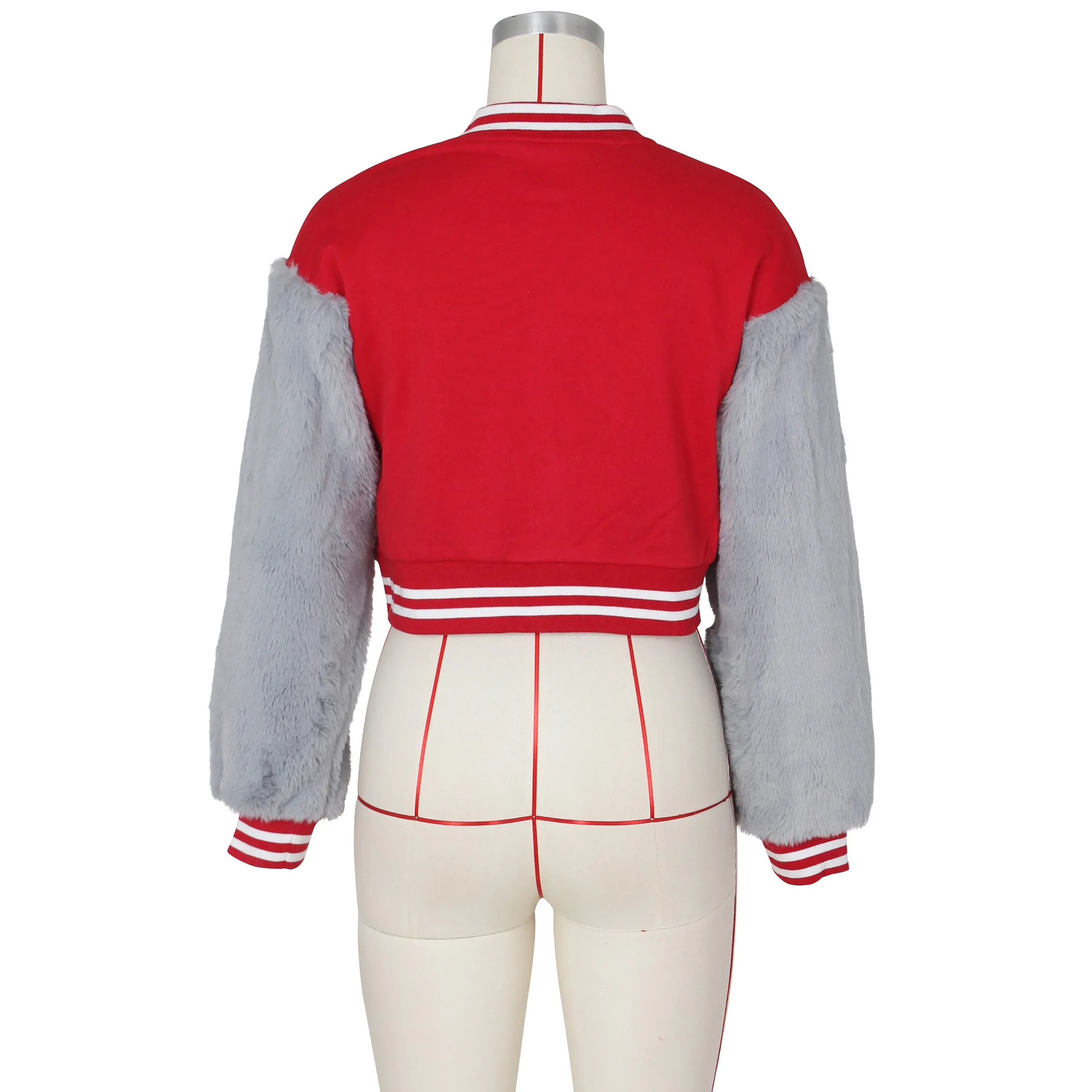 Fall stylish ladies baseball jacket with fur long sleeve women varsity letterman jackets