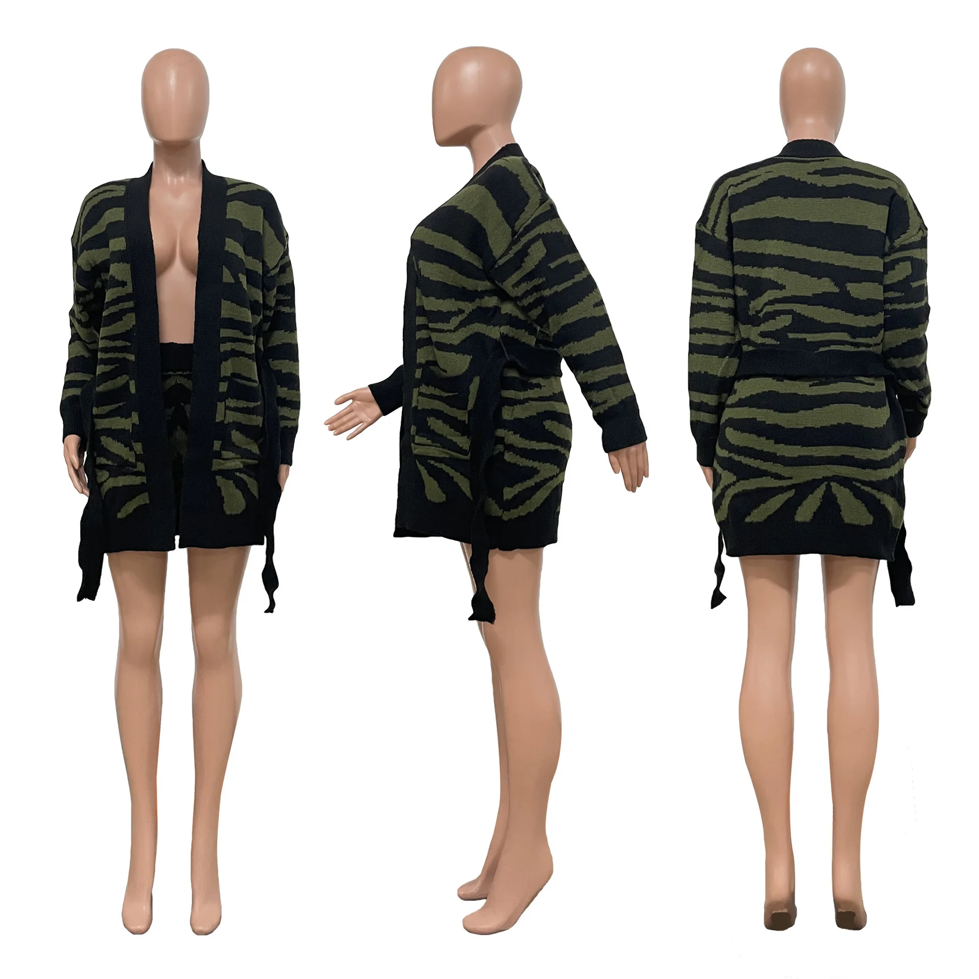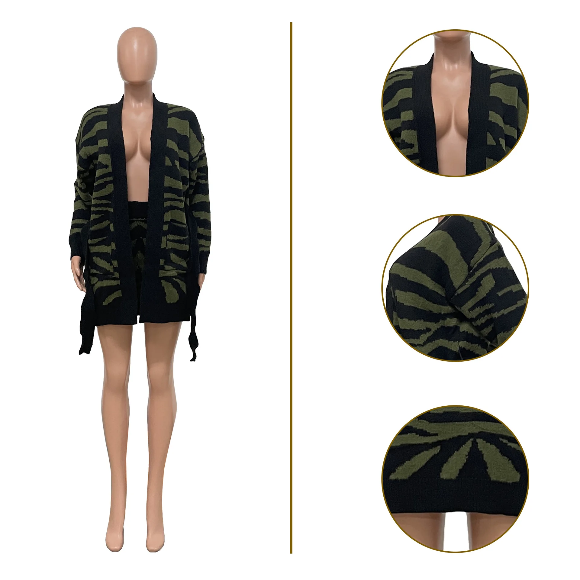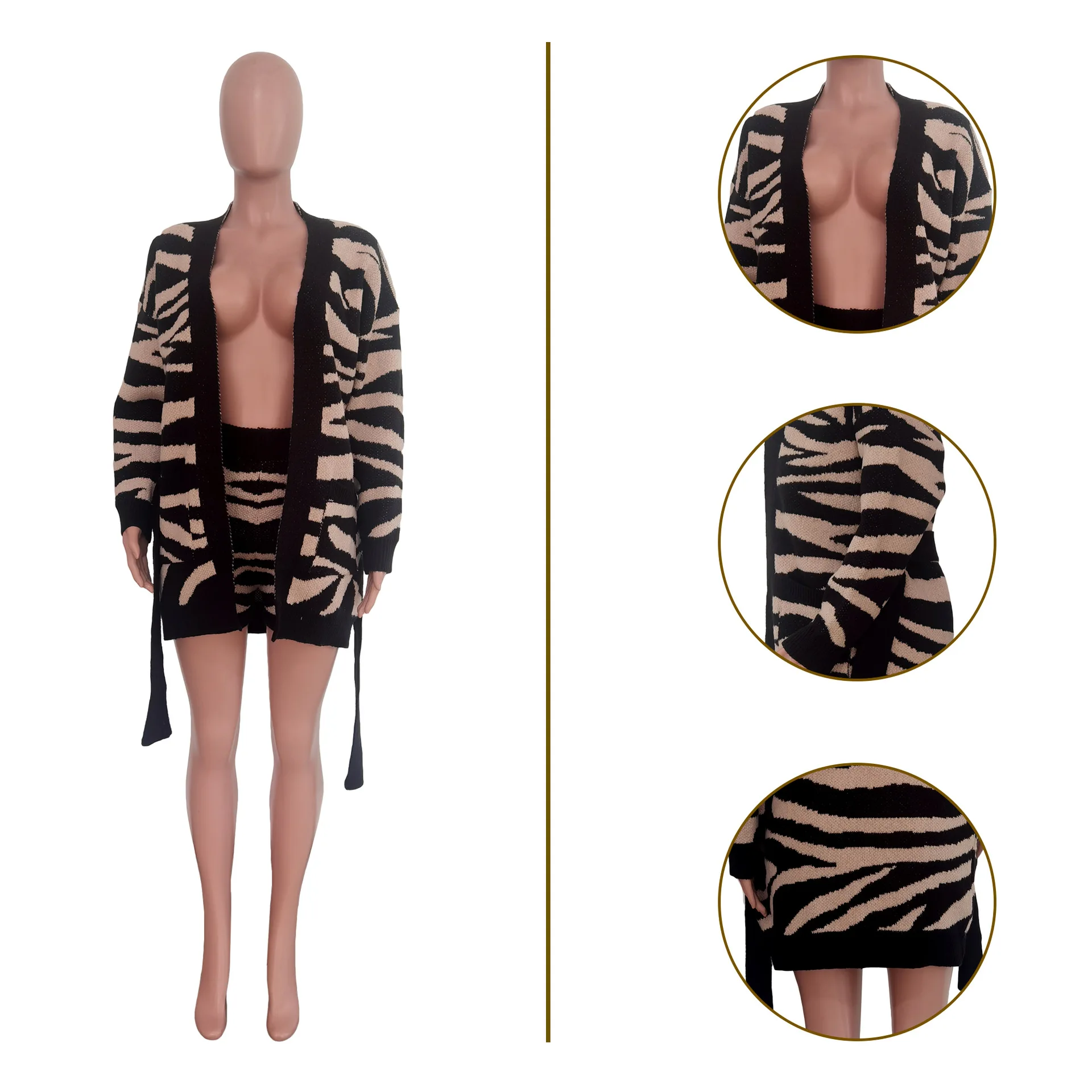 Fall winter animal print lady casual matching sweater cardigan 2 piece short set two piece knit set women clothing