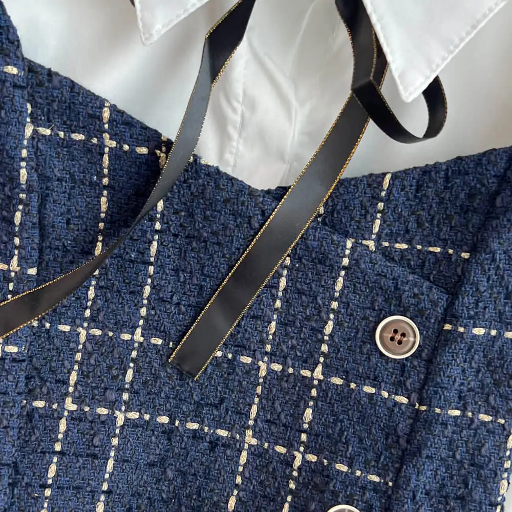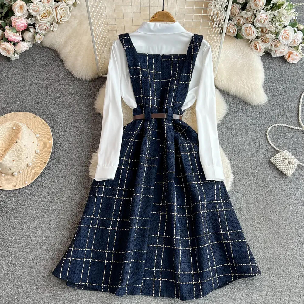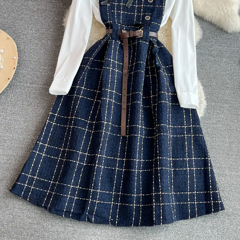 Fall Winter Korean Version Age-Reducing Sweet White Shirt Two-Piece Set Medium Length A-Word Tweed Dress