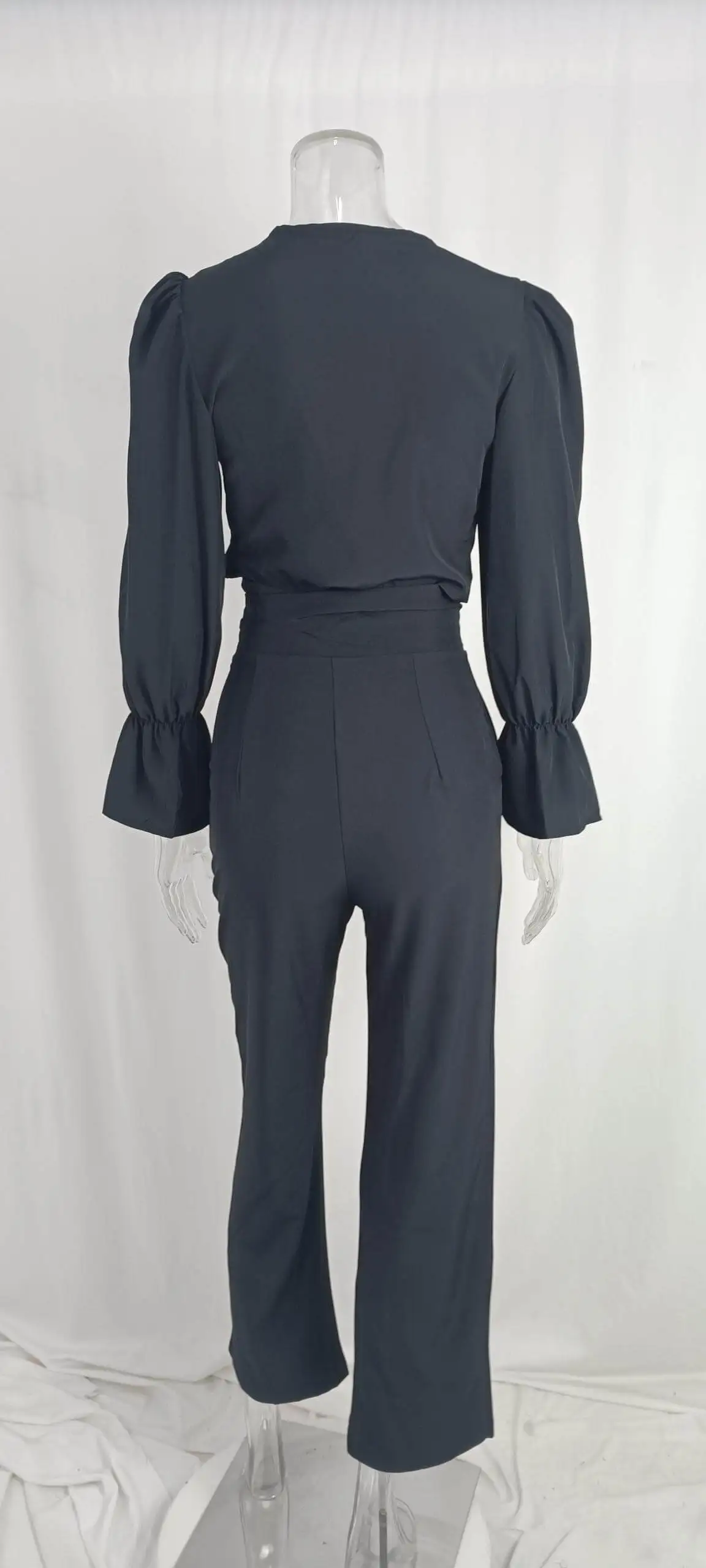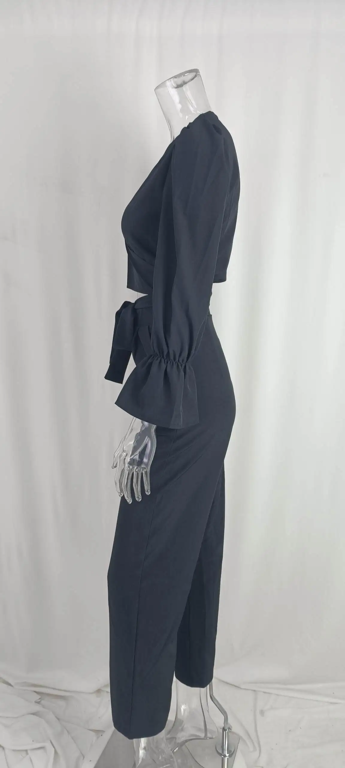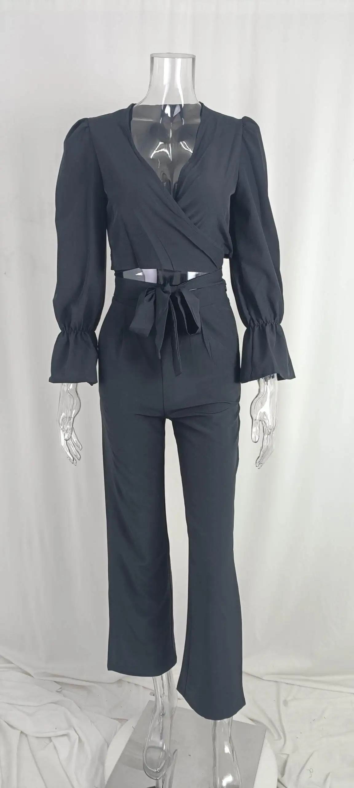 Fall Women's Two-piece Flared Sleeves V-neck Lace-up Top And Trousers Fashion Casual Suit