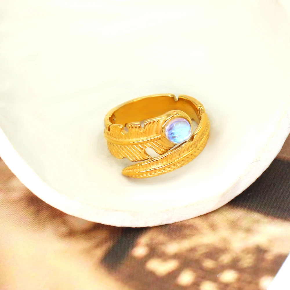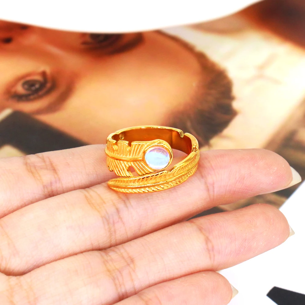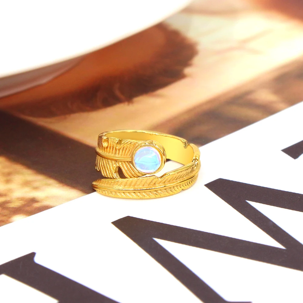 FANJIN Cubic Zirconia Metal Stainless Steel Waterproof Feather Fashion Gold Color Ring for Women Charm Stylish Jewelry Bijoux