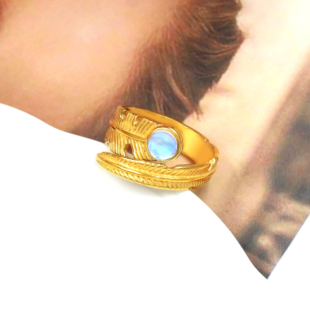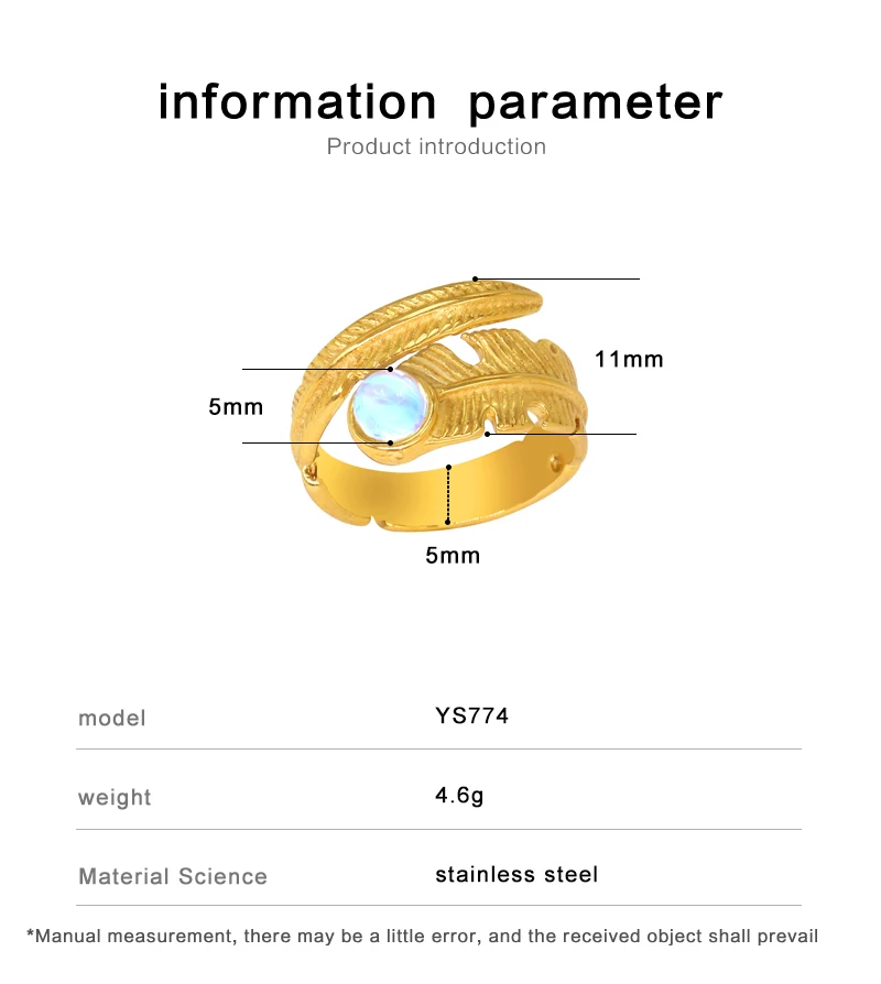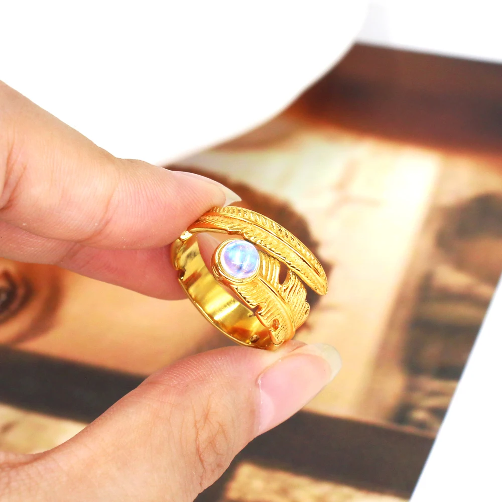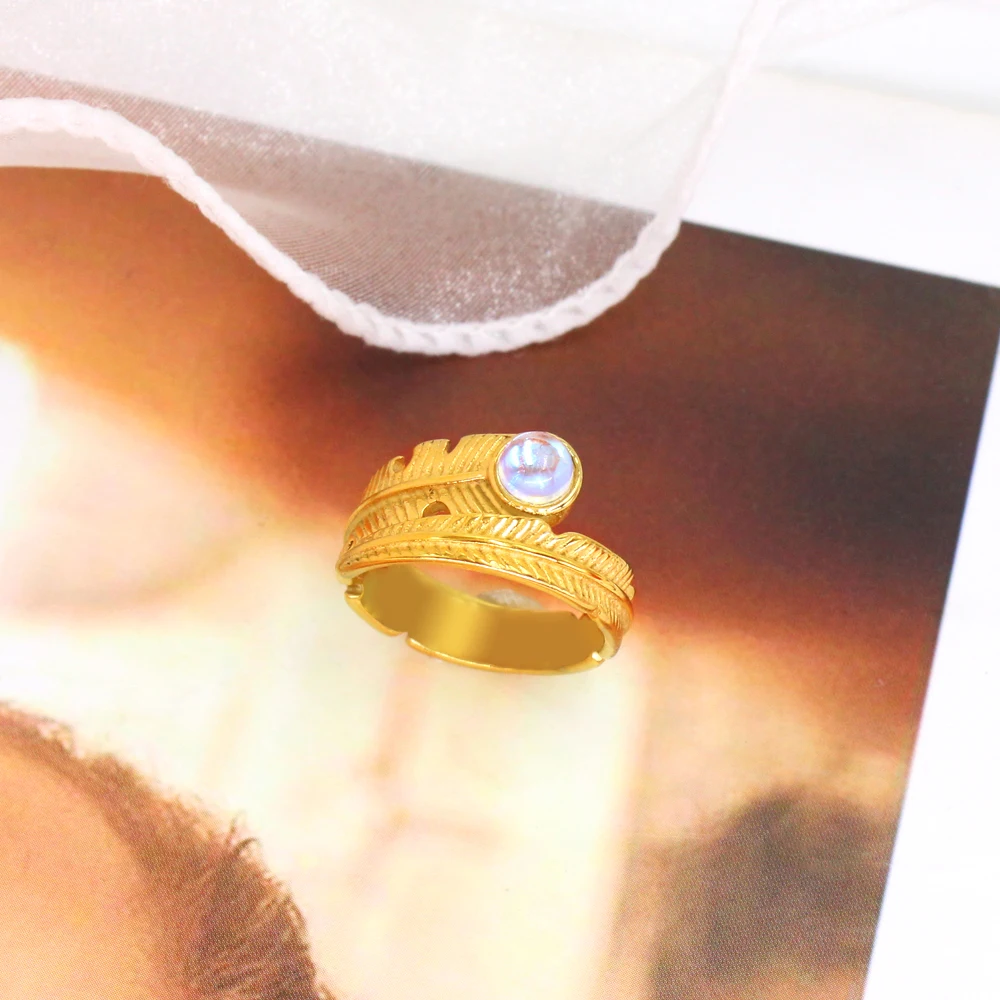 FANJIN Cubic Zirconia Metal Stainless Steel Waterproof Feather Fashion Gold Color Ring for Women Charm Stylish Jewelry Bijoux