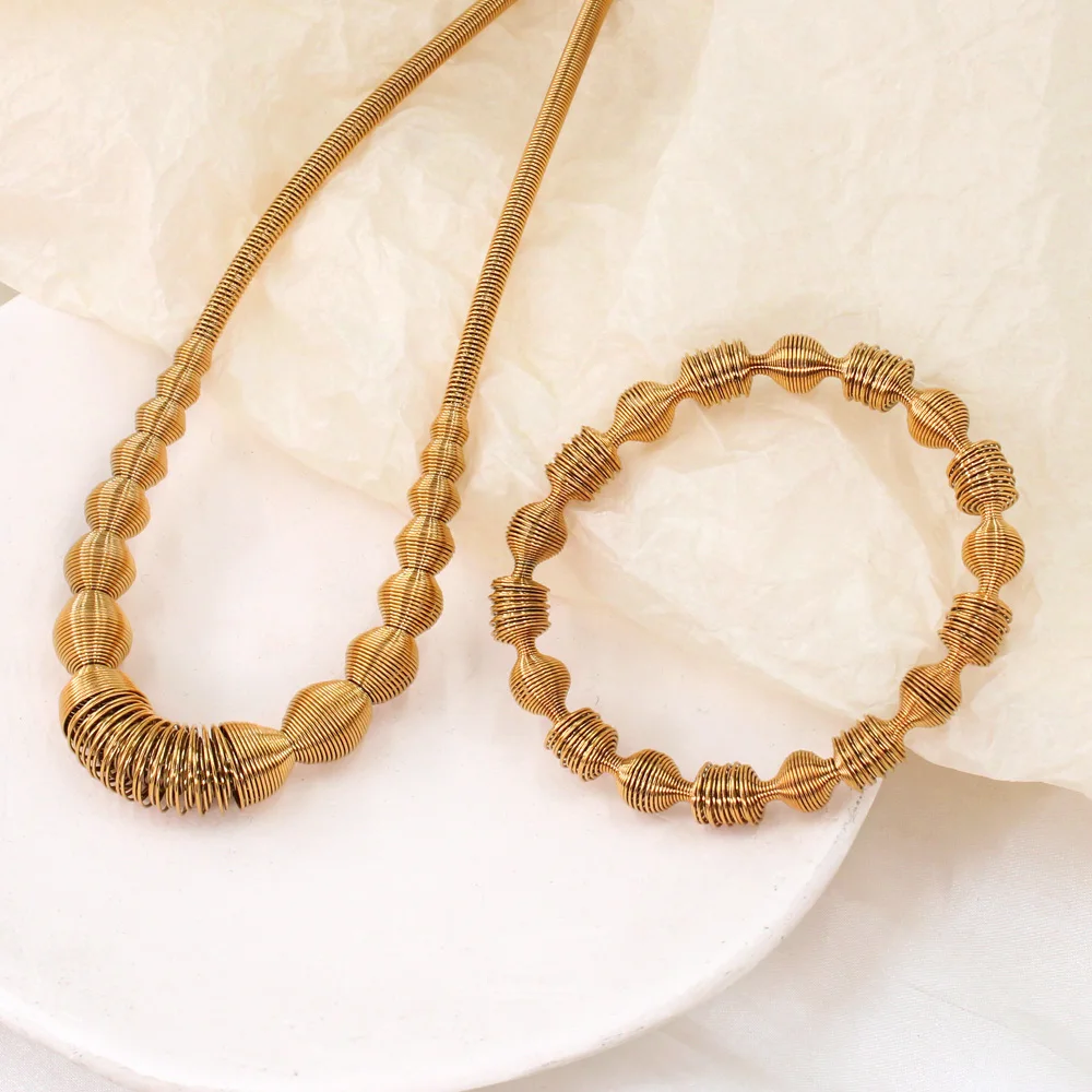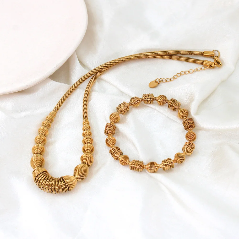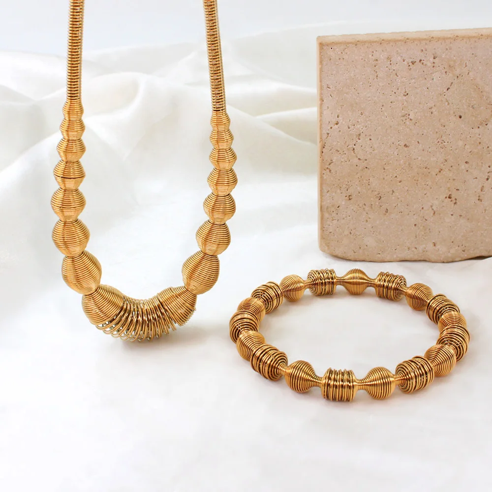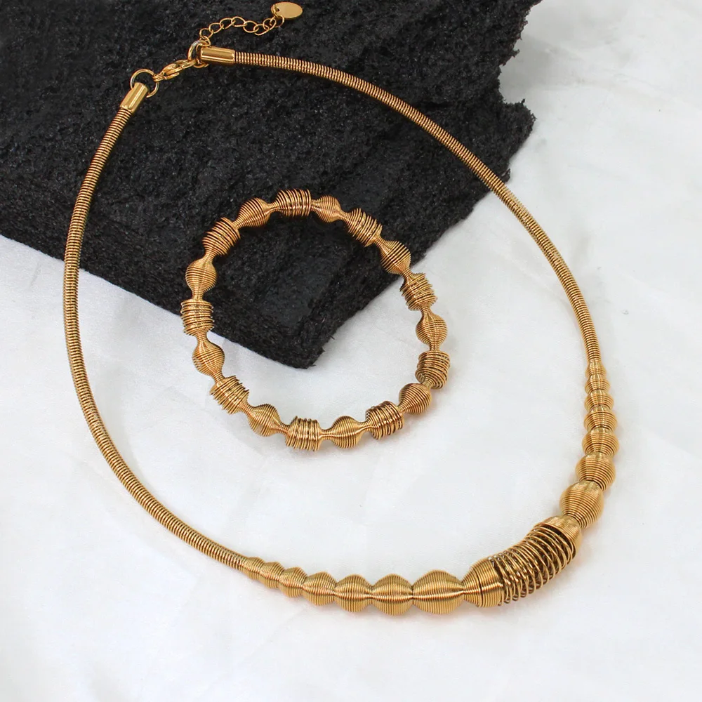 FANJIN Stylish Txetured Elastic Stainless Steel Jewelry Set Temperament Women's Gold Color Daily Wear Accessories Wholesale