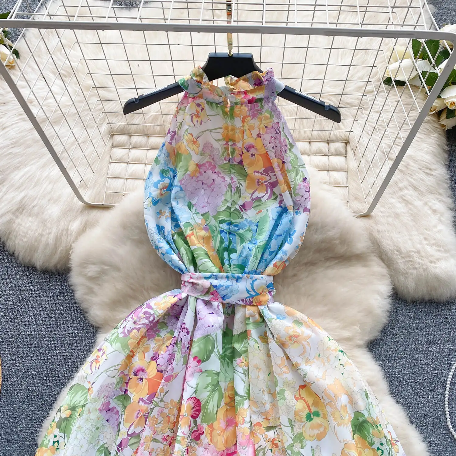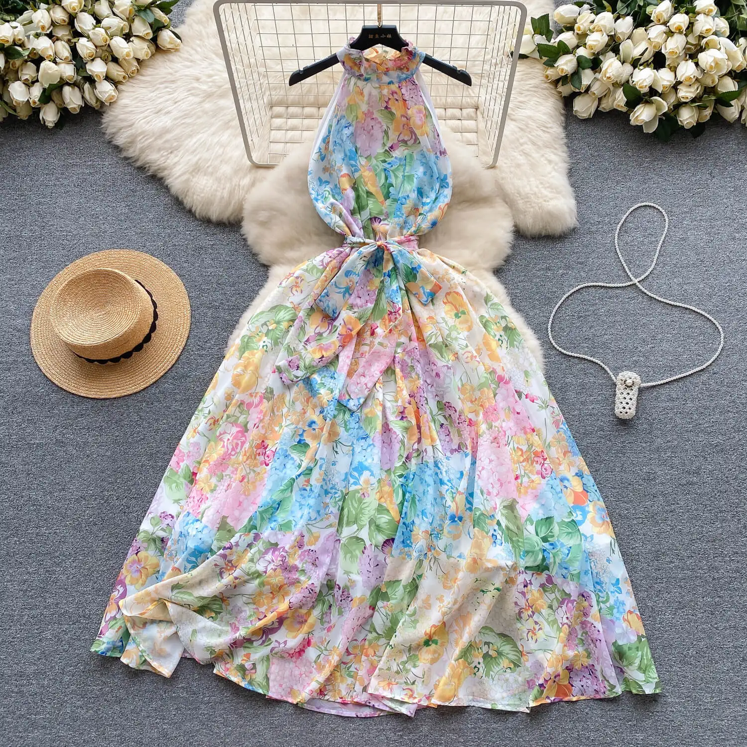 Fashion Beach Hanging Neck Women Slim Sleeveless Printed Tank Dresses Vacation Dresses