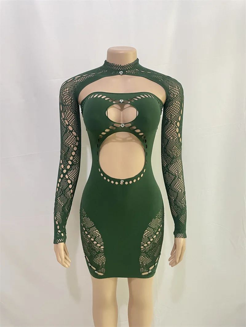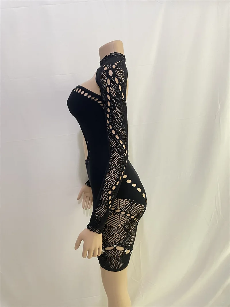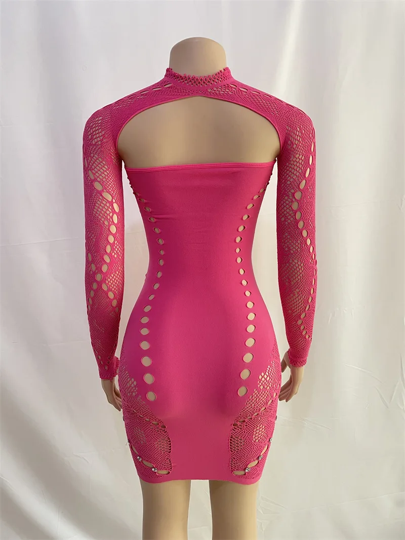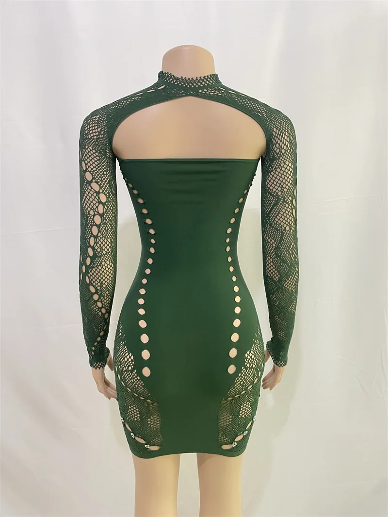 Fashion Club Diamond Long Sleeve Mesh Mini Dresses Stretchy Hollow Out Bodycon Fit Sexy Dress