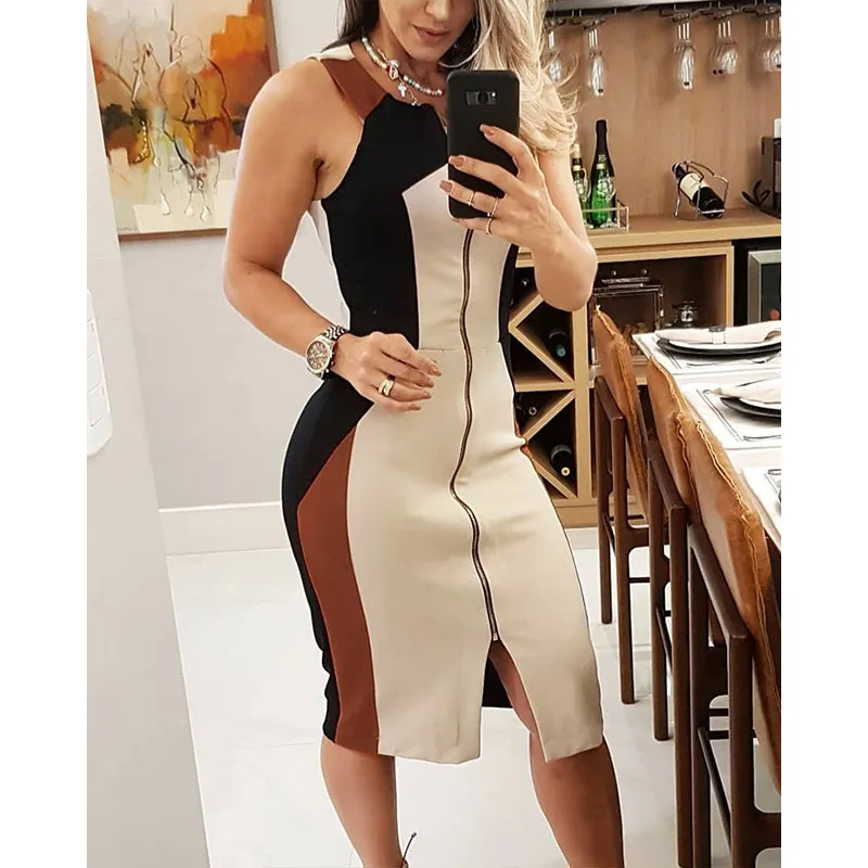 Fashion Colorblock Sleeveless Zipper Design Summer Dress Women Casual O-Neck Midi Weekend Dress