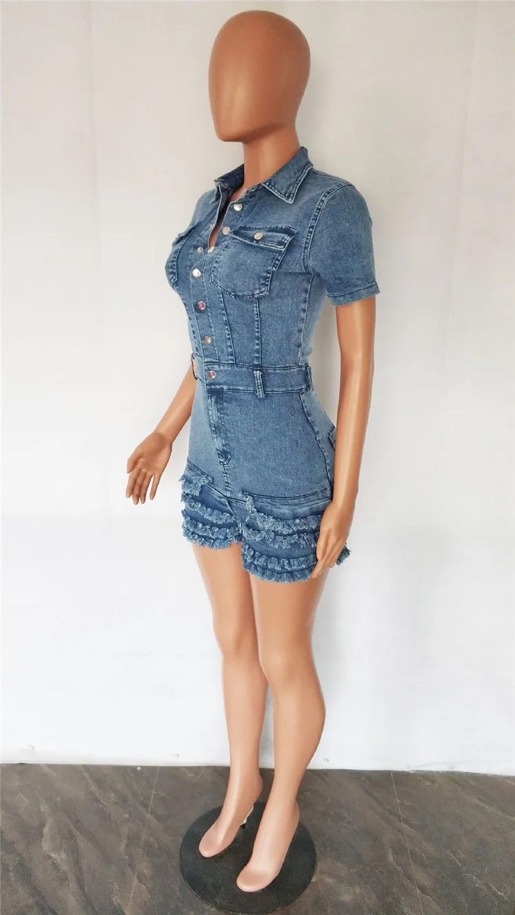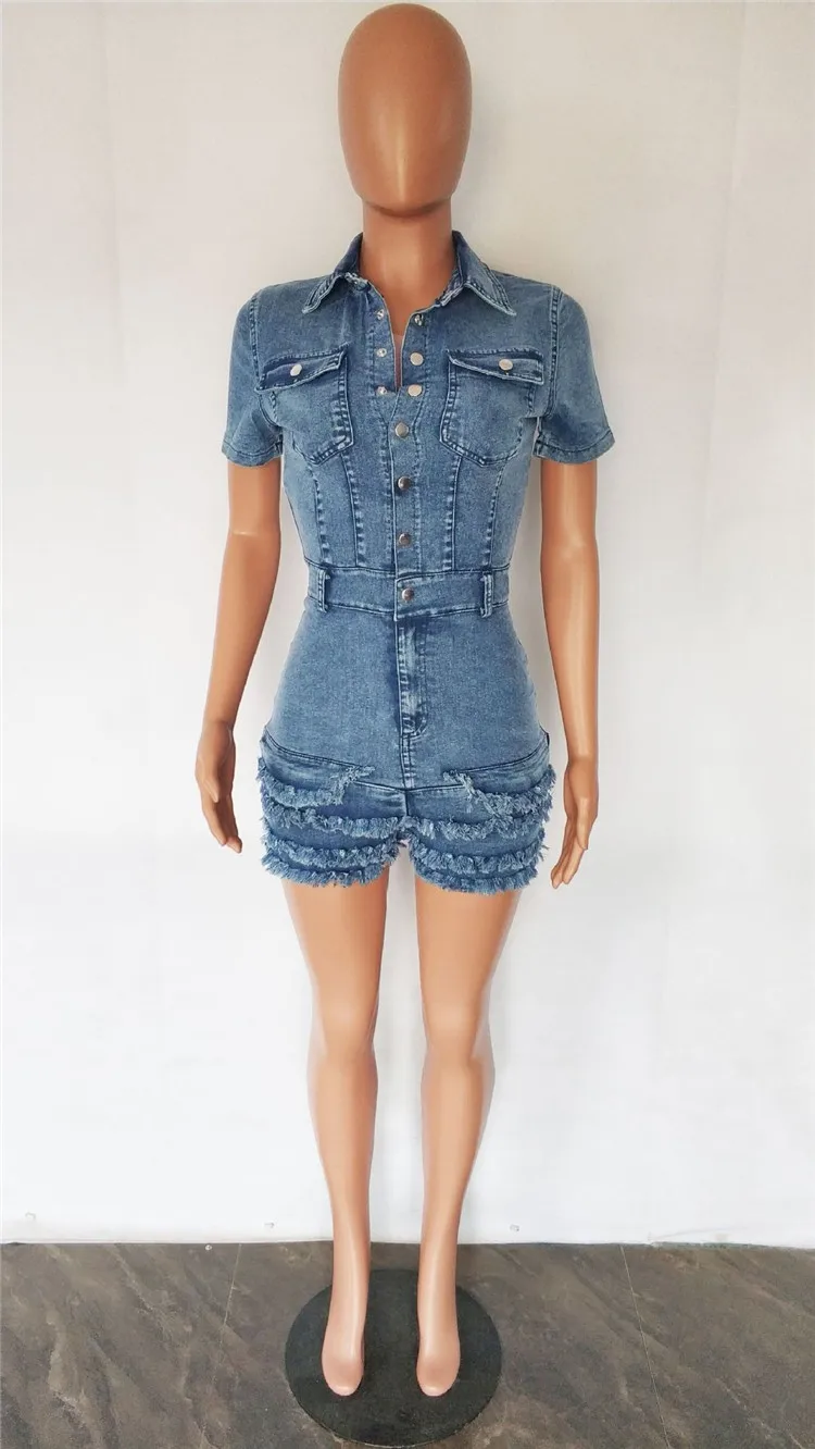 Fashion Denim Fur Tassels Shorts Rompers Women Turndown Collar Short Sleeve Slim Jumpsuits Casual Solid Button Overalls