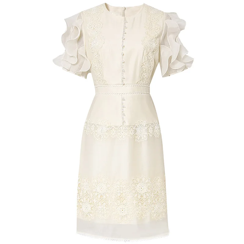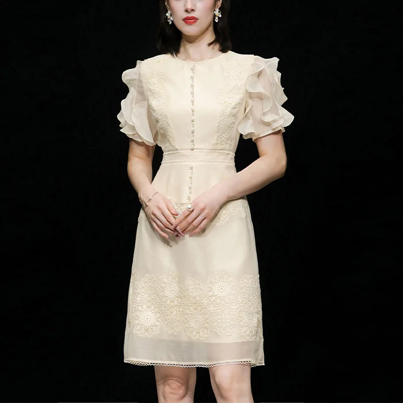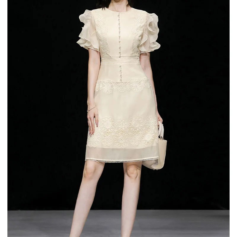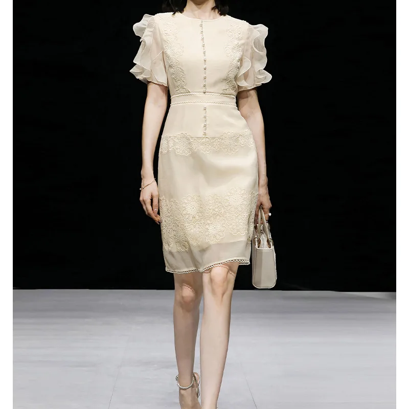 Fashion Design New Women's Clothing 2022 Summer Round Neck Lace Stitching Short Fashion Waist Casual Dress