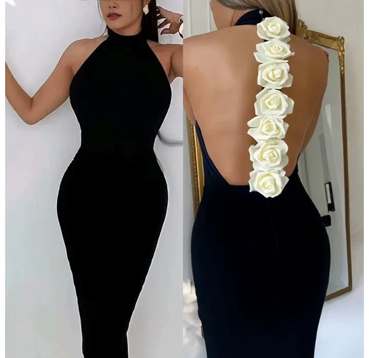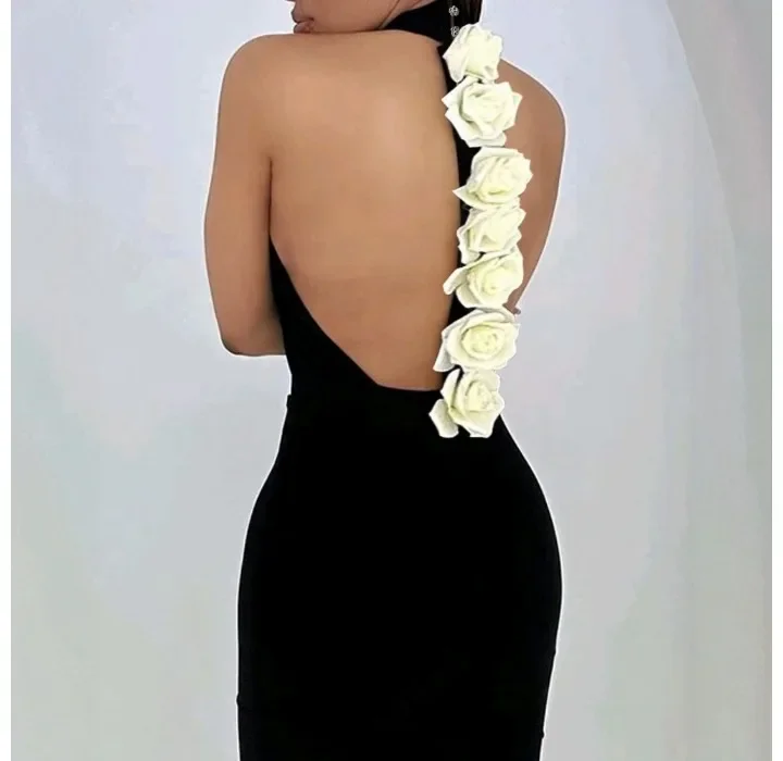 Fashion Evening Party Dresses Woman New Sexy Elegant Rose Detail Mock Neck Sleeveless Backless Bodycon Party Dress 2025 Autumn