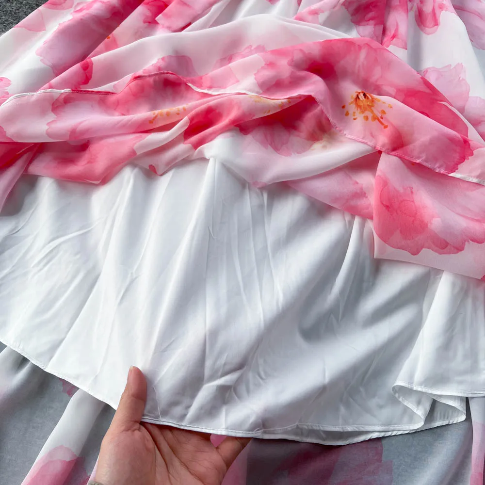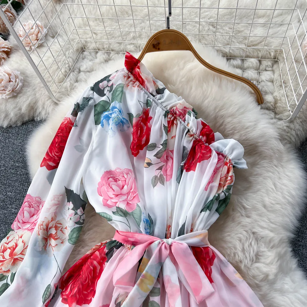 Fashion Floral Maxi Dress Women Summer One Shoulder Puff Sleeve Sun Beach Chiffon Casual Long Dresses Women 2023