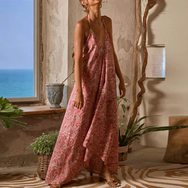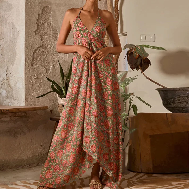 Fashion Hollow Out Backless Party Dress Bohemian Sleeveless Suspender Sexy Dress Vintage Floral Print Halter Women's Long Dress