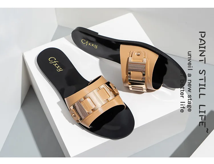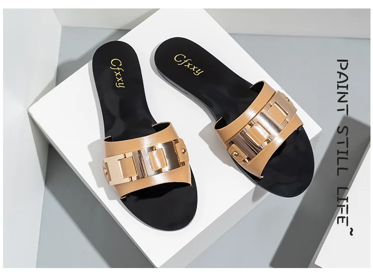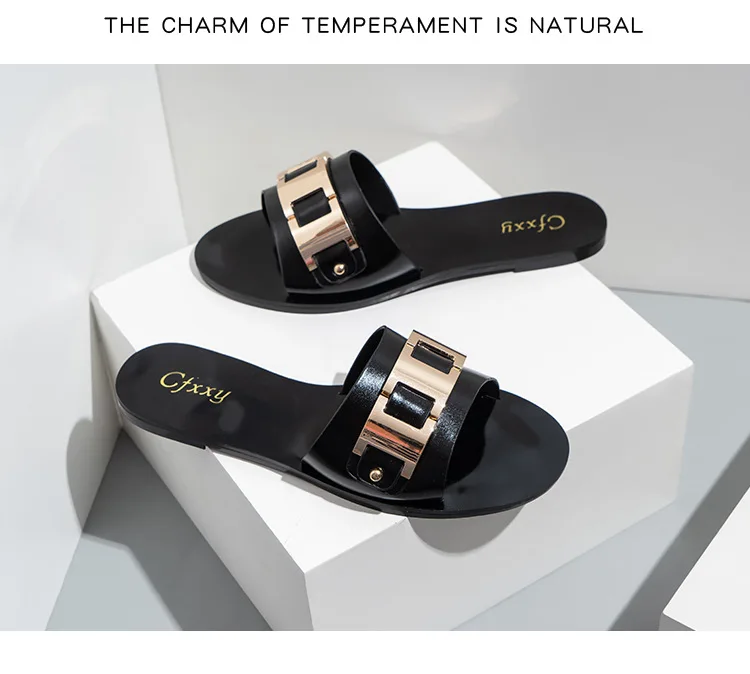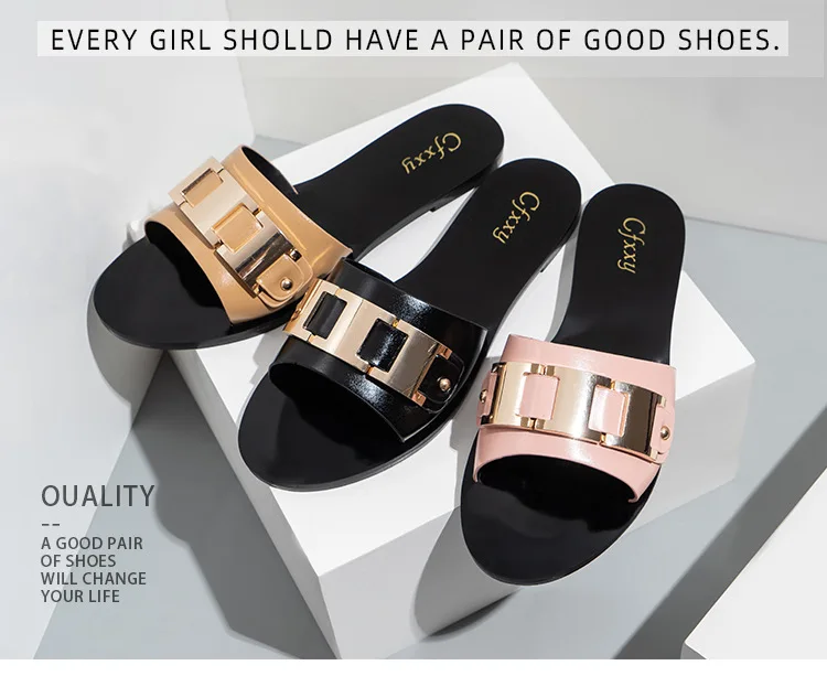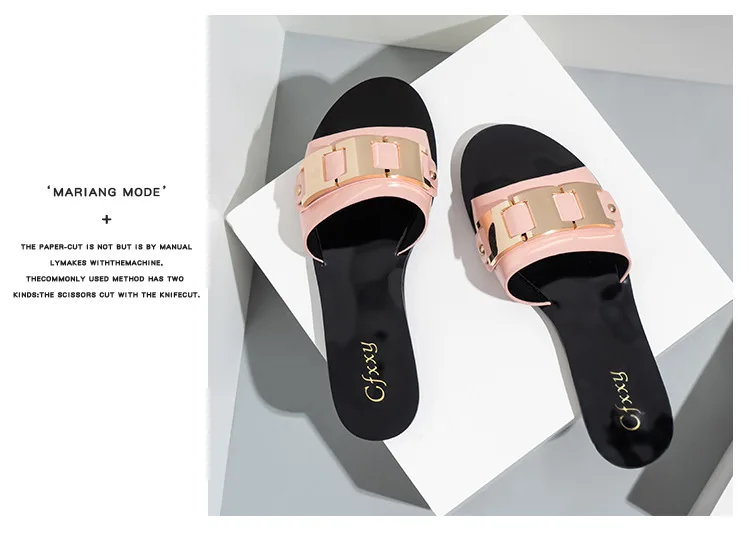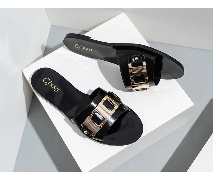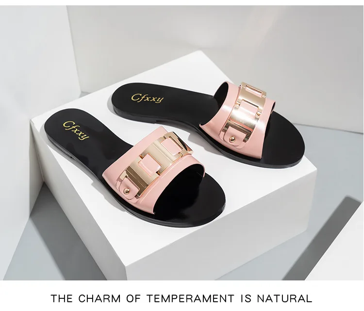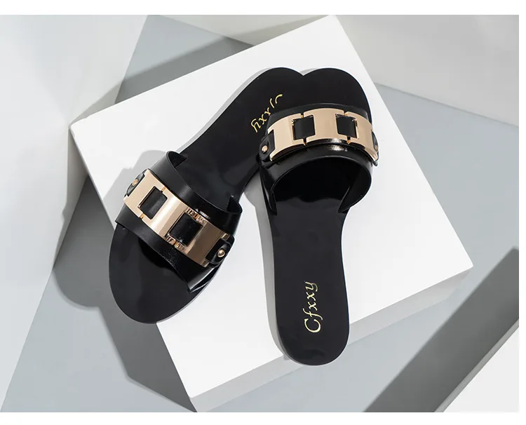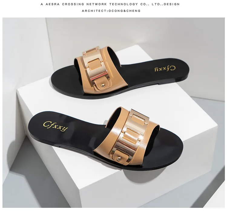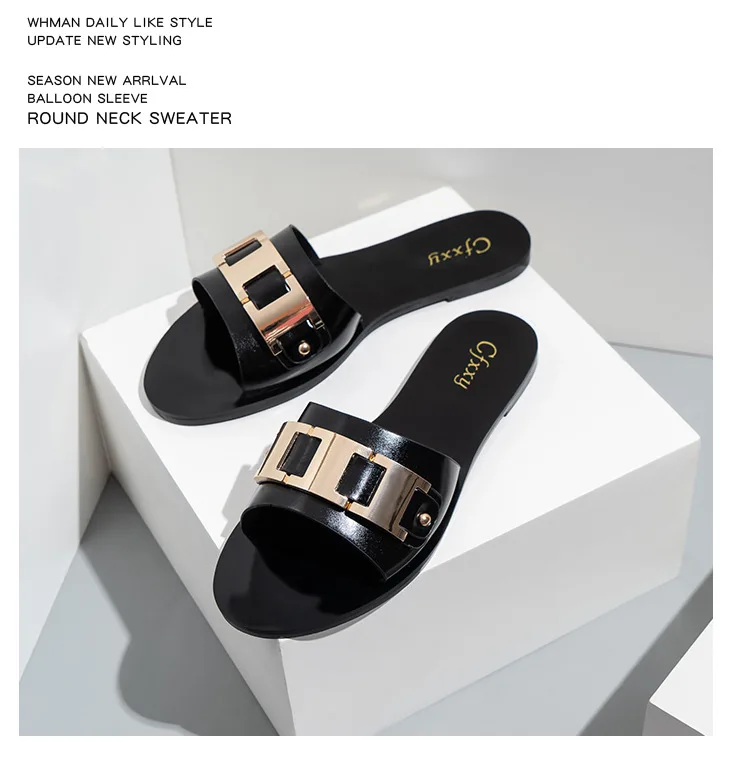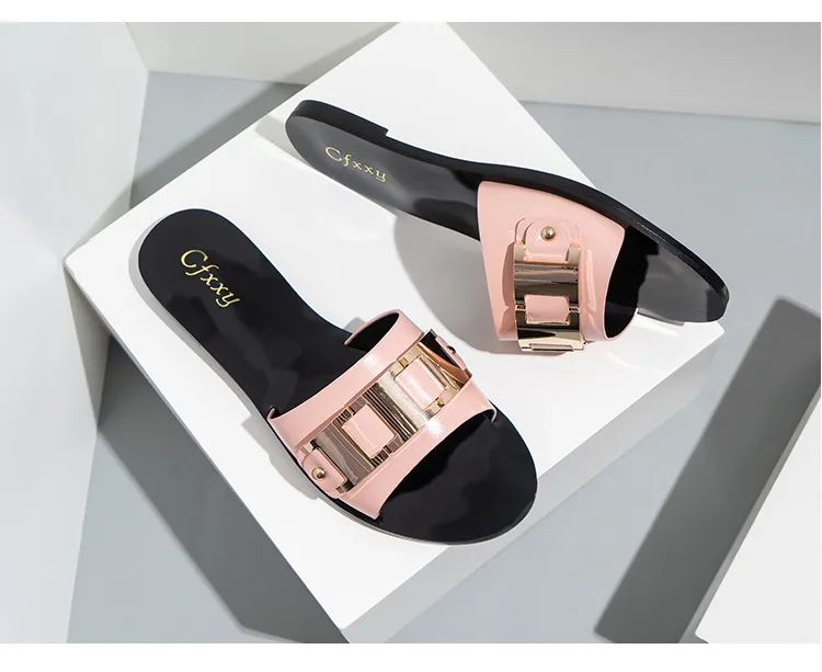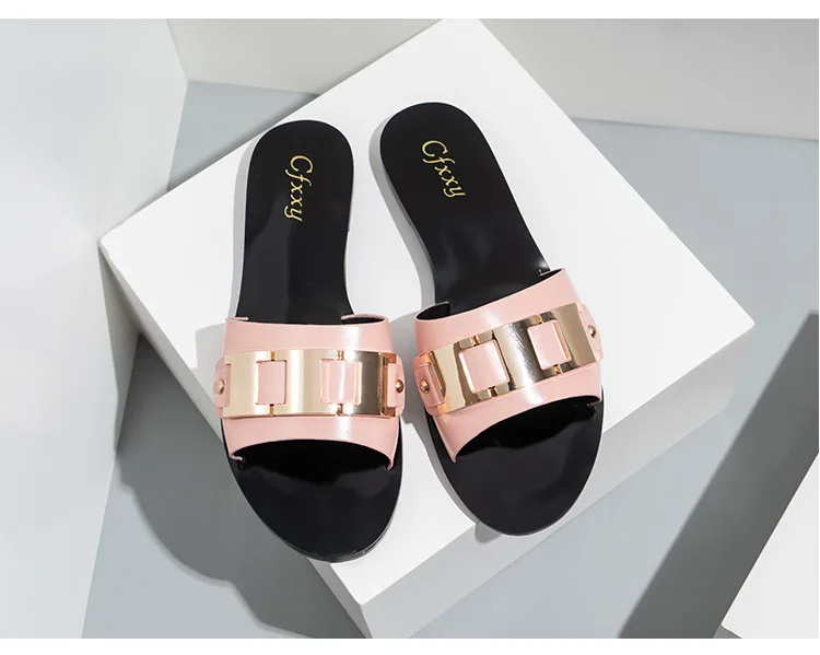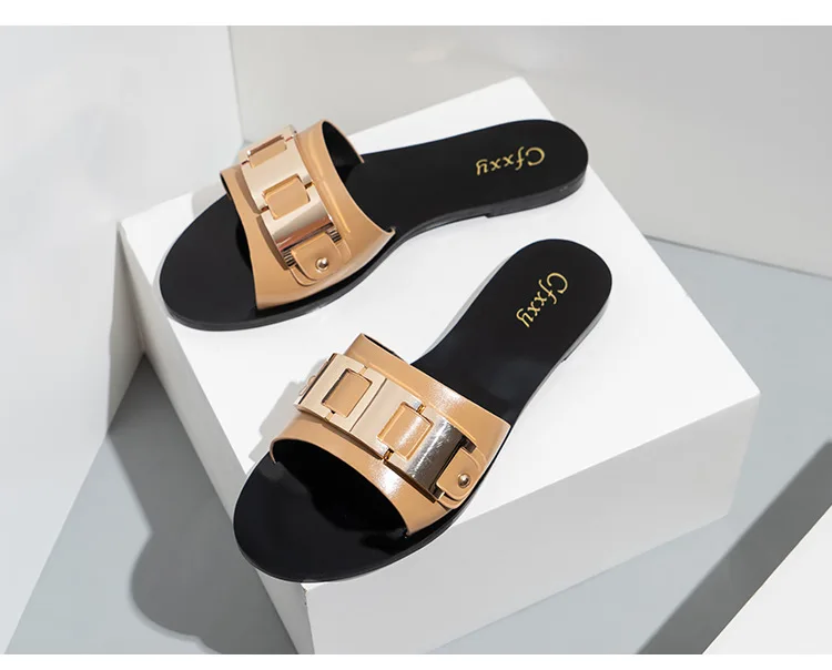 Fashion Metal Buckle Women Slippers PU Solid Mirror Casual Summer Female Flip Flops Sandals