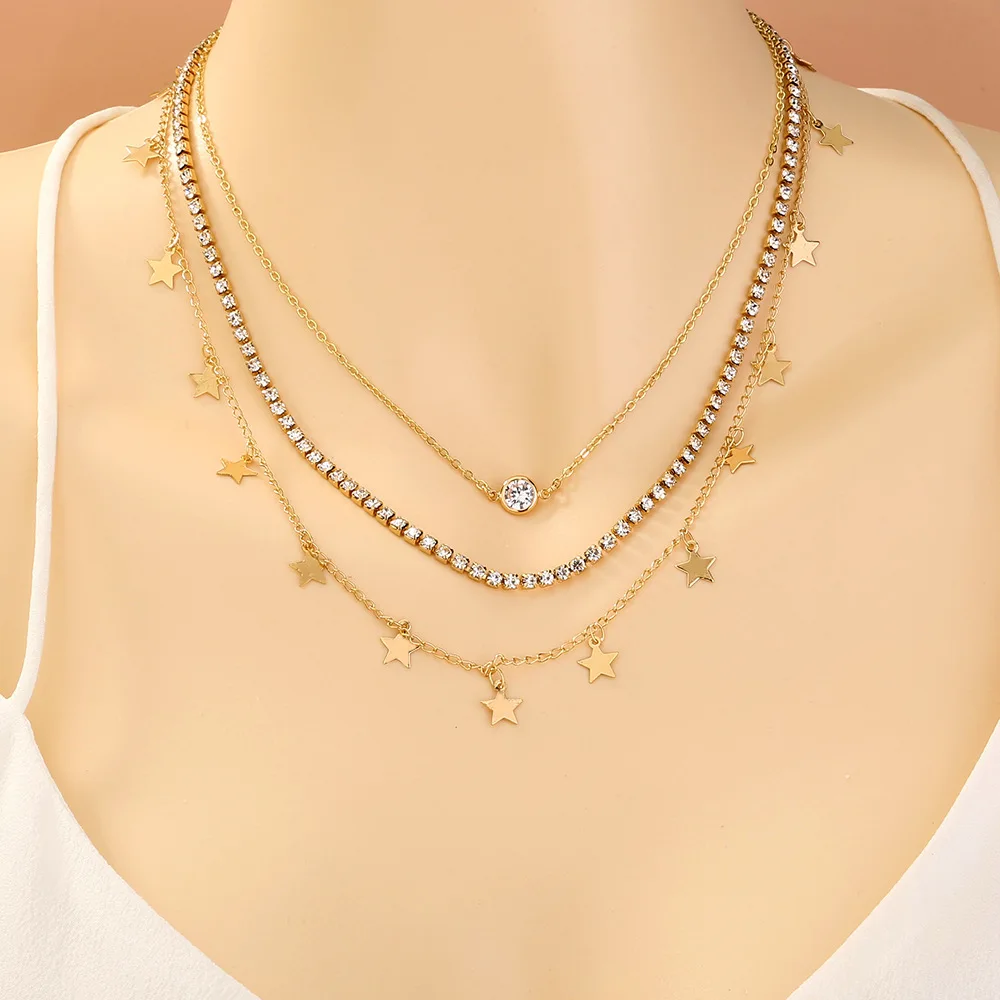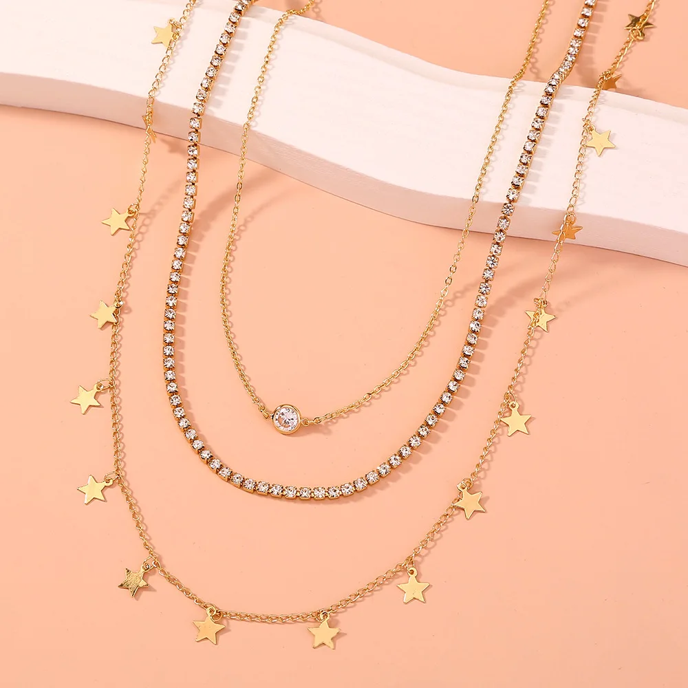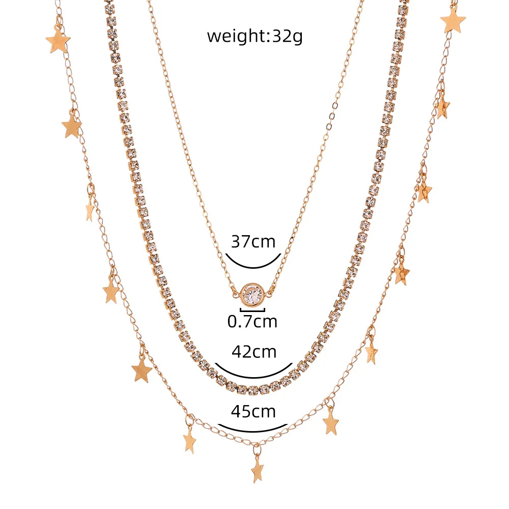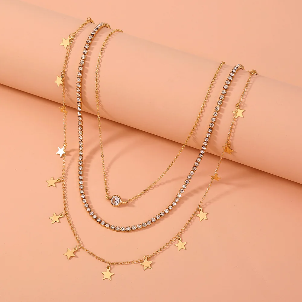 Fashion New Retro multilayer overlay alloy necklace gold star tassel pendant zircon inlaid O-shaped women's long chain