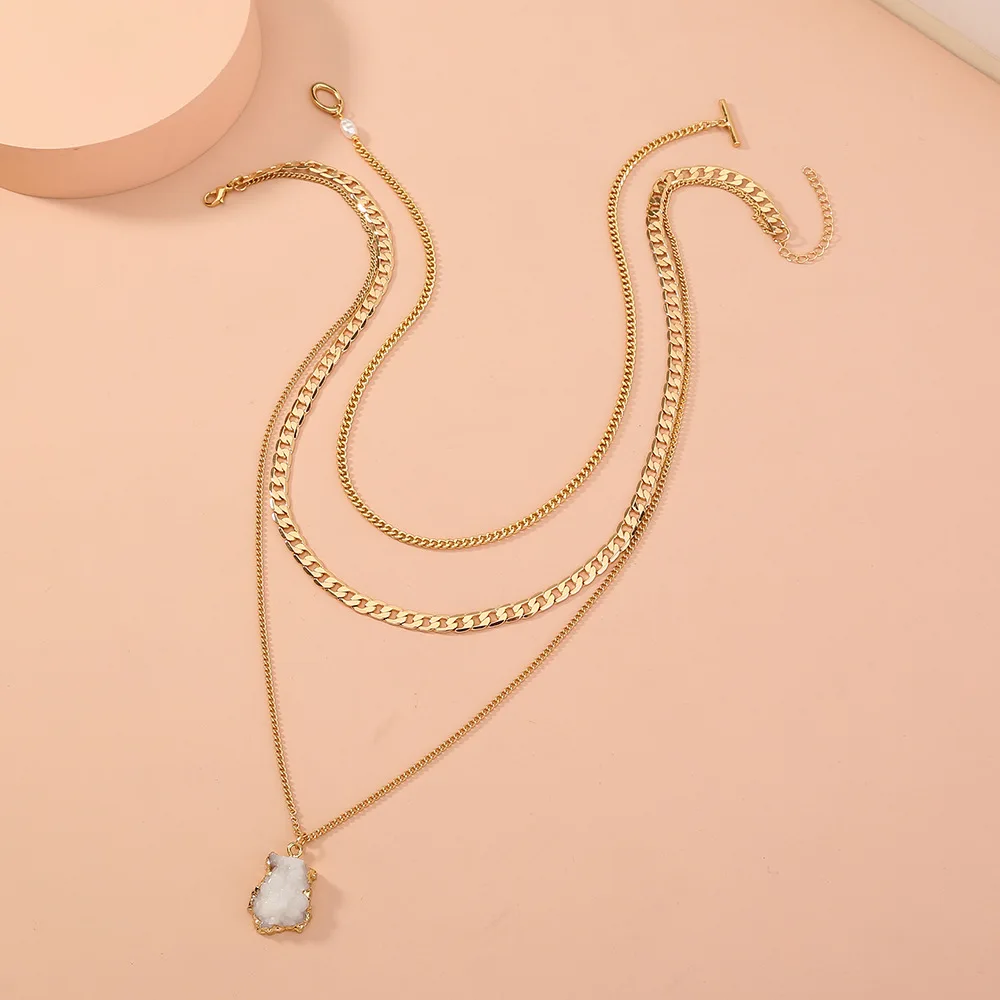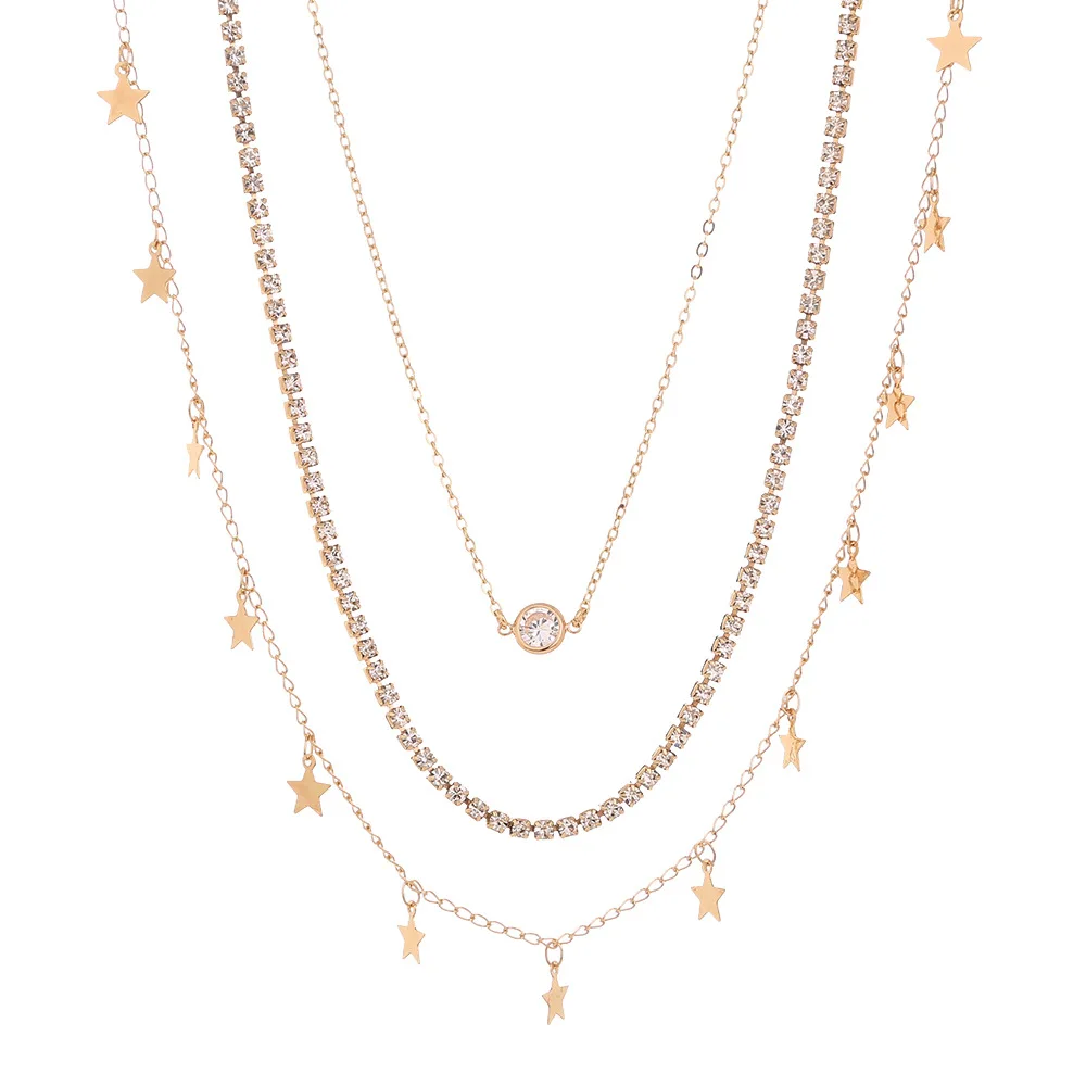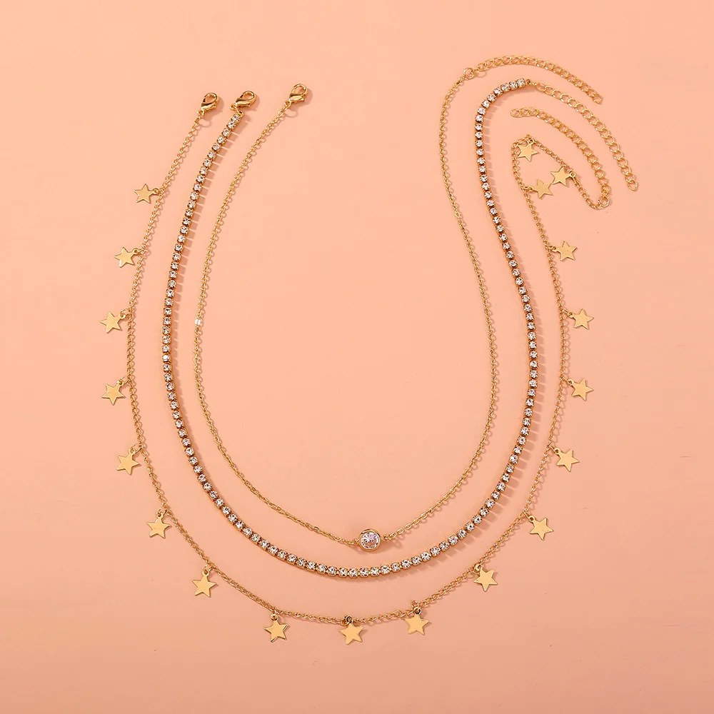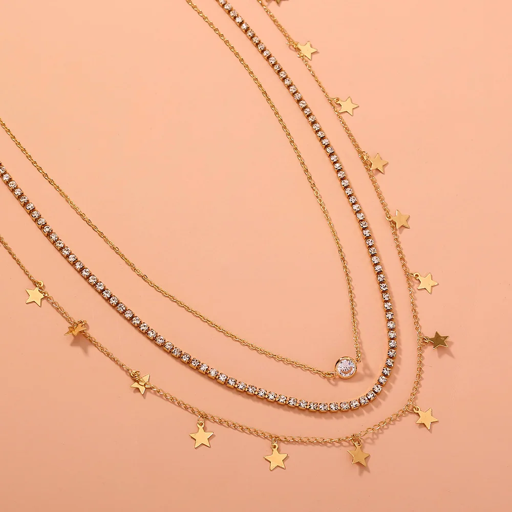 Fashion New Retro multilayer overlay alloy necklace gold star tassel pendant zircon inlaid O-shaped women's long chain