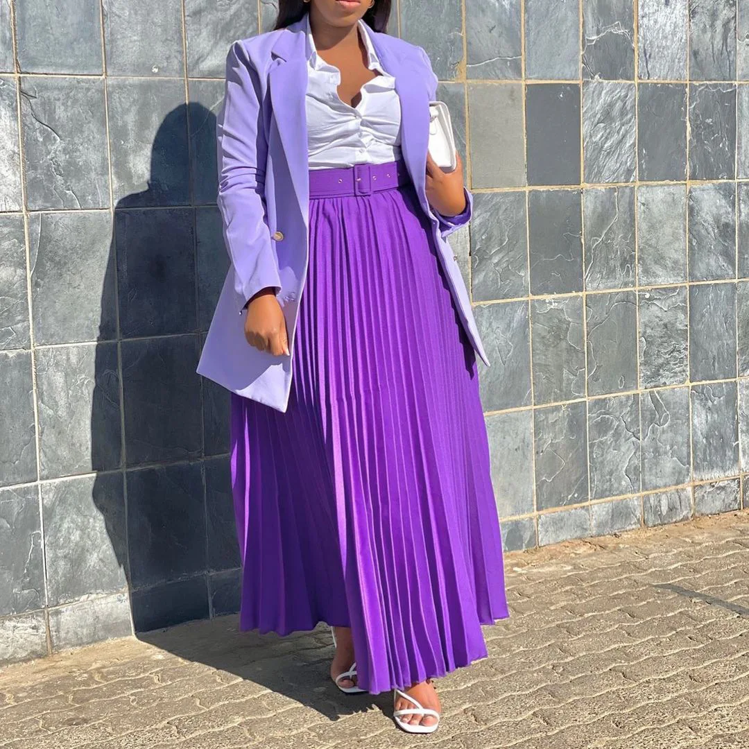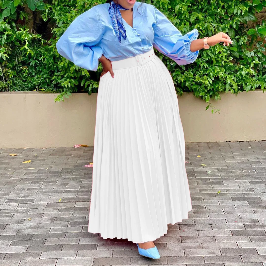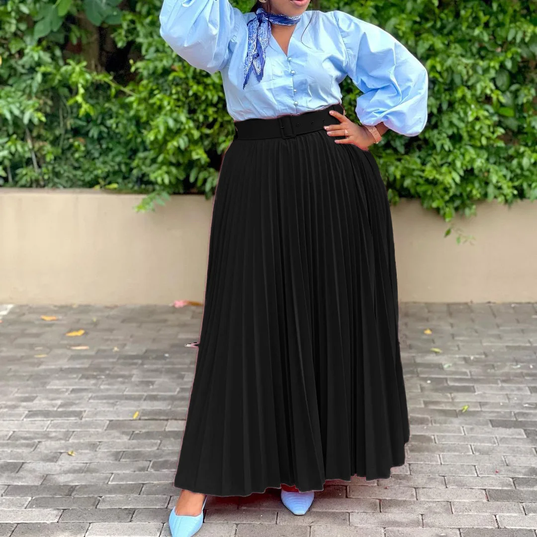 Fashion Pleated Elastic Waist Maxi Skirt Women Solid With Belt 2023