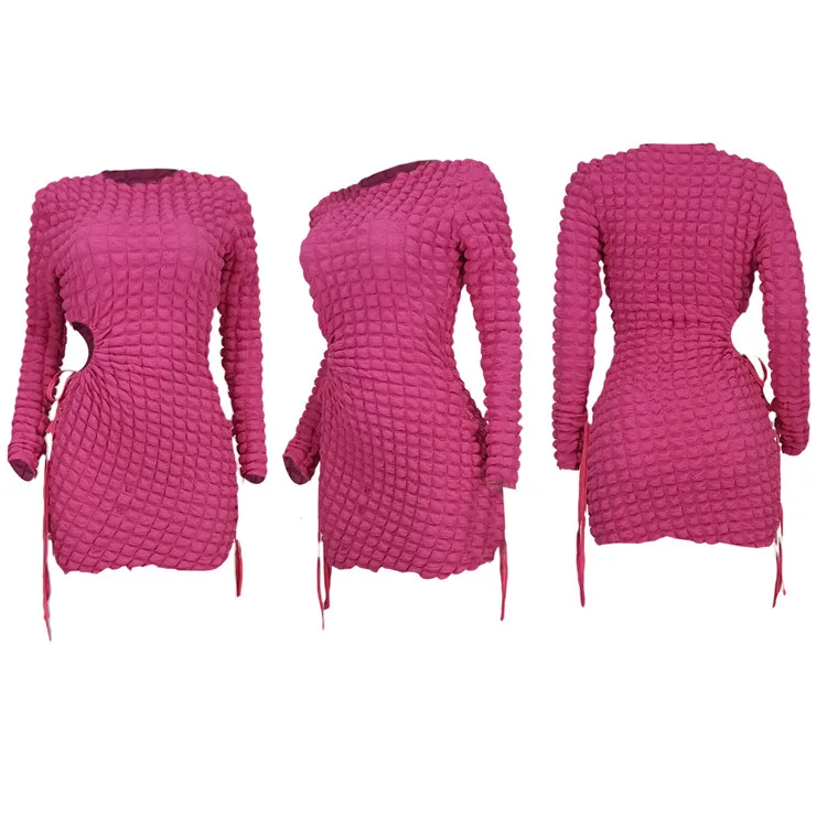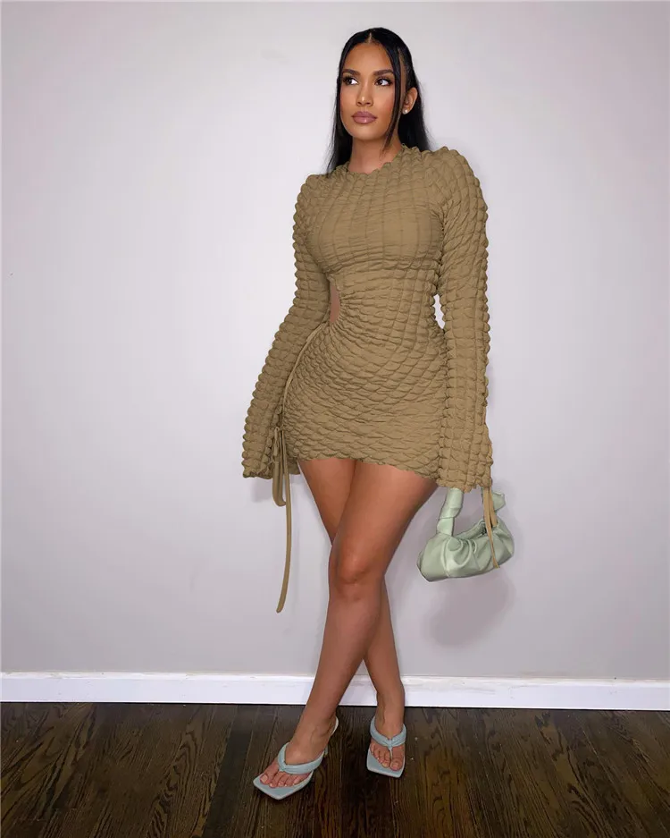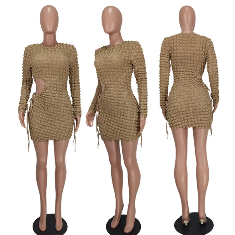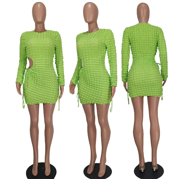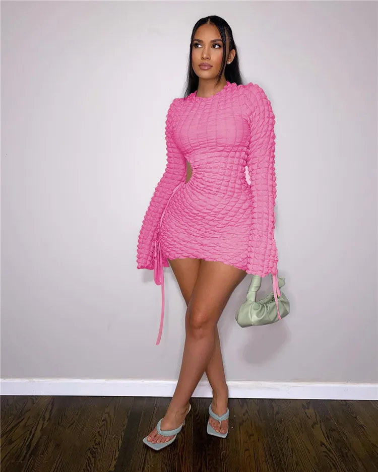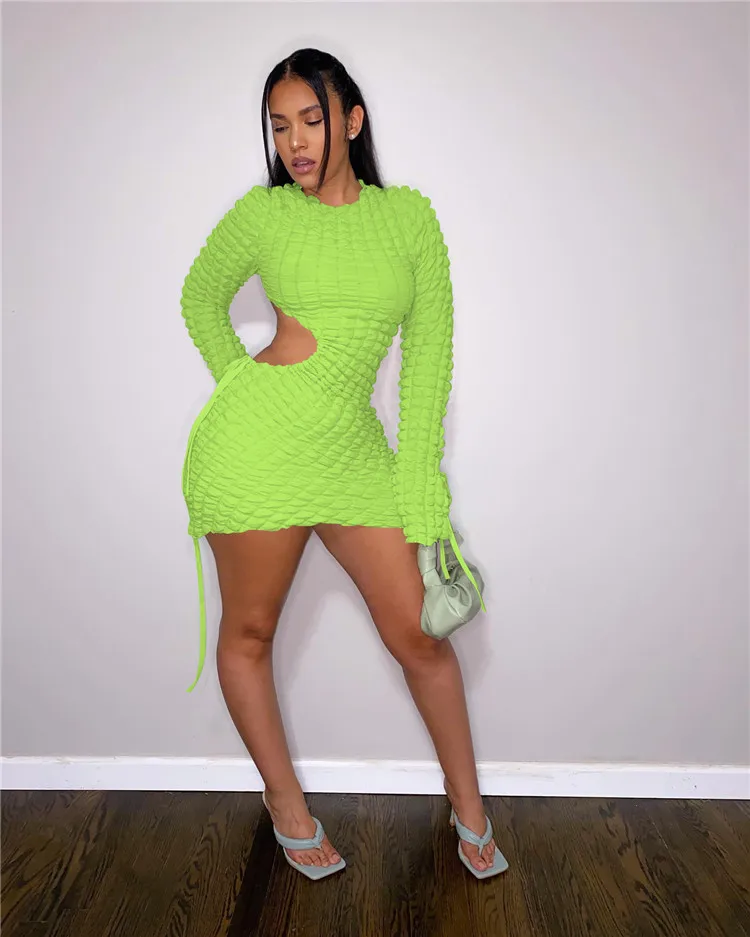 Fashion Puff Fabric Mini Bodycon Dress for Nightclub Hollow Out Drawstring Long Sleeves Round Neck Stretchy Party Dresses