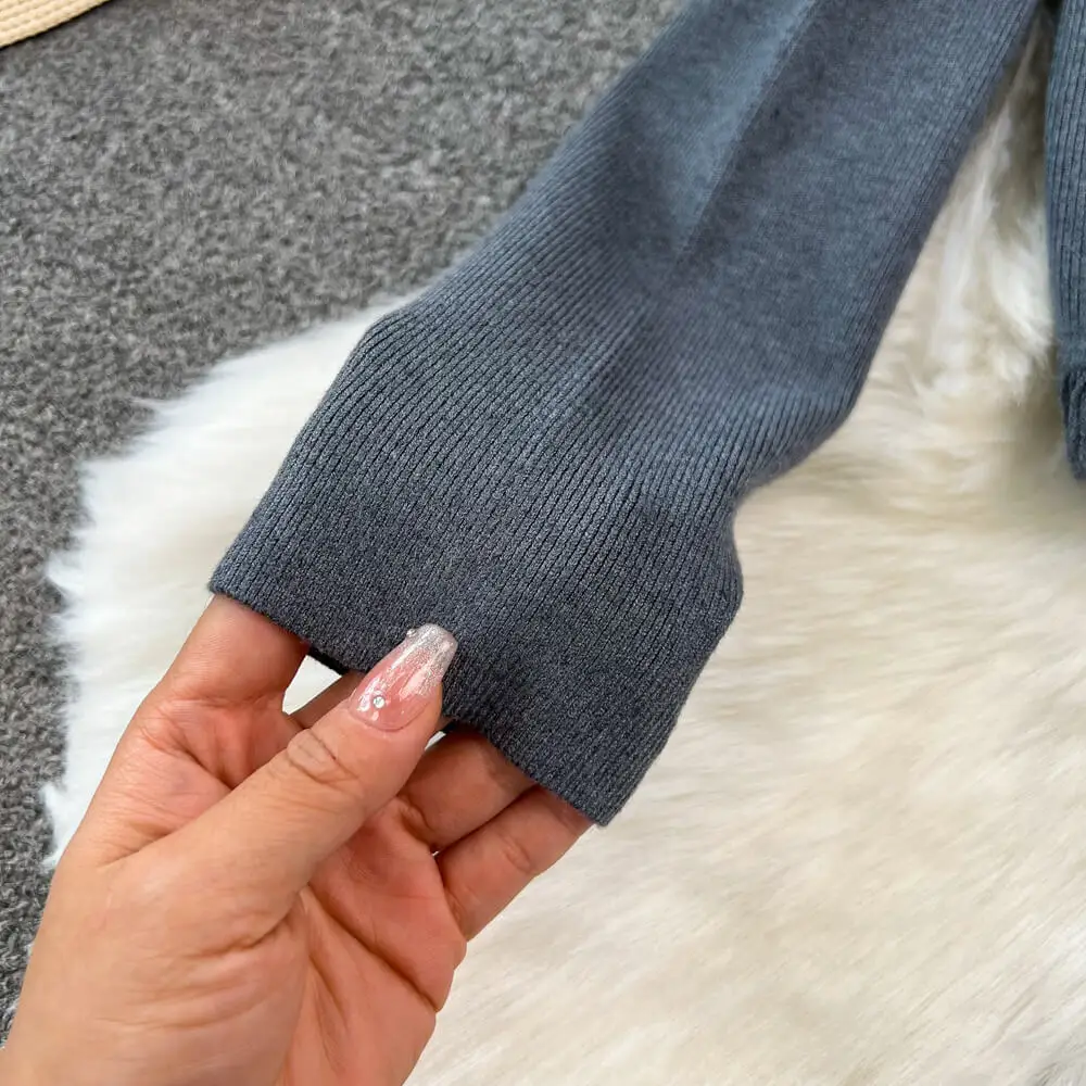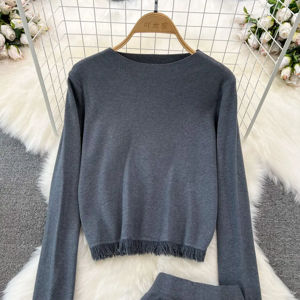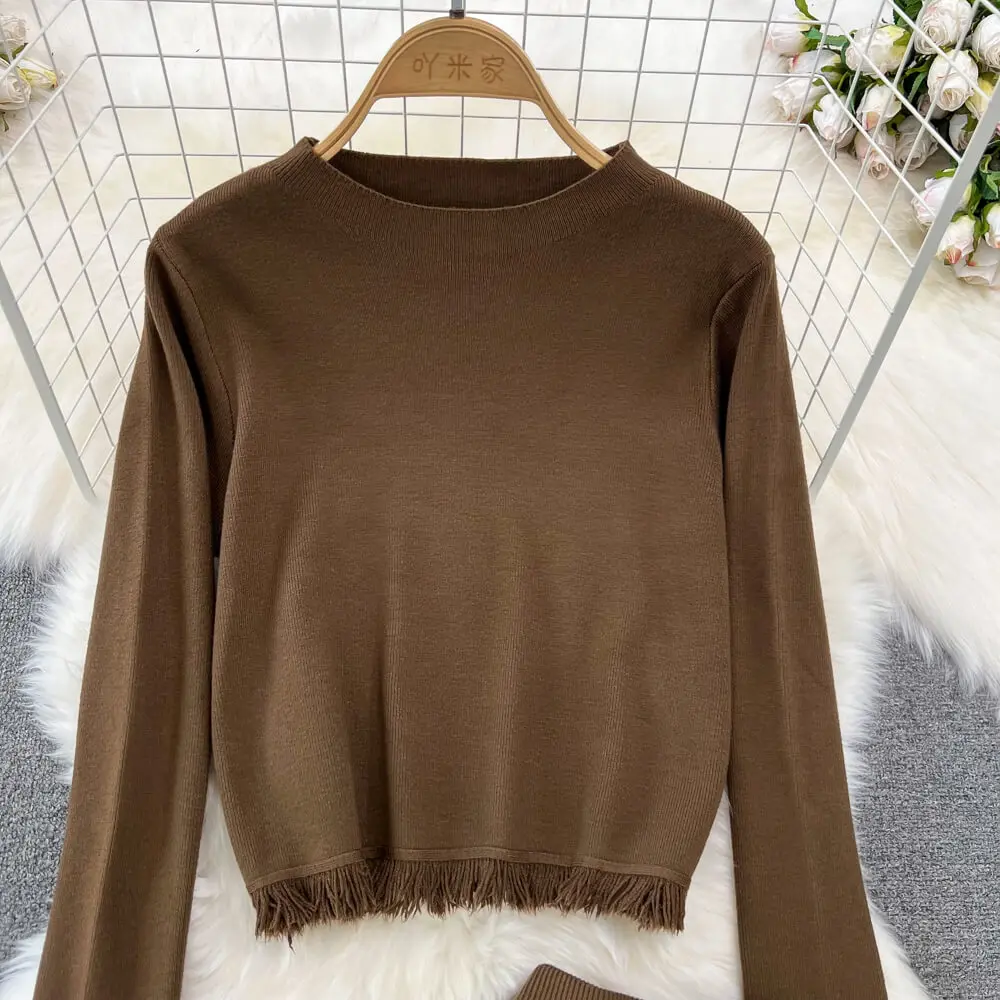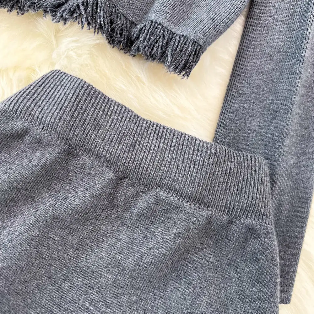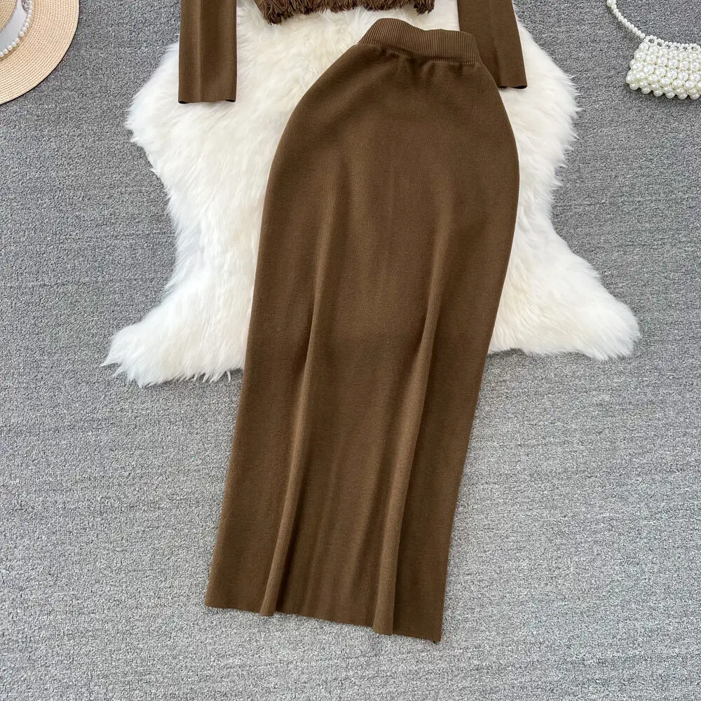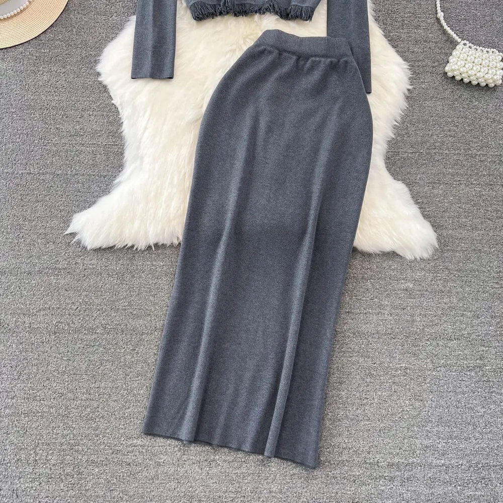 Fashion Set Women's Korean Long sleeved Round Neck and High Waist Skirt Tassel Knit Top Two Piece