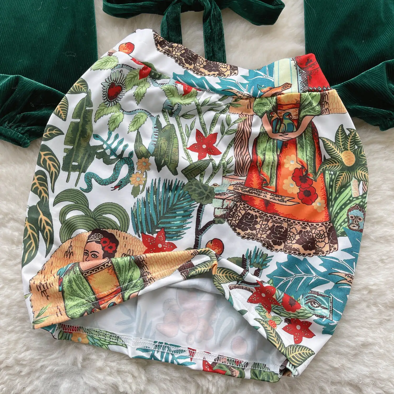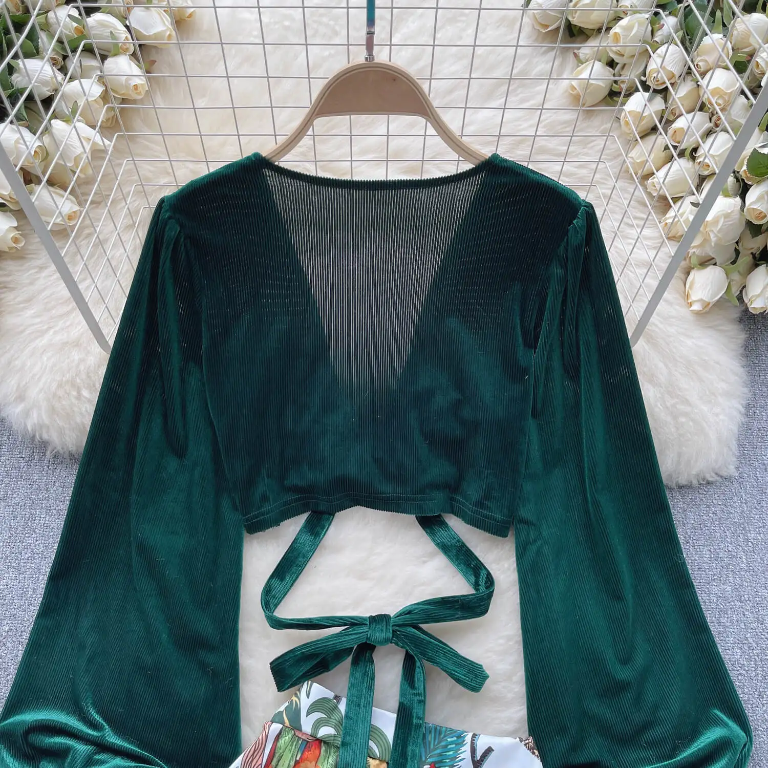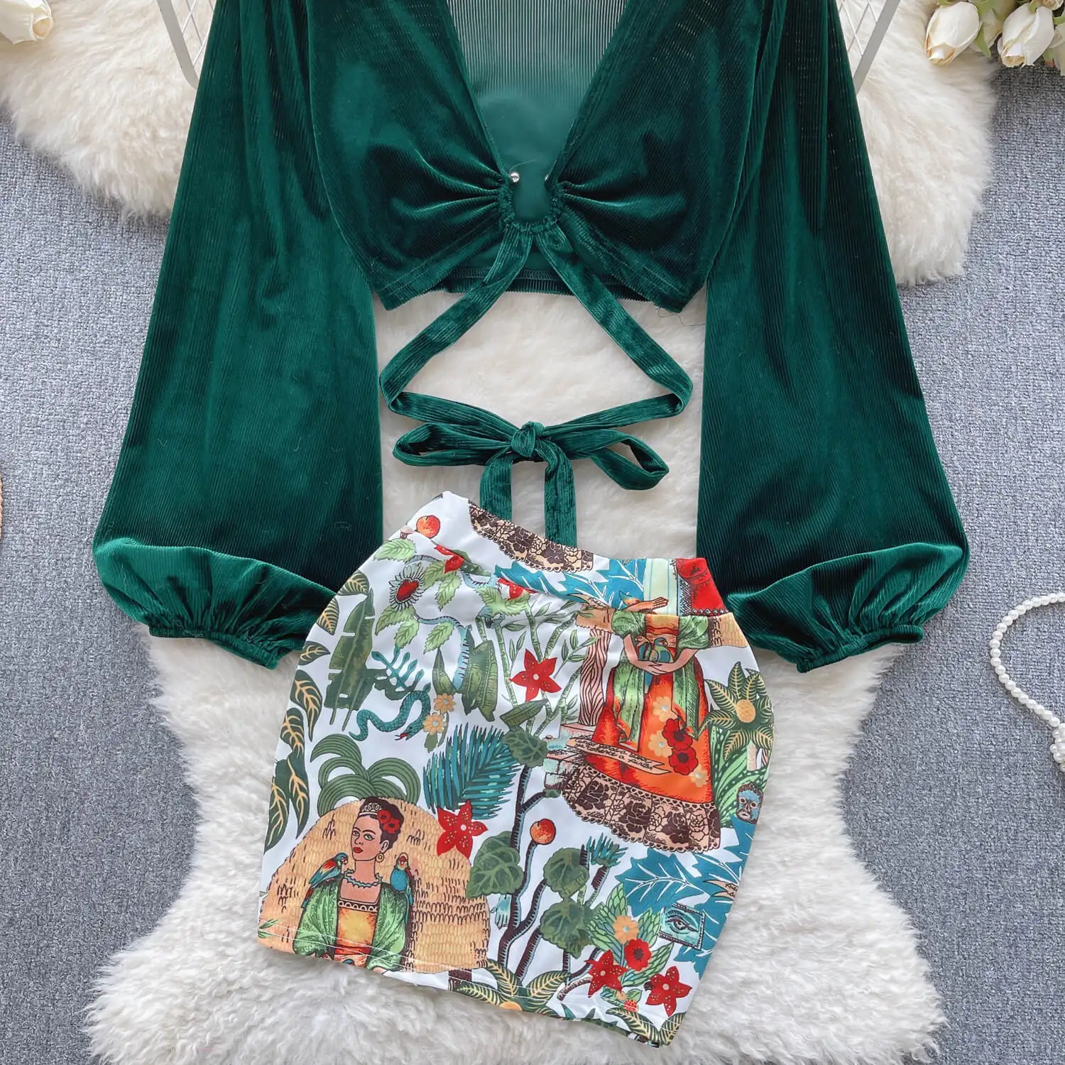 Fashion Set Women's Summer Bubble Sleeve Deep V-Neck Lace-Up Shirt + High Waist Floral Skirt