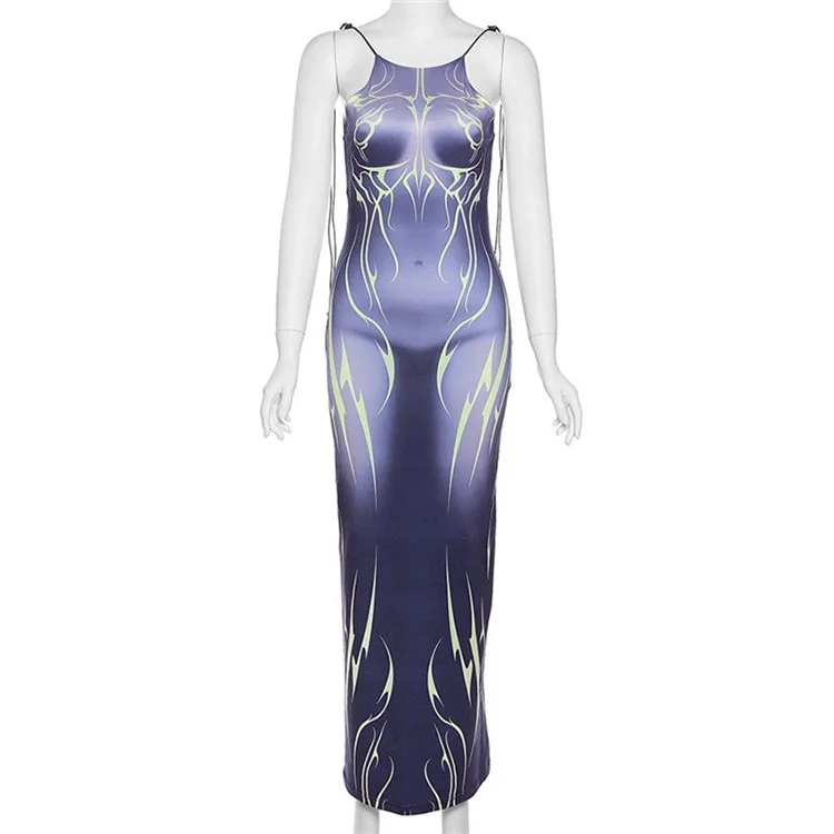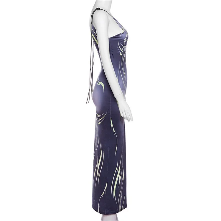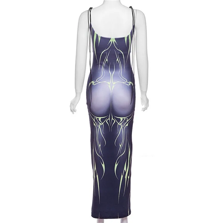 Adjustable Spaghetti Straps Bodycon Long Dress Women Sexy Backless Print Party Club Dress