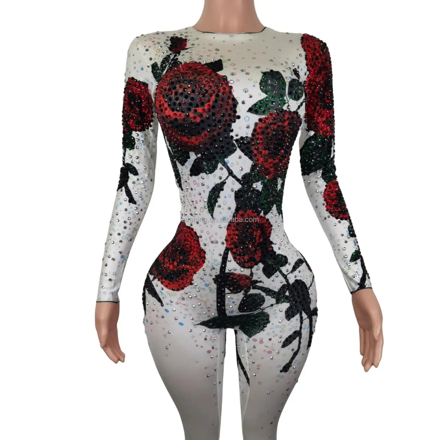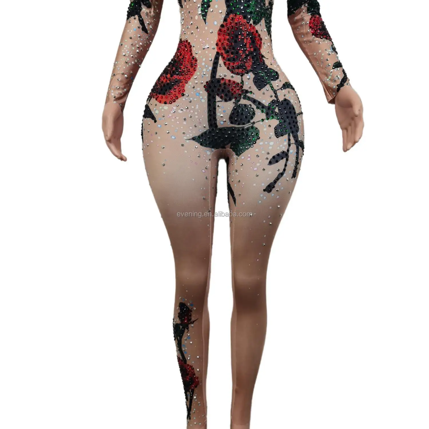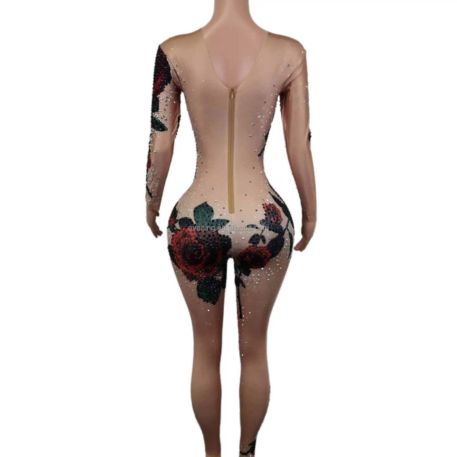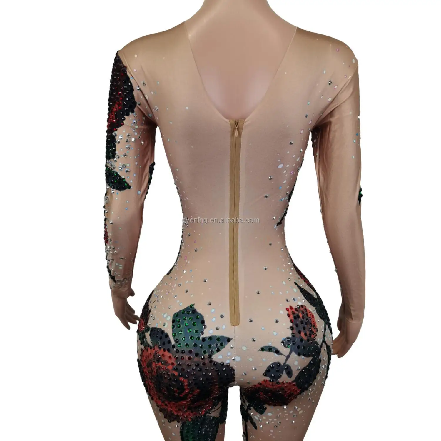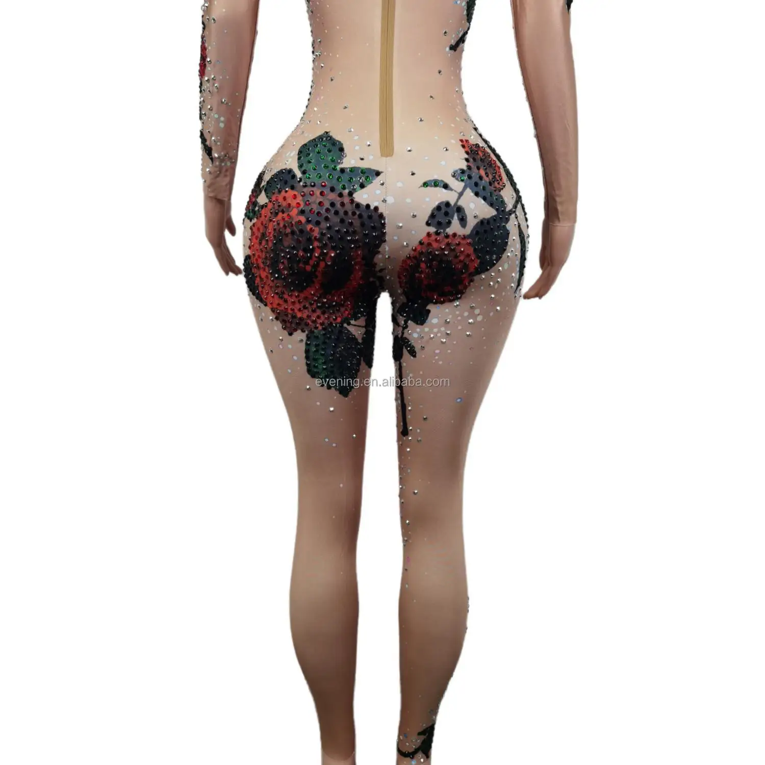 Fashion Sexy Flower Rhinestone Bodysuits Slim Fit Stage Dancer Leotard Night Club Ladies Rompers Women Party One Piece Jumpsuit