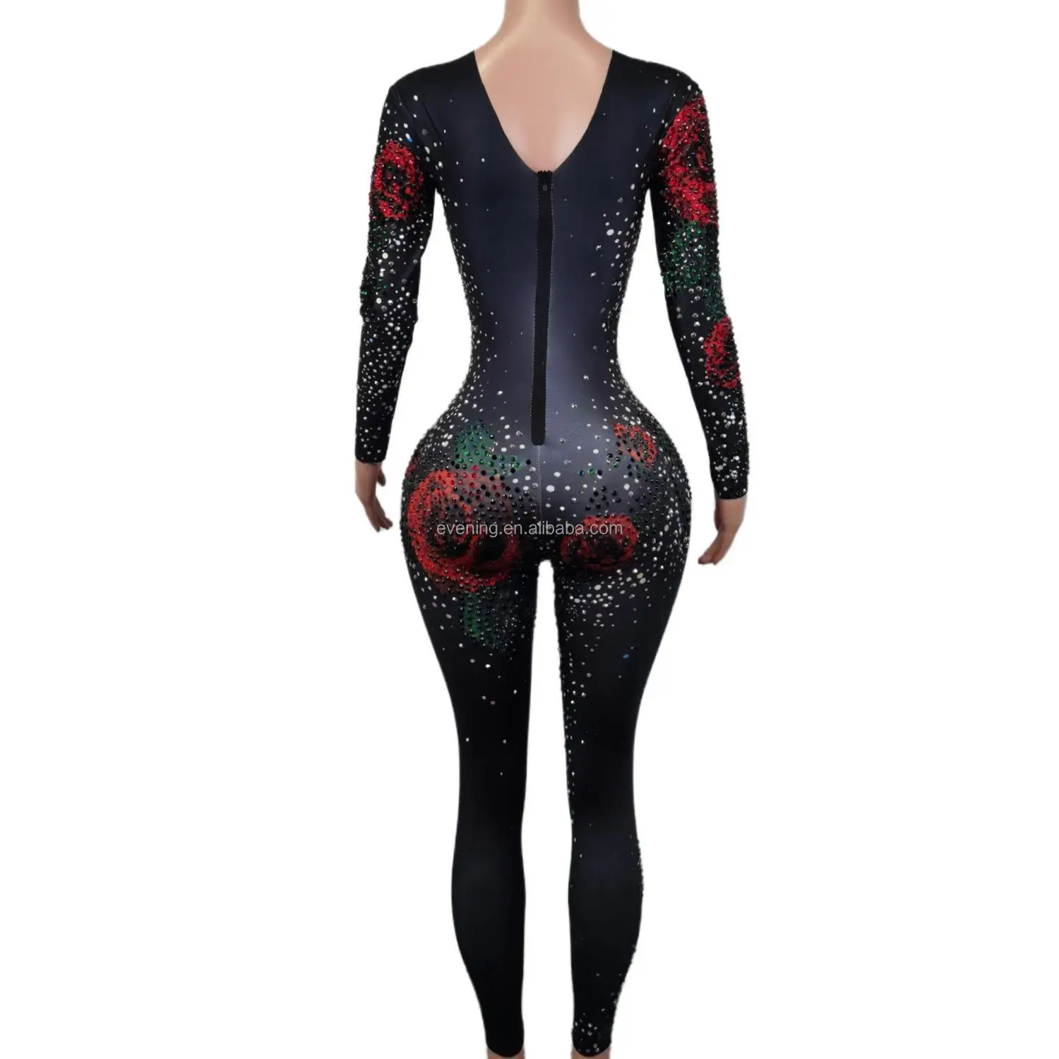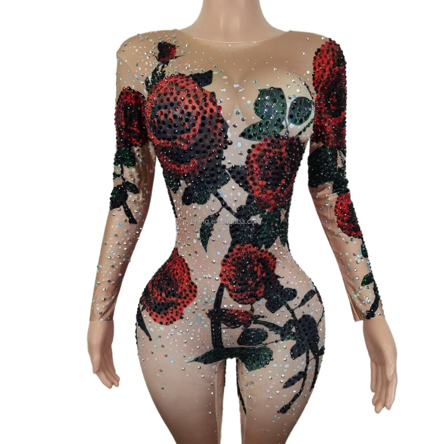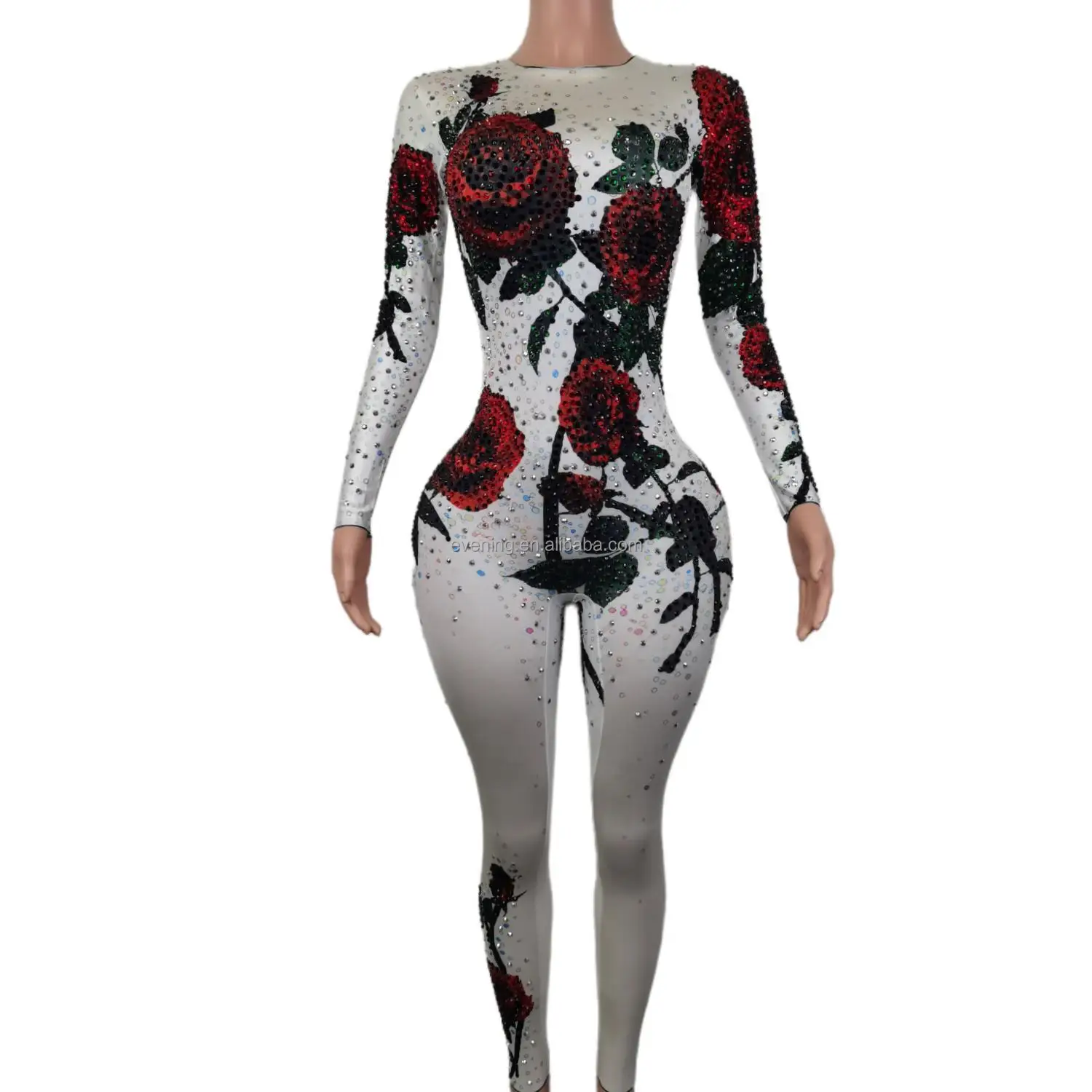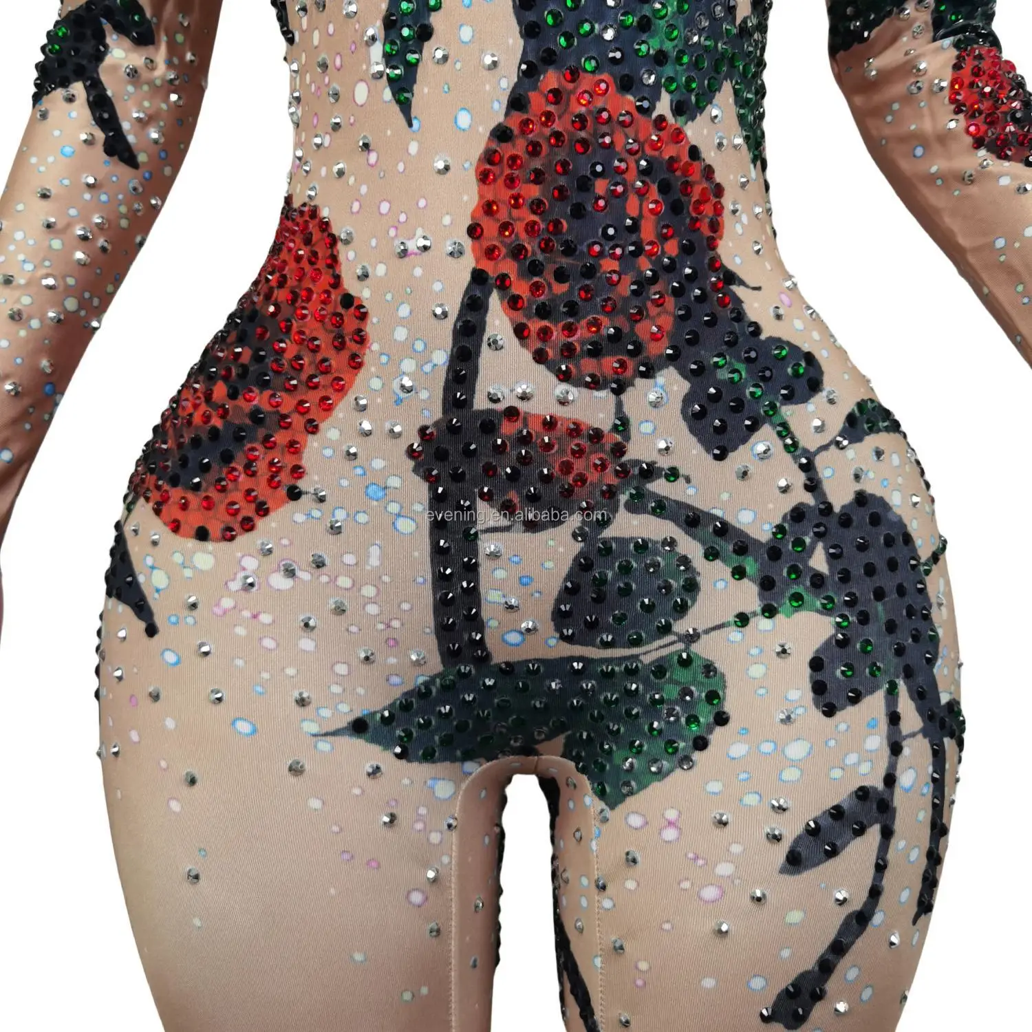 Fashion Sexy Flower Rhinestone Bodysuits Slim Fit Stage Dancer Leotard Night Club Ladies Rompers Women Party One Piece Jumpsuit