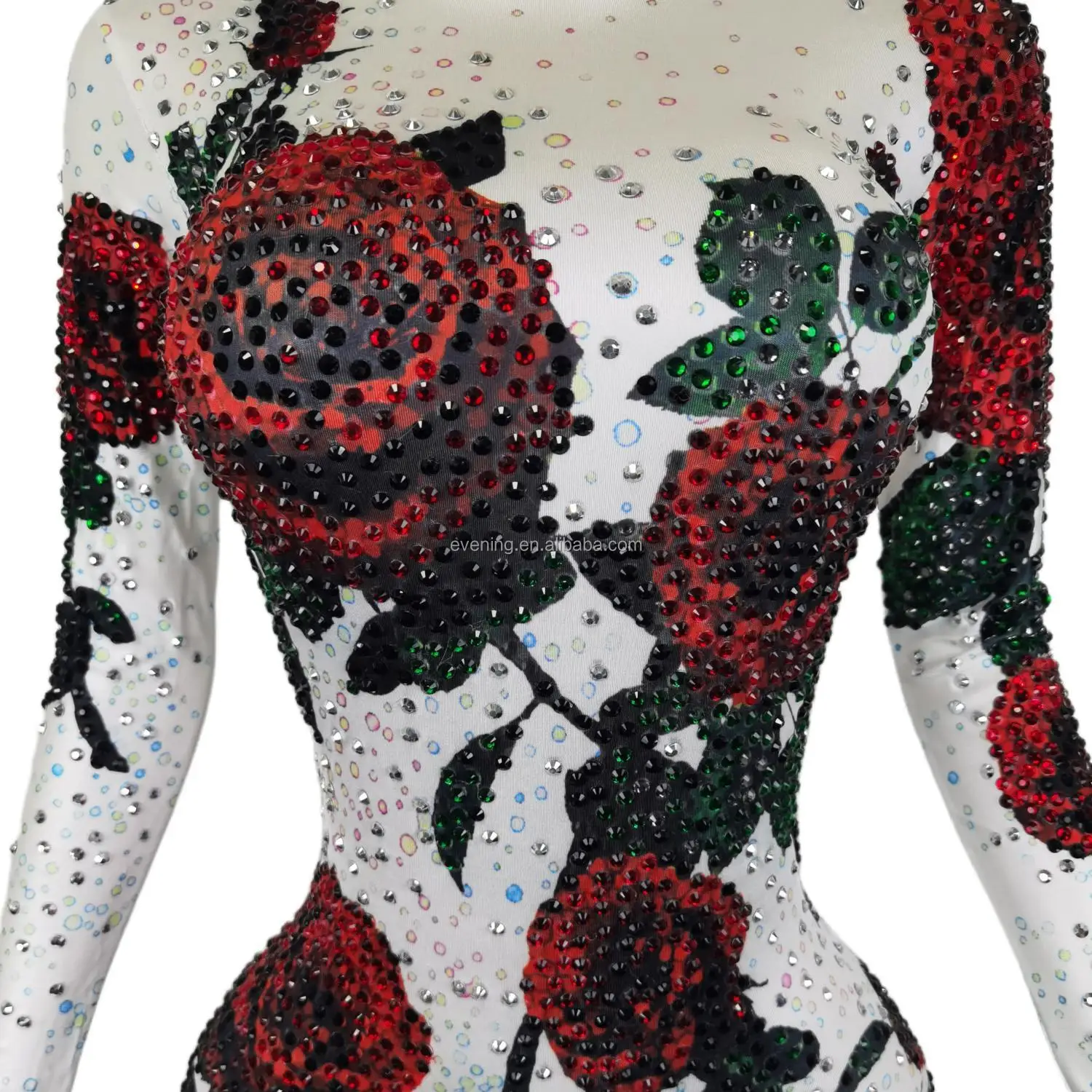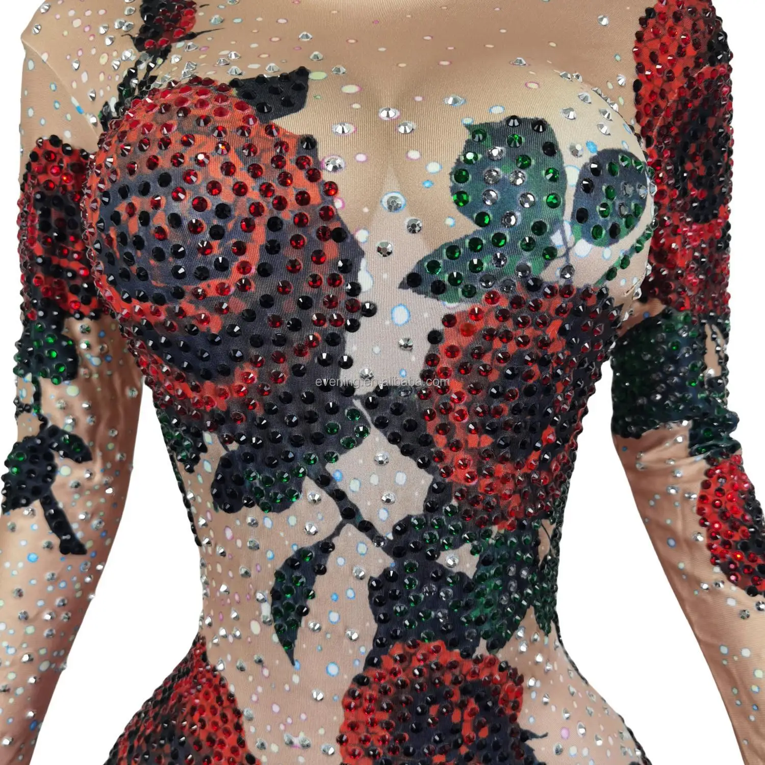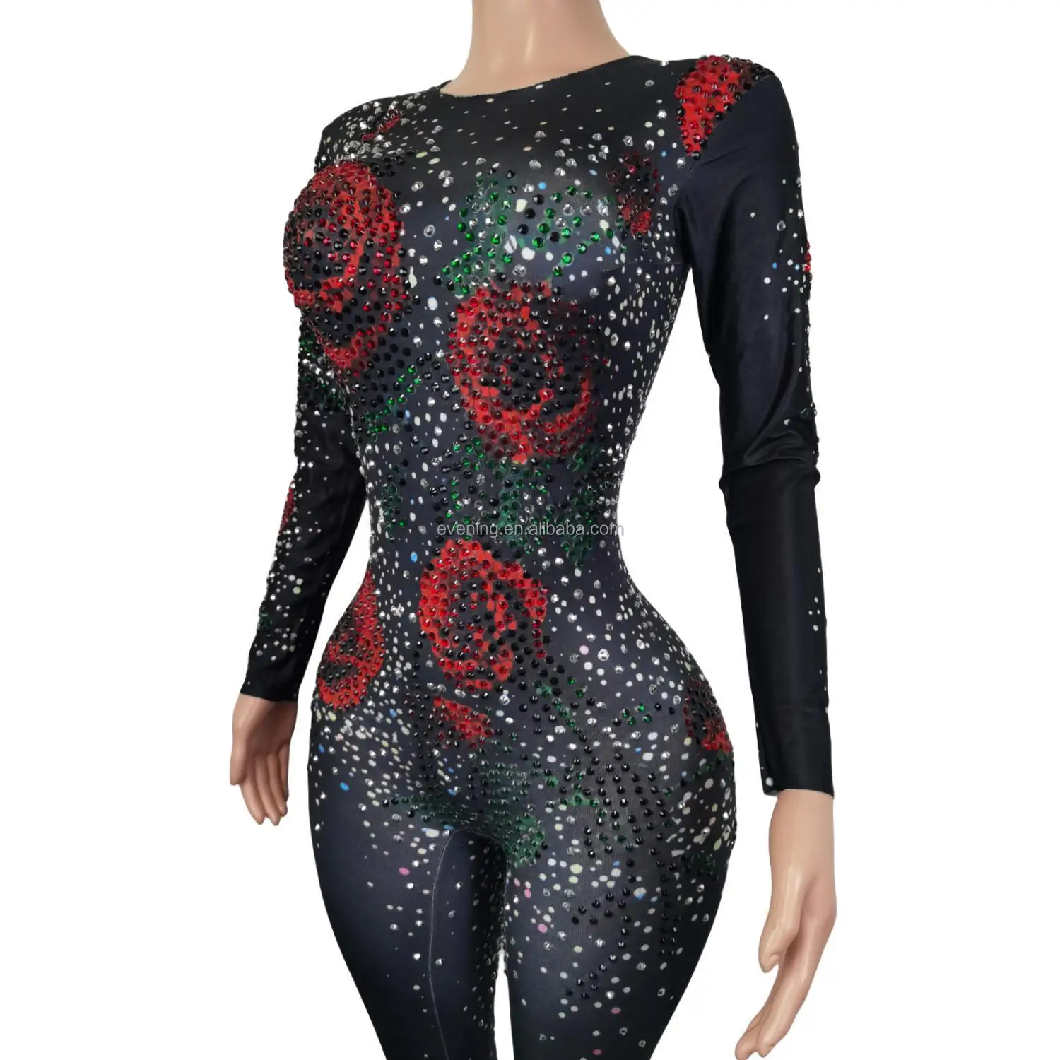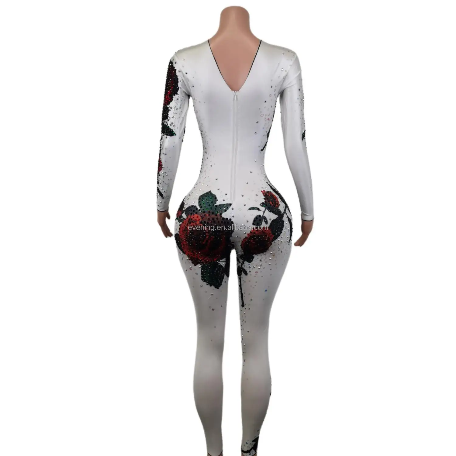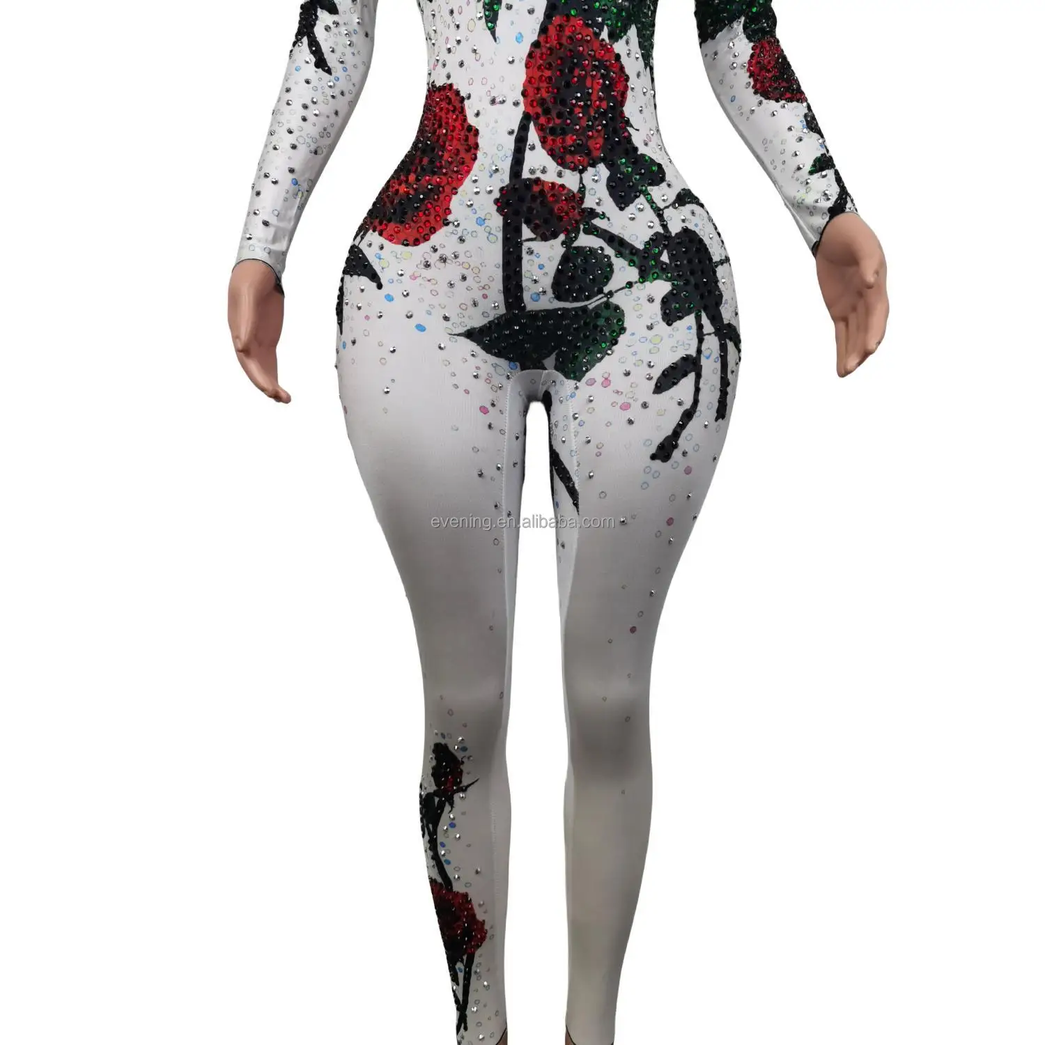 Fashion Sexy Flower Rhinestone Bodysuits Slim Fit Stage Dancer Leotard Night Club Ladies Rompers Women Party One Piece Jumpsuit